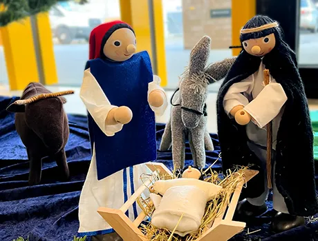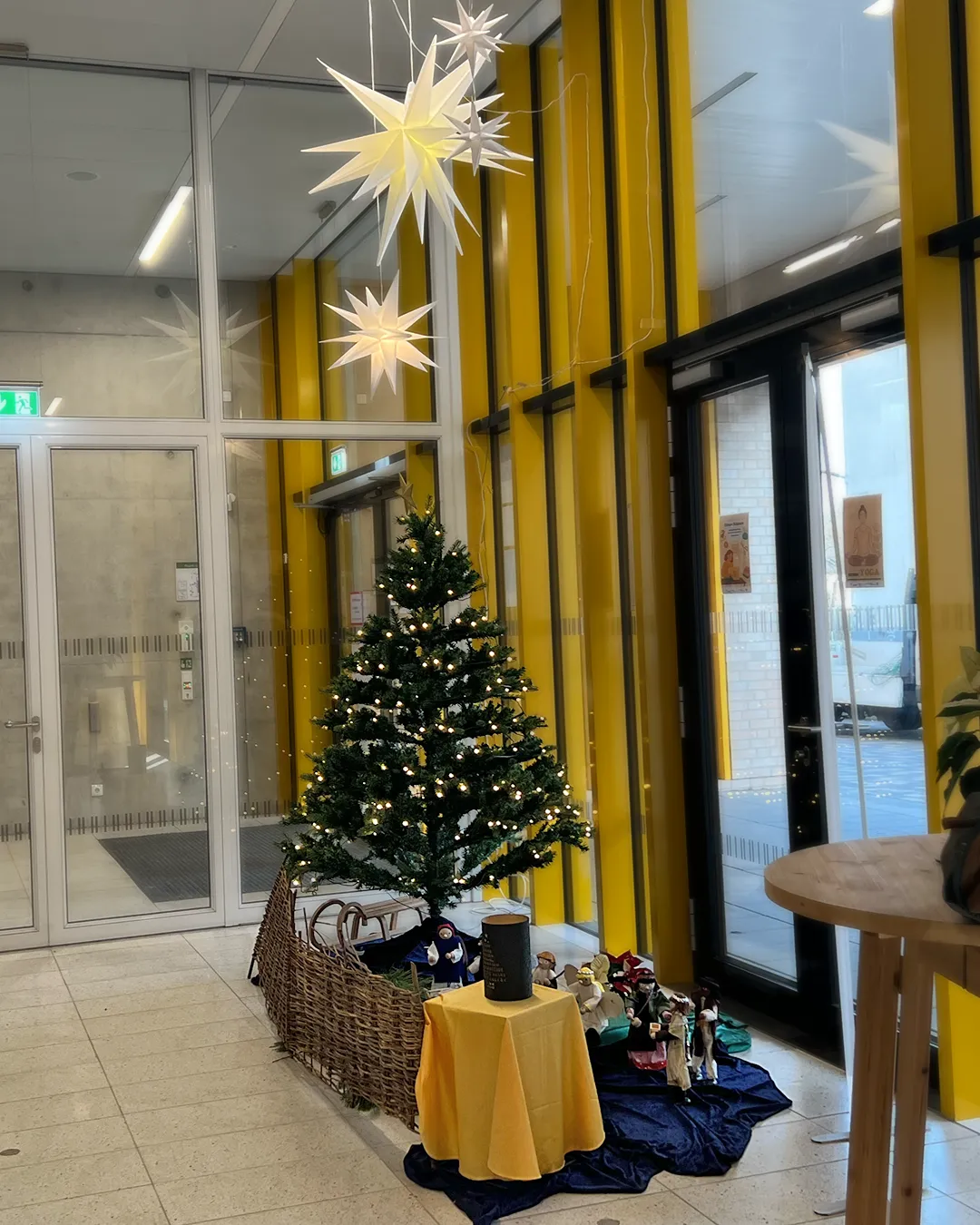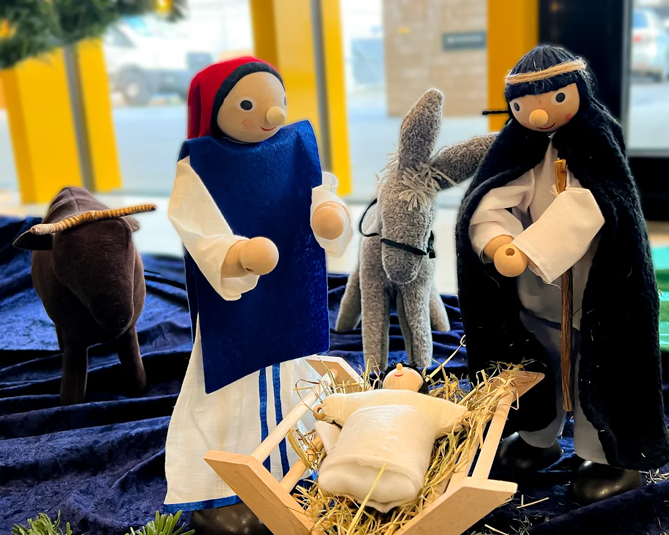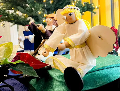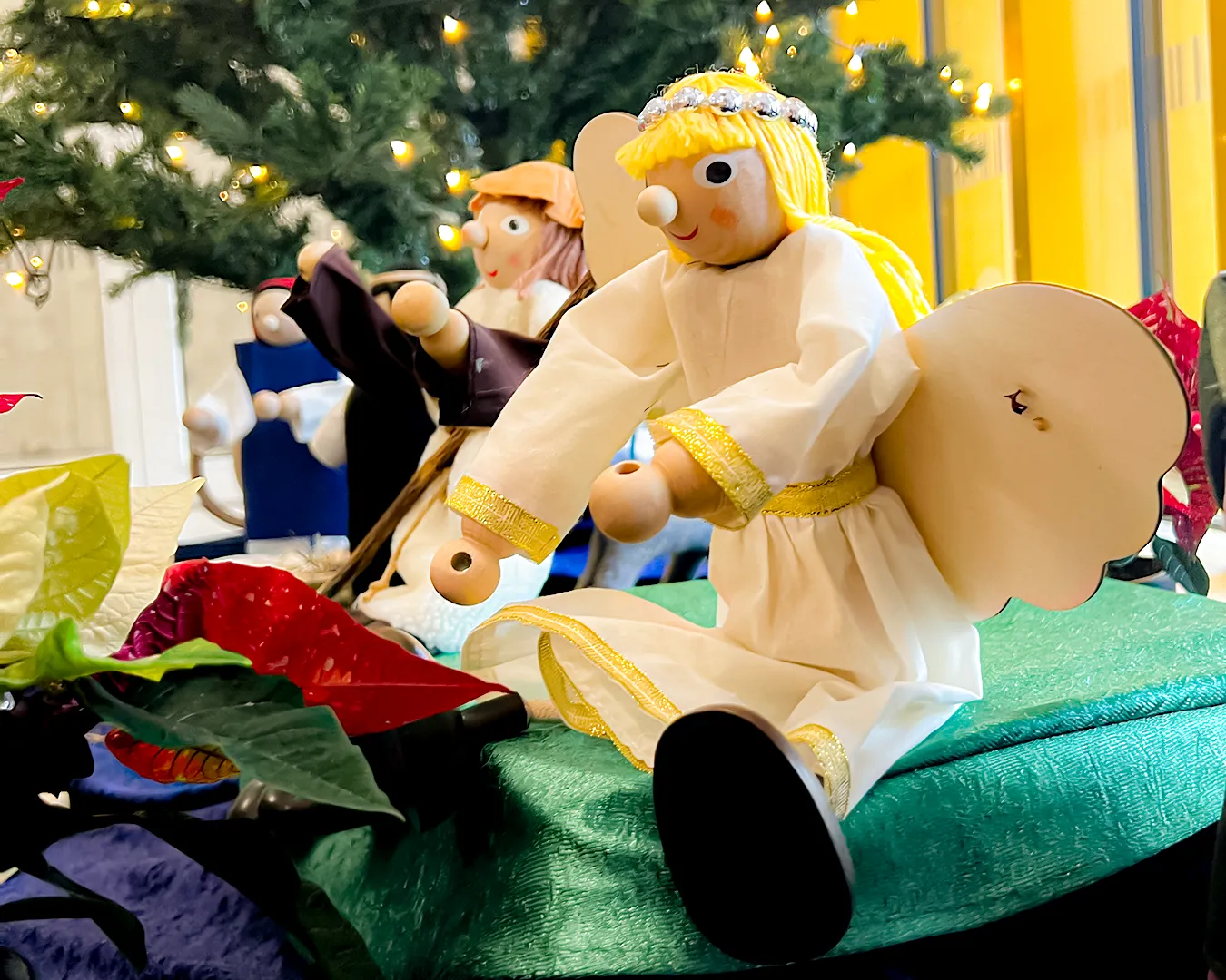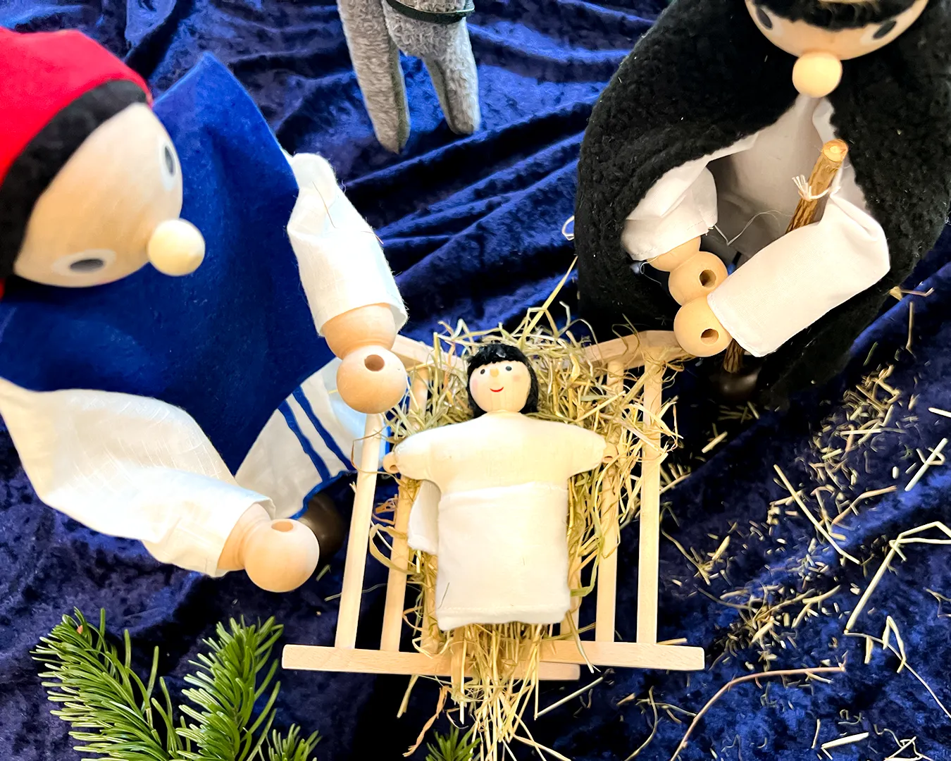 Ochs und Esel sind bereits da, ein Engel scheint ein Gloria anstimmen zu wollen, Maria und Josef stehen neben der Krippe mit dem Christuskind🐑, das - wie schon das Lied besagt - auf Heu und auf Stroh gebettet ist.