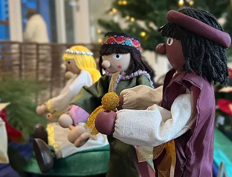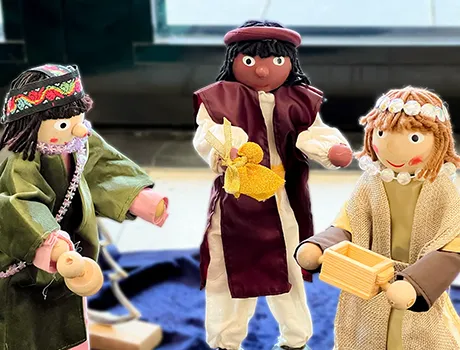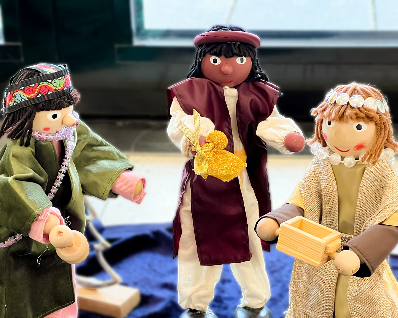 Die Drei Weisen aus dem Morgenland sind offenbar gerade erst angekommen und bringen ihre Gaben dar. Daneben steht ein stattlicher Weihnachtsbaum mit leuchtenden Lichtern und über allem glänzen die Sterne...