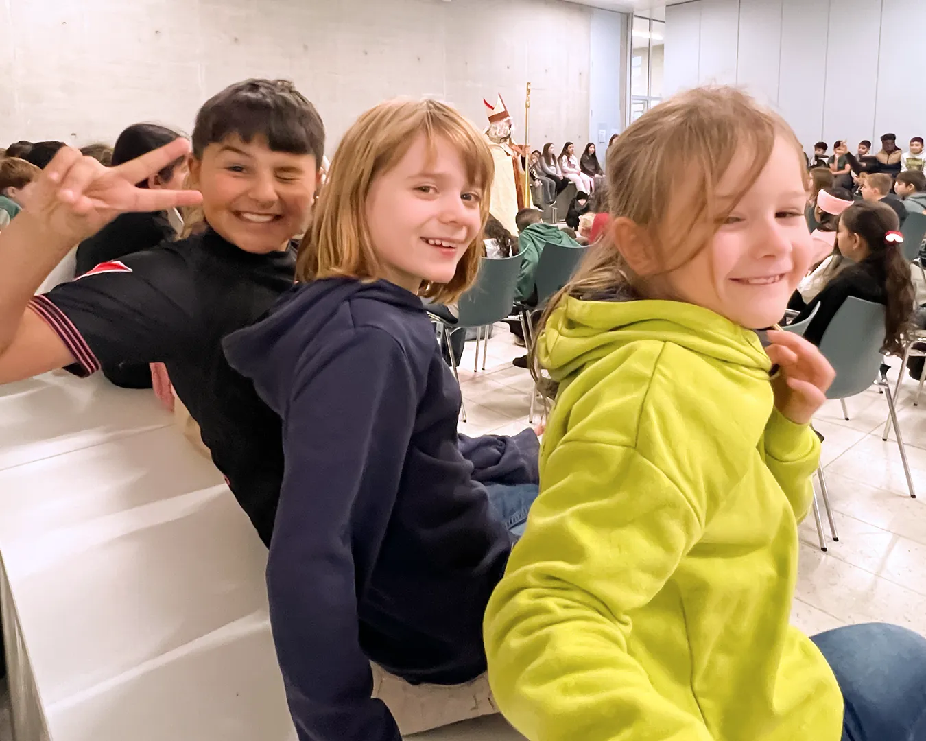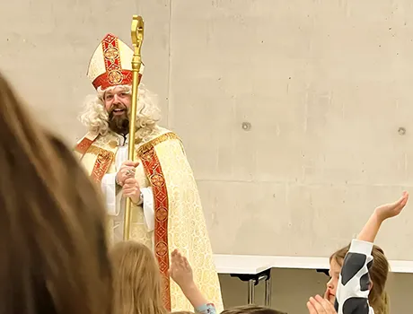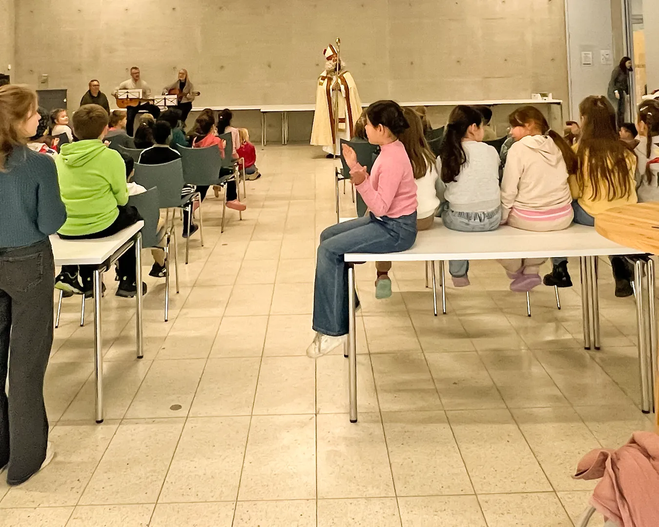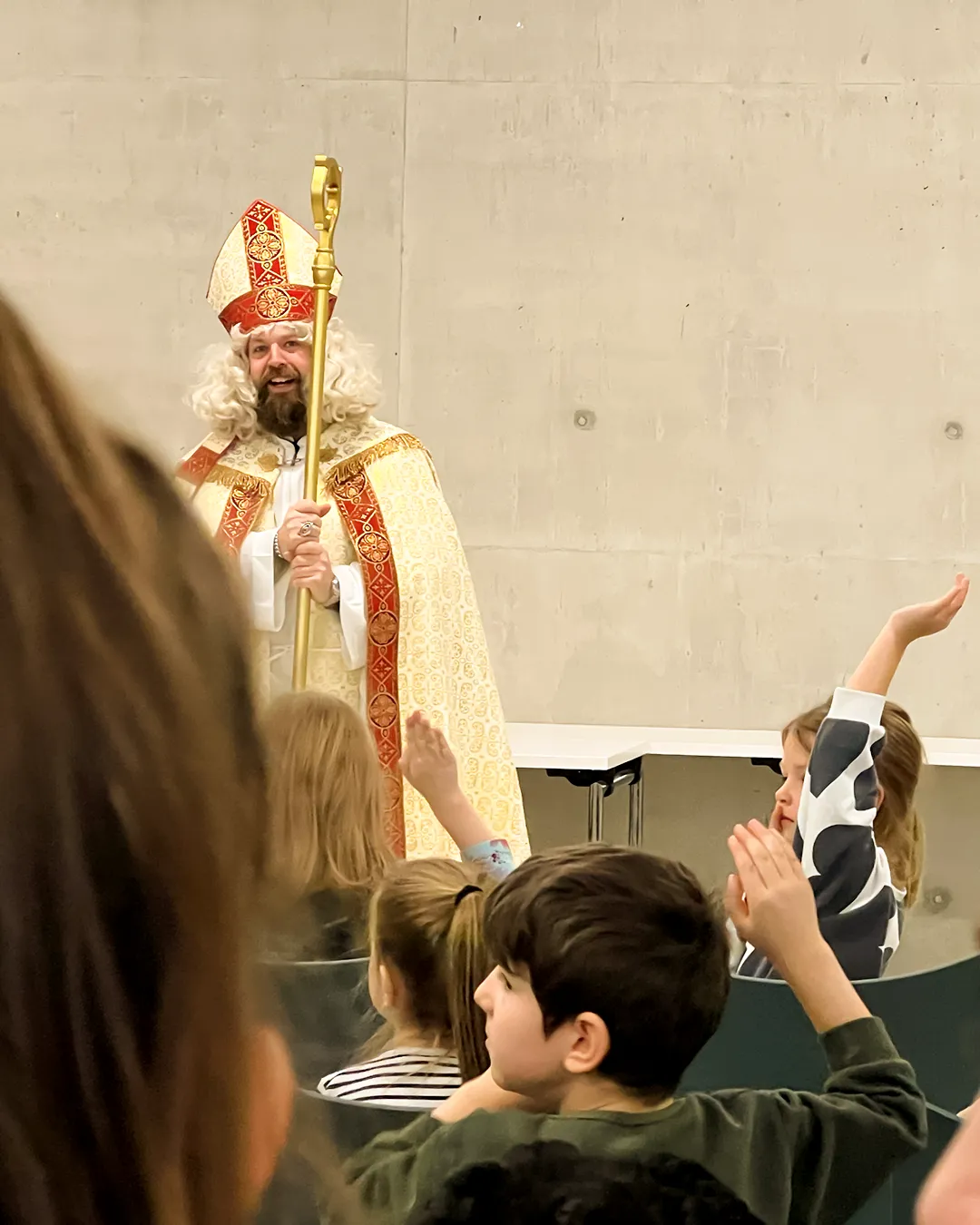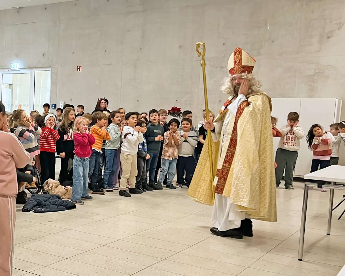 Besonders toll fanden die Schülerinnen und Schüler, dass er Nikolaus nicht nur vorne stand und erzählte, sondern auch durch die Reihen ging, so dass sein reichlich besticktes Gewand und der goldene Bischofsstab auch von Nahem bewundert werden konnten.
