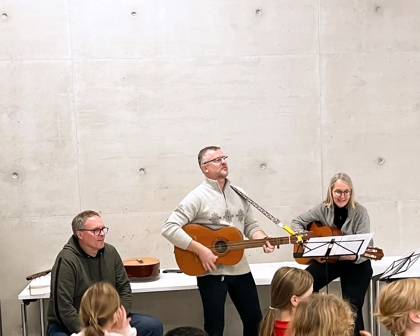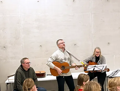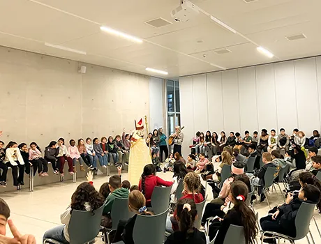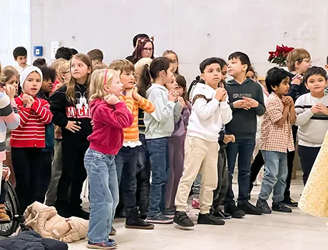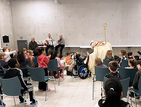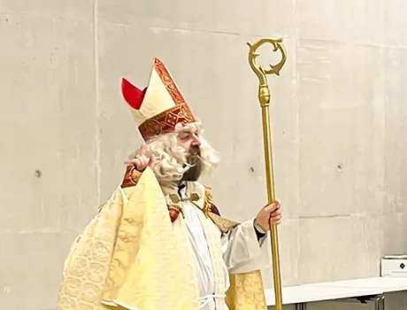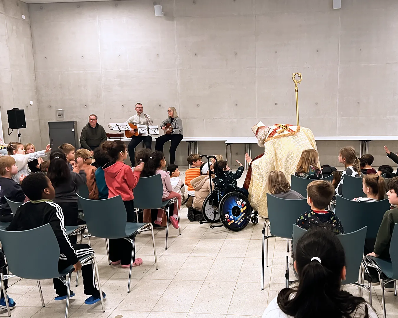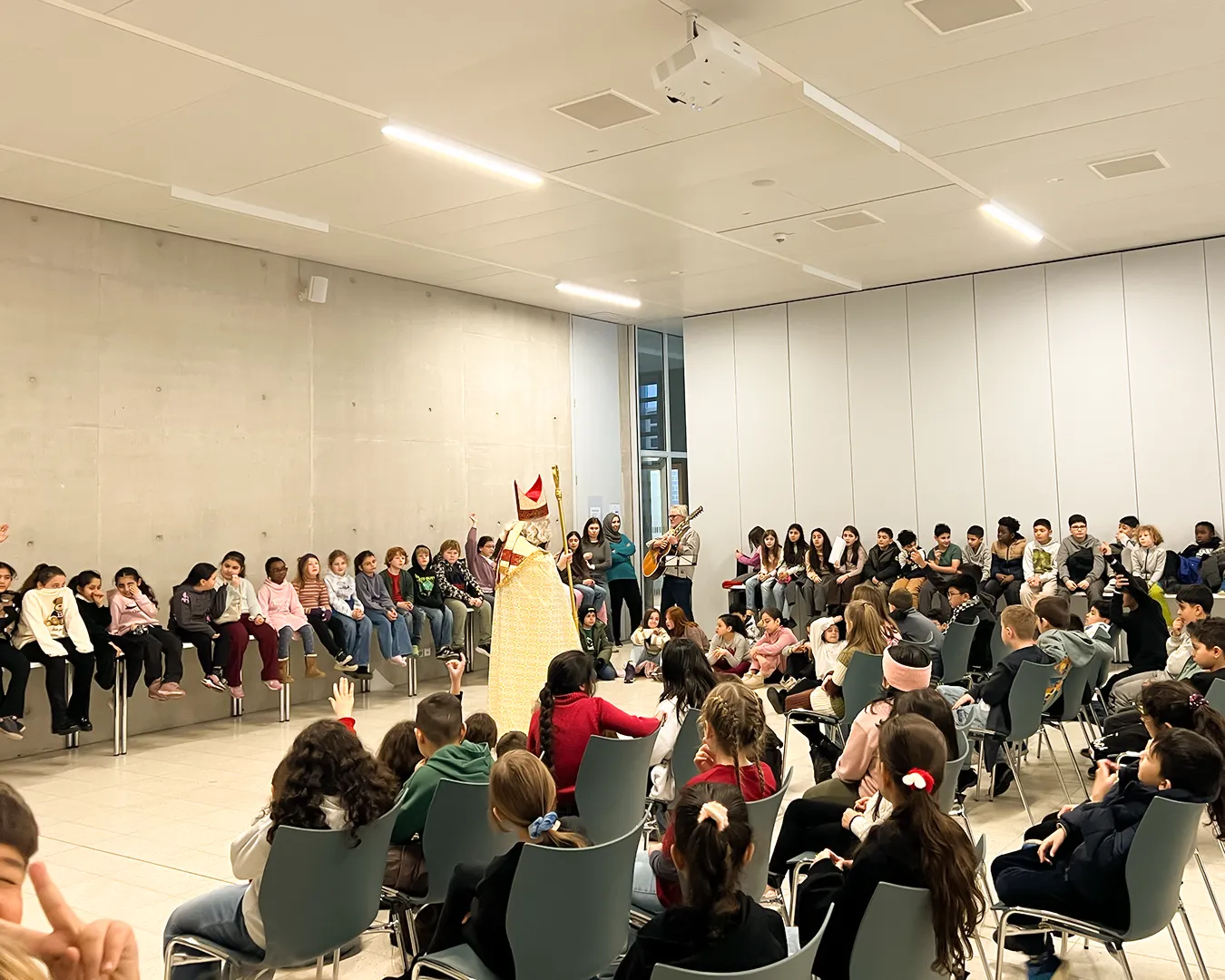 Besonders toll fanden die Schülerinnen und Schüler, dass er Nikolaus nicht nur vorne stand und erzählte, sondern auch durch die Reihen ging, so dass sein reichlich besticktes Gewand und der goldene Bischofsstab auch von Nahem bewundert werden konnten.