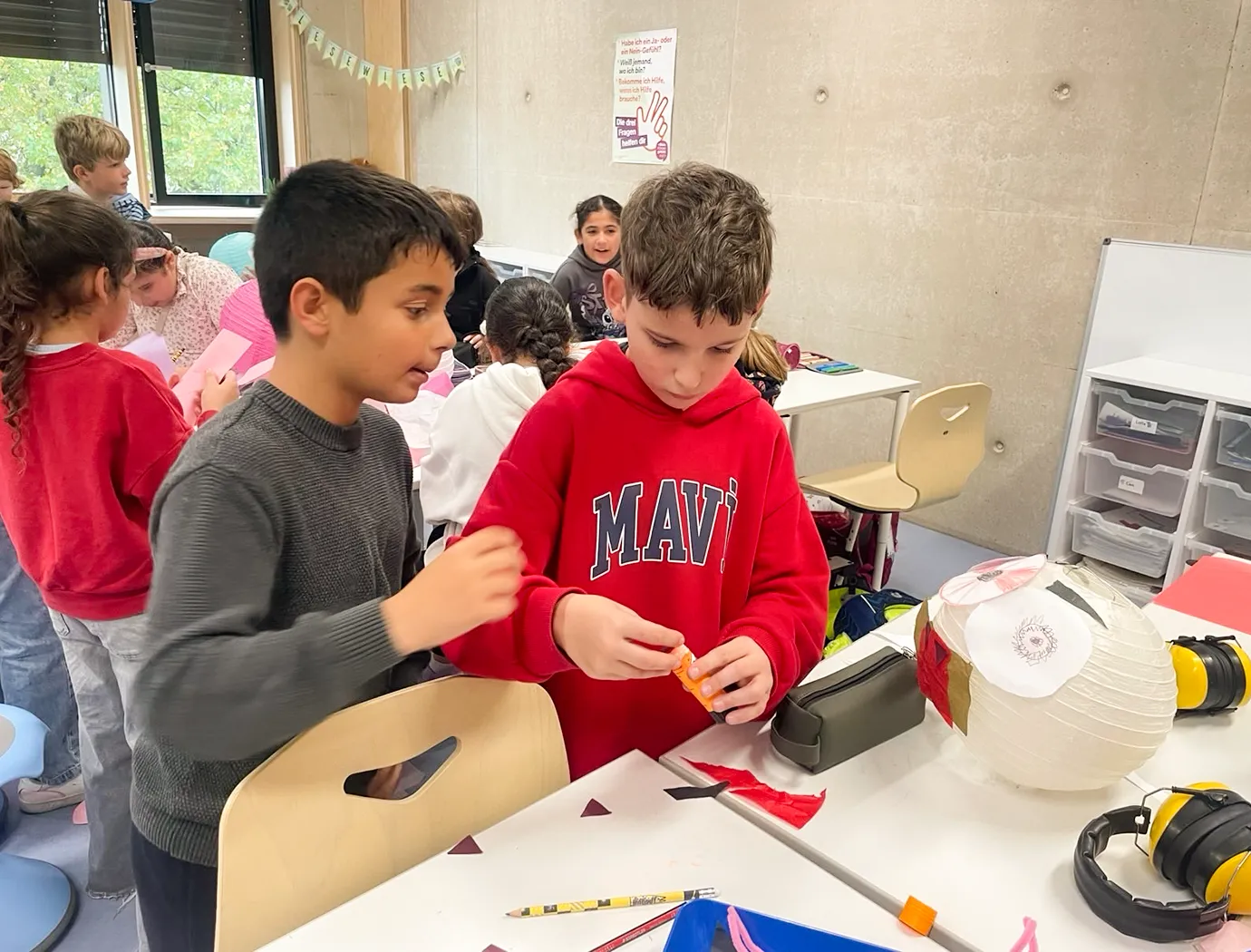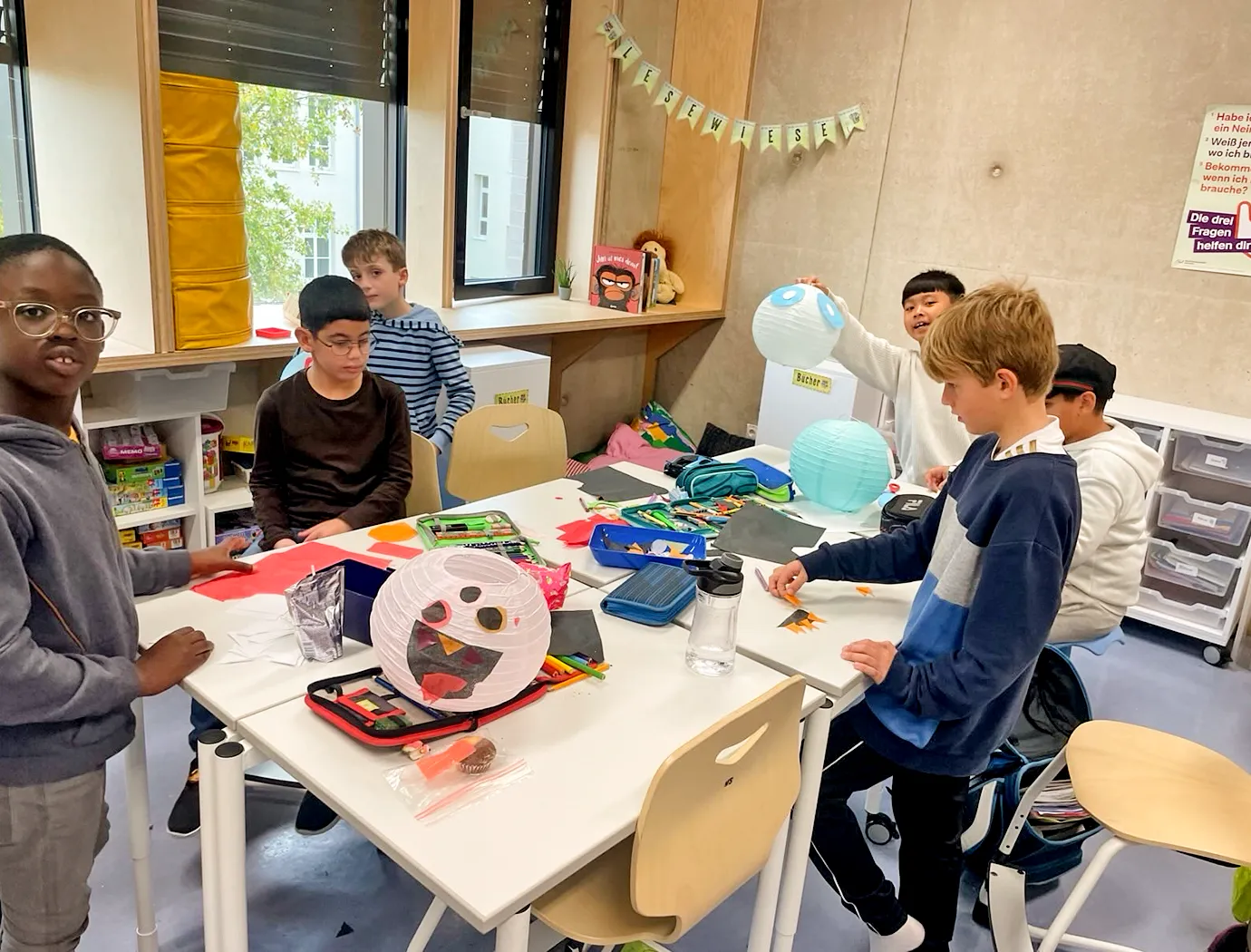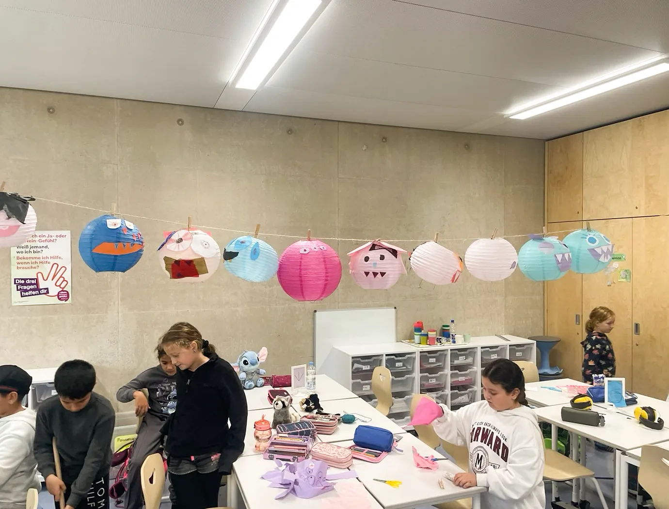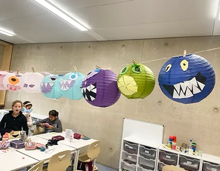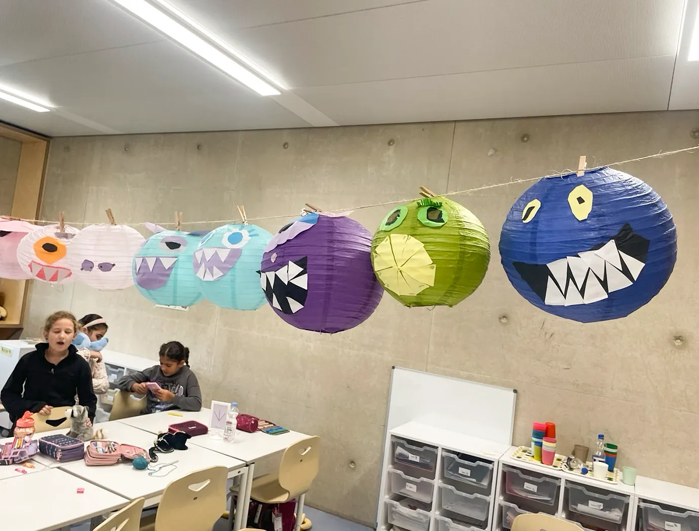 Noch hängt die Deko in der Klasse 3a, aber bald wird sie in der Aula für die richtige Stimmung sorgen – bei der großen Halloweenparty am 7. November!