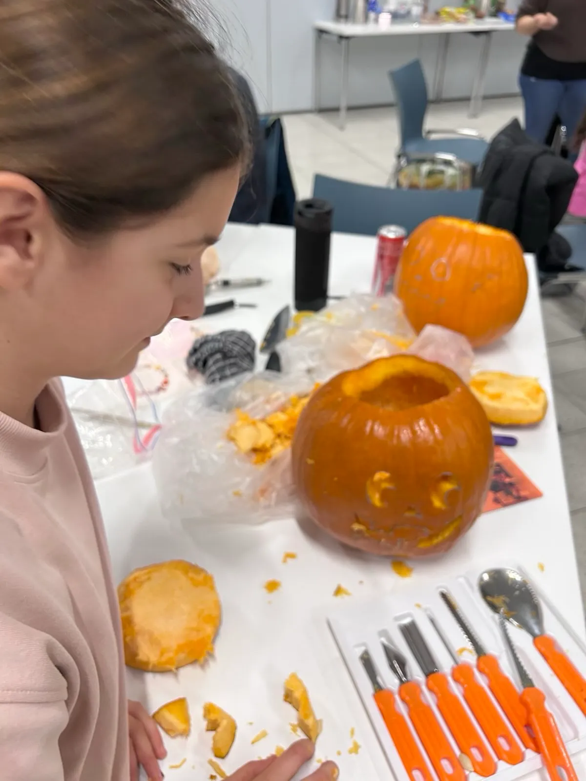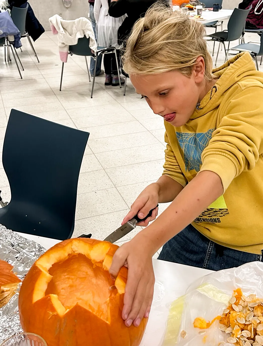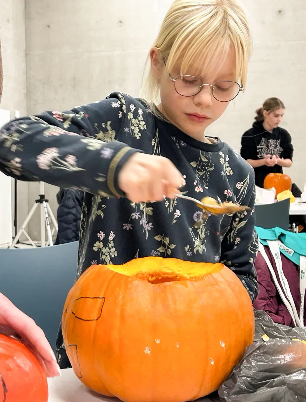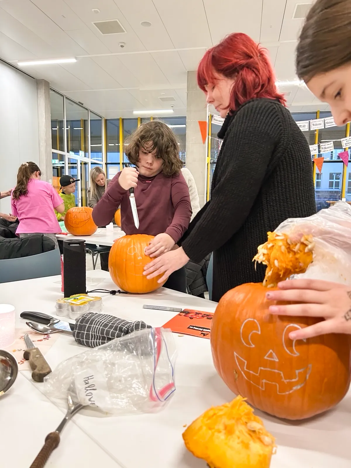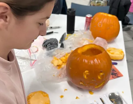 Auf langen Tischen wurden große, orangefarbene Kugeln platziert – und schon nach kurzer Zeit war überall konzentriertes Kratzen, und Schnitzen zu hören. Mit Löffeln, Schnitzmessern und vielen Ideen entstanden Gesichter, die von freundlich bis erstaunlich grimmig reichten. Ein Kürbis trug sogar eine Zahnspange! Einige seiner Nachbar-Kürbisse hätten wohl ebenfalls gut eine Spange gebrauchen können.