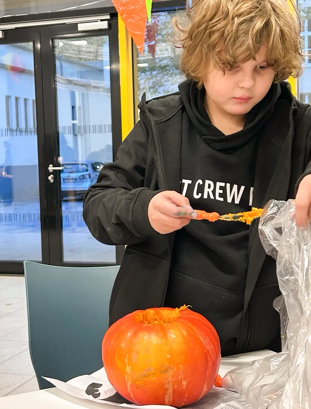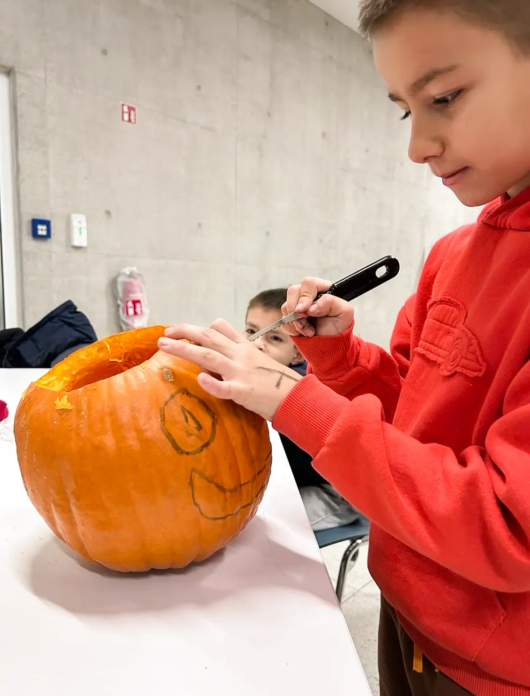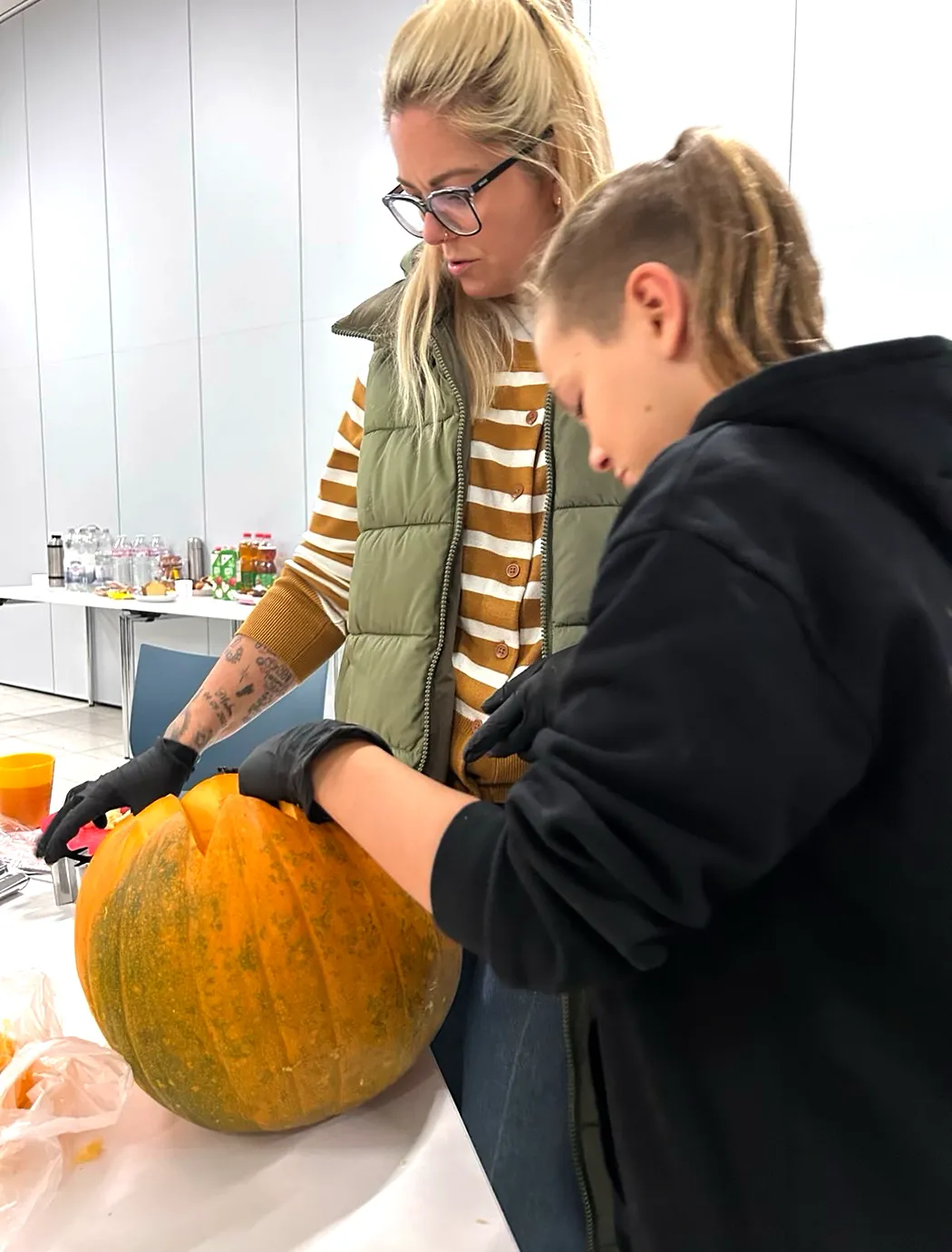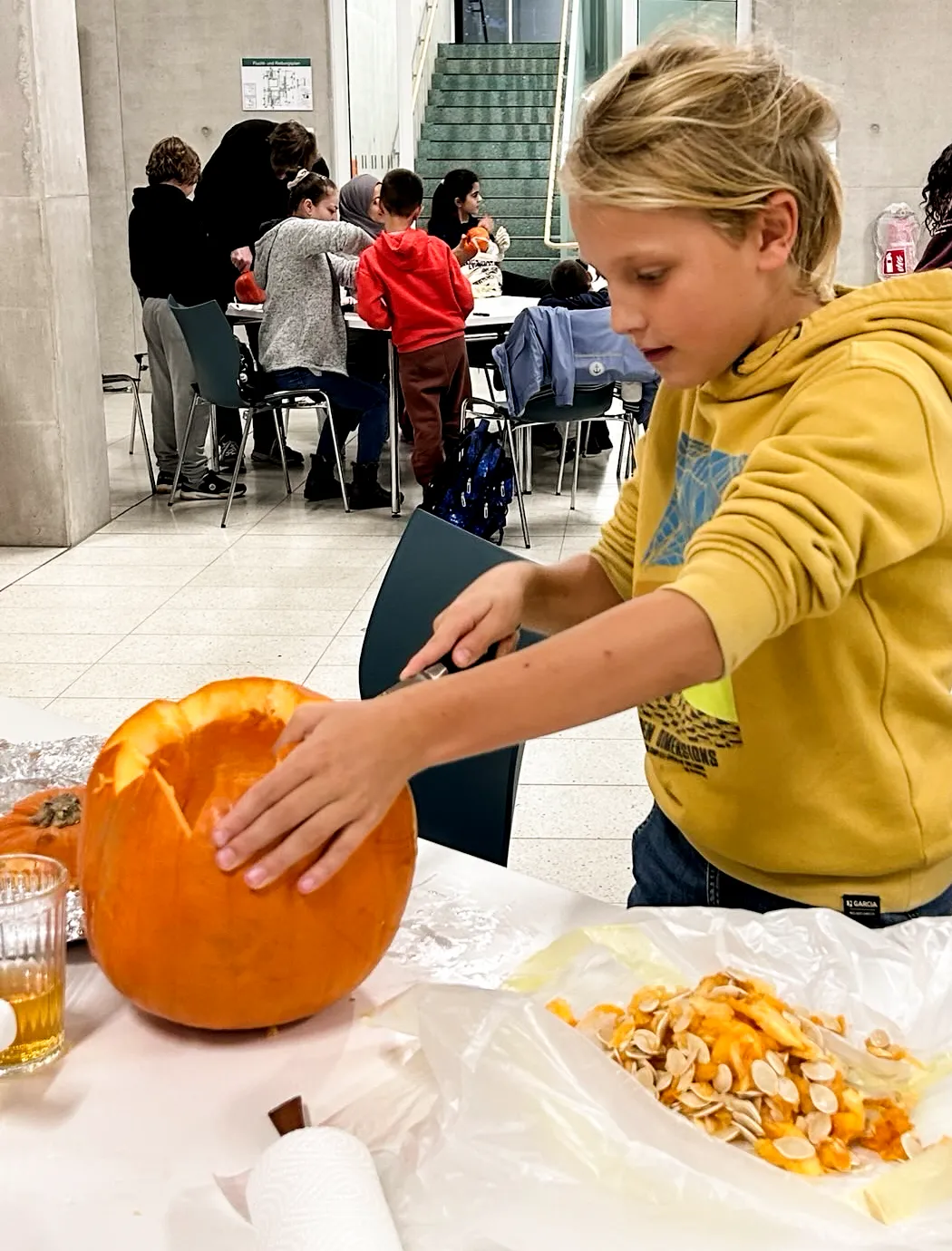 Auf langen Tischen wurden große, orangefarbene Kugeln platziert – und schon nach kurzer Zeit war überall konzentriertes Kratzen, und Schnitzen zu hören. Mit Löffeln, Schnitzmessern und vielen Ideen entstanden Gesichter, die von freundlich bis erstaunlich grimmig reichten. Ein Kürbis trug sogar eine Zahnspange! Einige seiner Nachbar-Kürbisse hätten wohl ebenfalls gut eine Spange gebrauchen können.