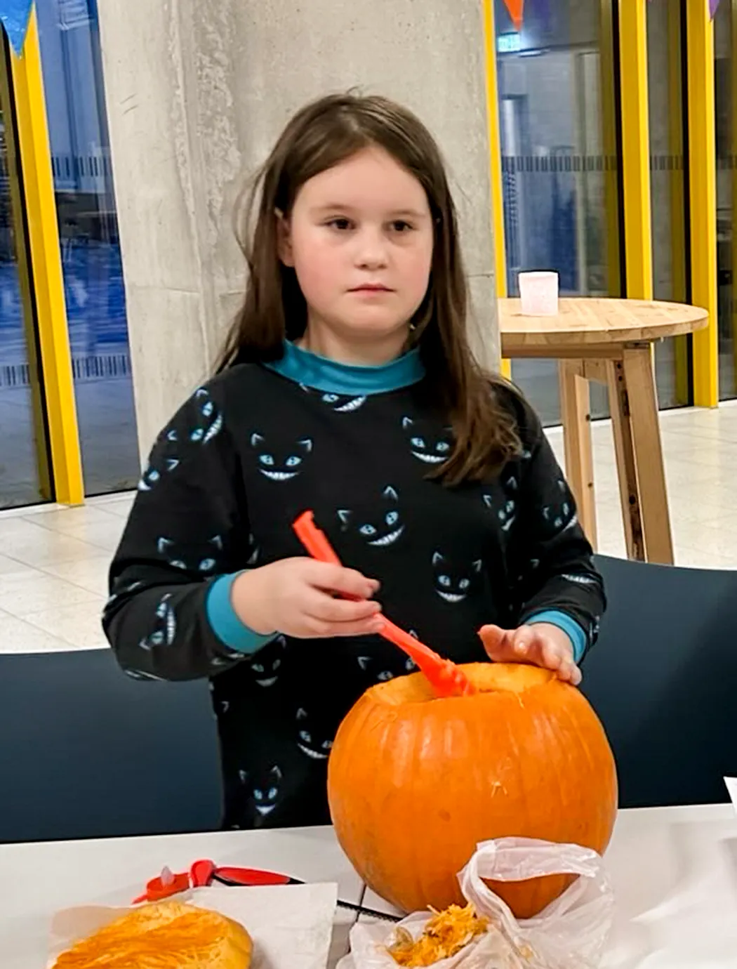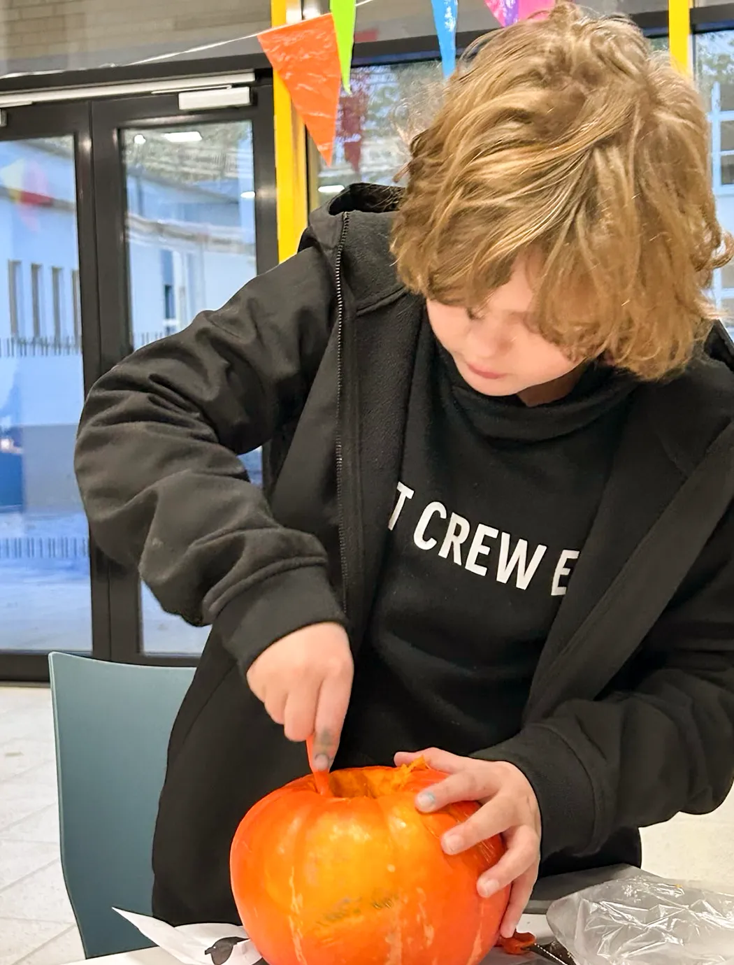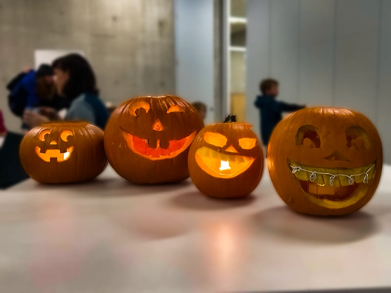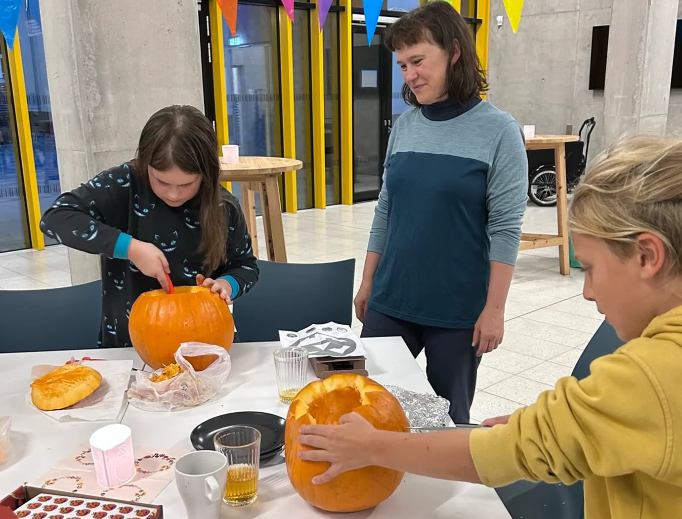Auf langen Tischen wurden große, orangefarbene Kugeln platziert – und schon nach kurzer Zeit war überall konzentriertes Kratzen, und Schnitzen zu hören. Mit Löffeln, Schnitzmessern und vielen Ideen entstanden Gesichter, die von freundlich bis erstaunlich grimmig reichten. Ein Kürbis trug sogar eine Zahnspange! Einige seiner Nachbar-Kürbisse hätten wohl ebenfalls gut eine Spange gebrauchen können.