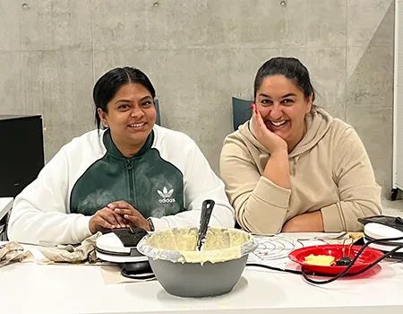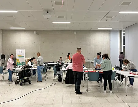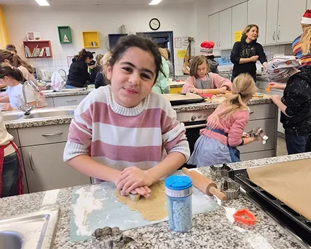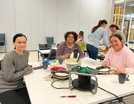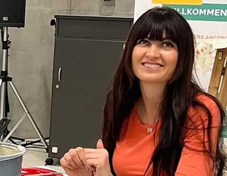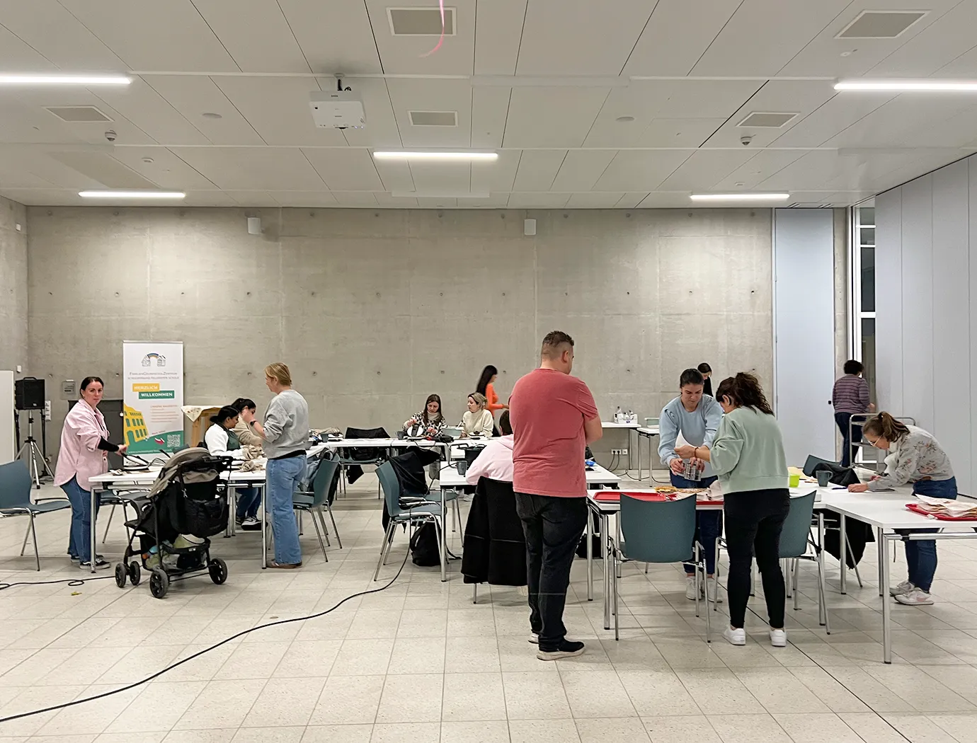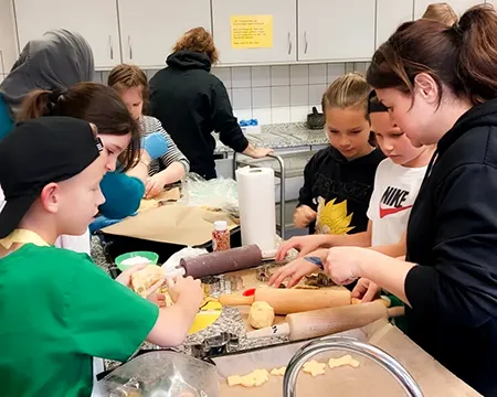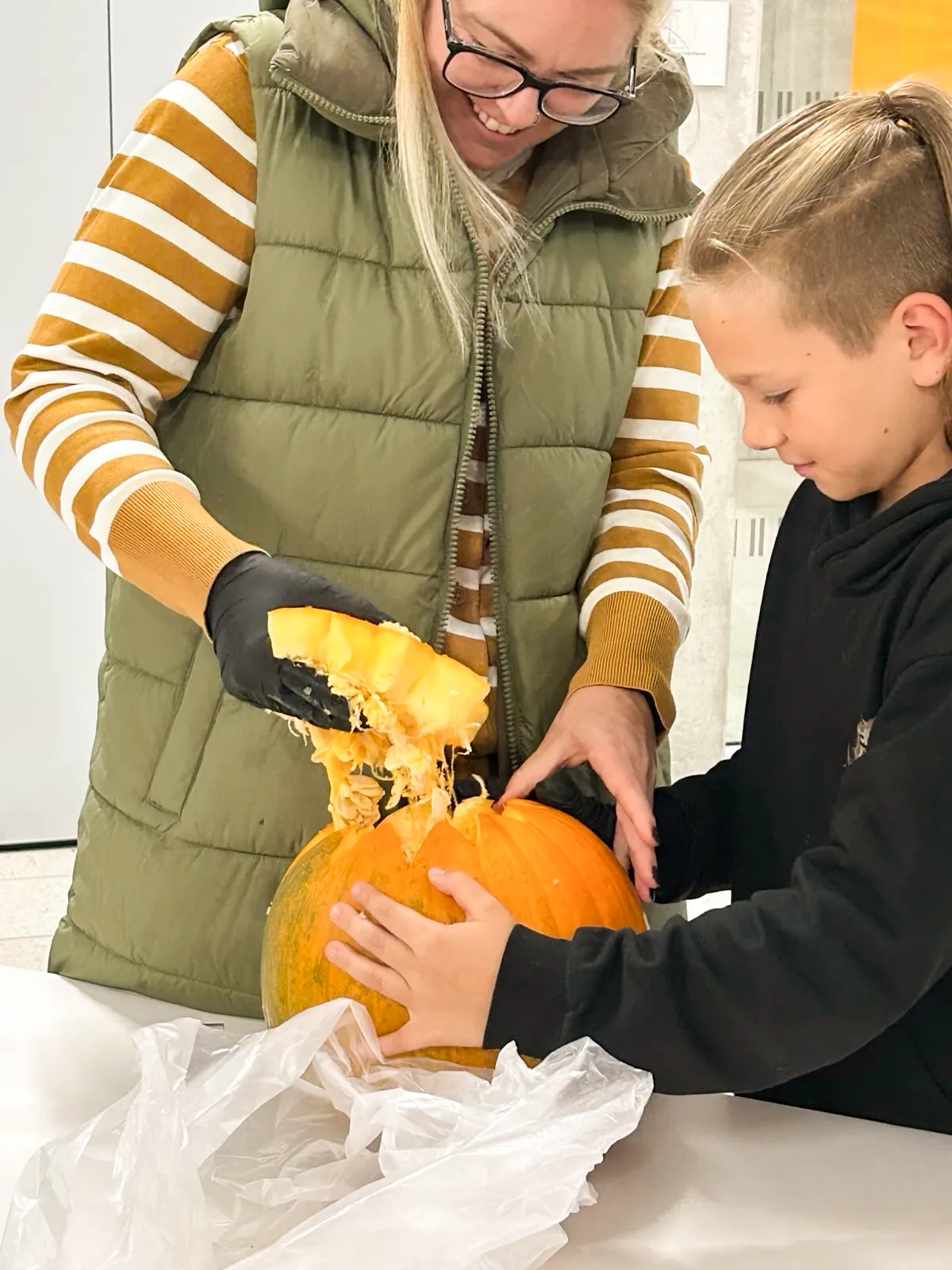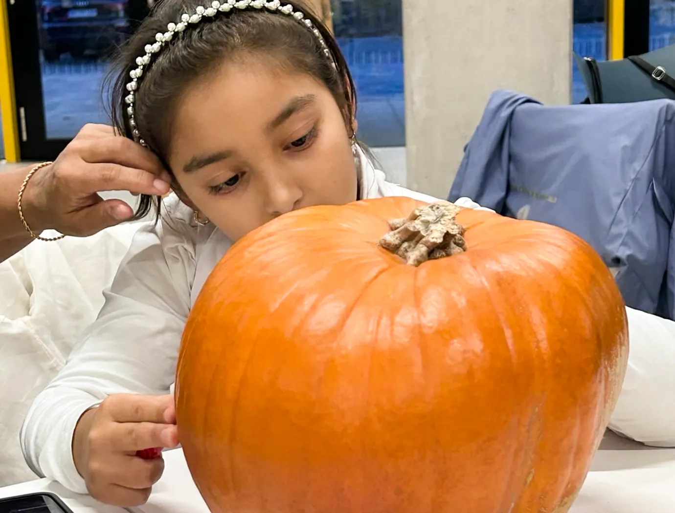 Auf langen Tischen wurden große, orangefarbene Kugeln platziert – und schon nach kurzer Zeit war überall konzentriertes Kratzen, und Schnitzen zu hören. Mit Löffeln, Schnitzmessern und vielen Ideen entstanden Gesichter, die von freundlich bis erstaunlich grimmig reichten. Ein Kürbis trug sogar eine Zahnspange! Einige seiner Nachbar-Kürbisse hätten wohl ebenfalls gut eine Spange gebrauchen können.