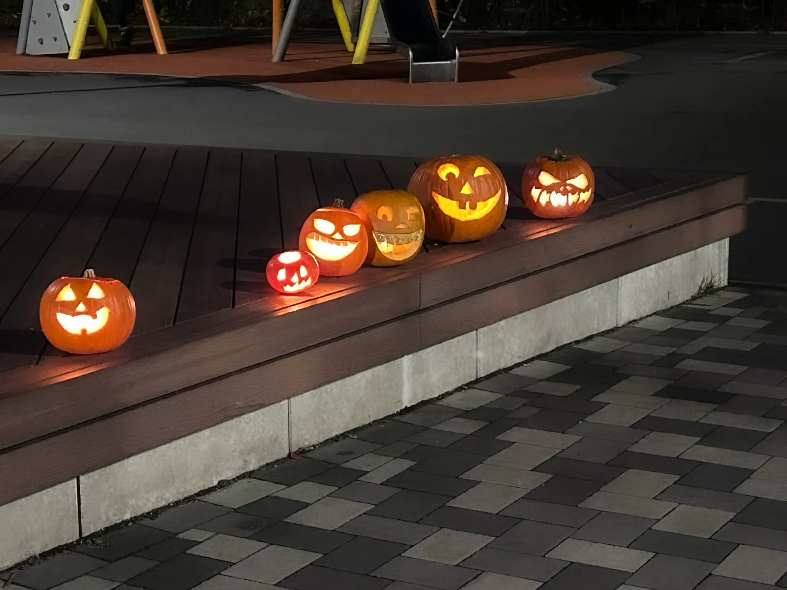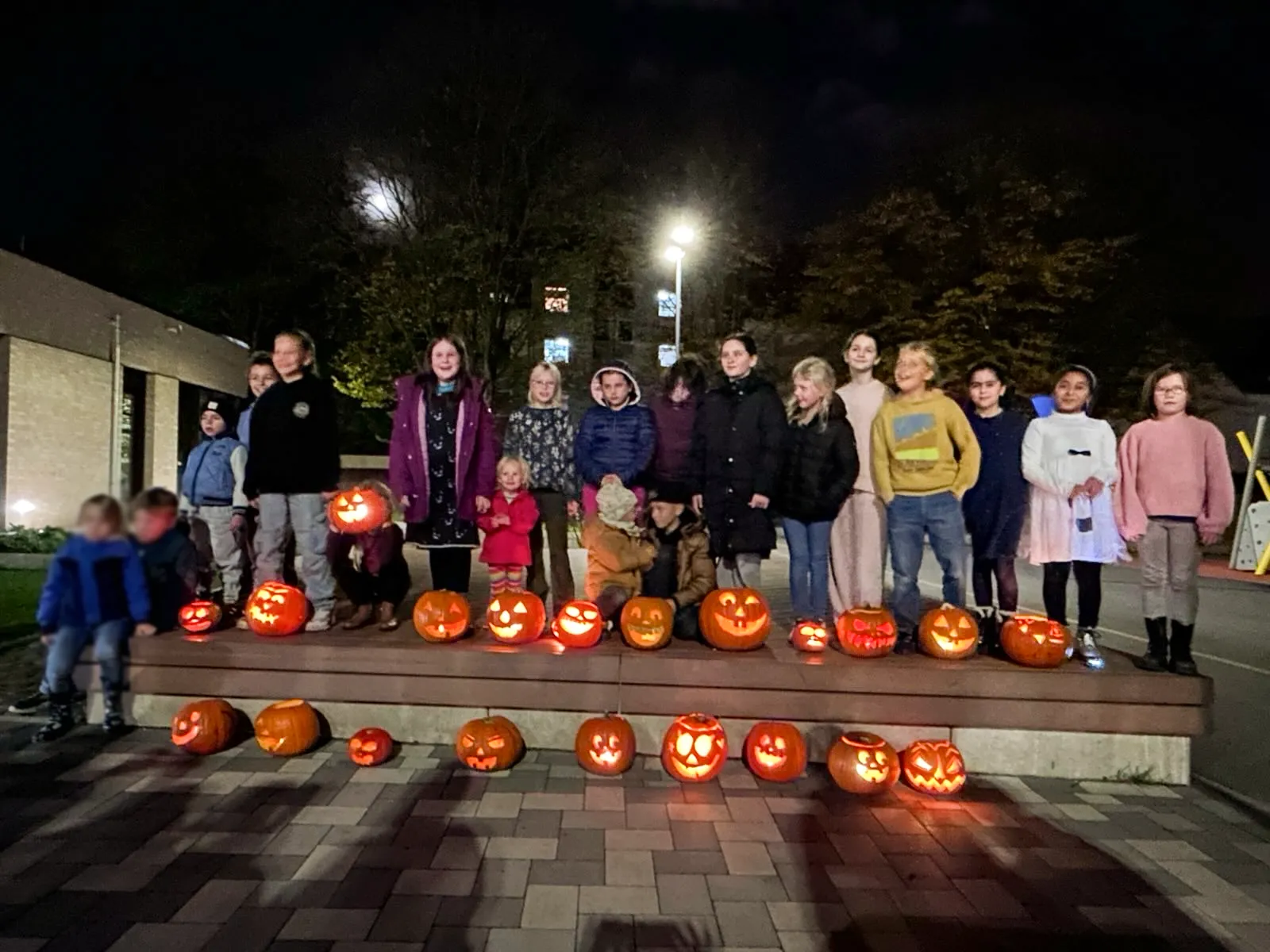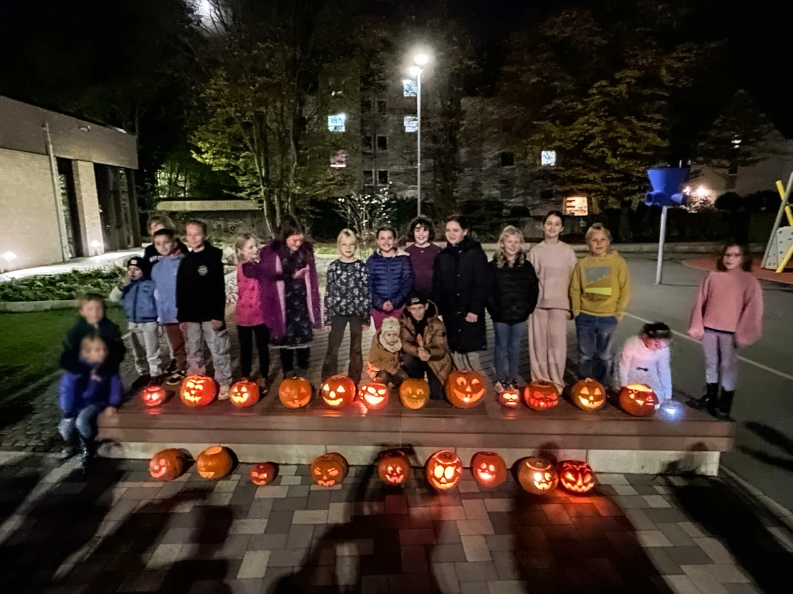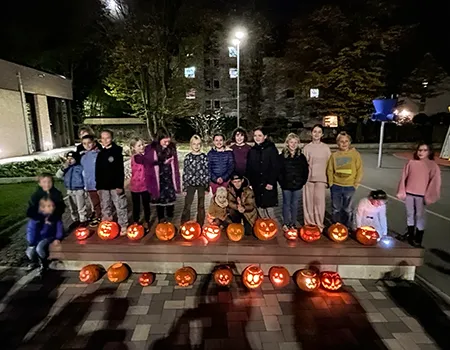 Zwischen Sägemehl und Kürbiskernen blieb auch Zeit für ein Stück Kuchen und eine Tasse Kaffee. Als draußen langsam die Dunkelheit einsetzte, leuchteten die fertigen Kürbisse zur Probe auf dem Schulhof gemeinsam auf.