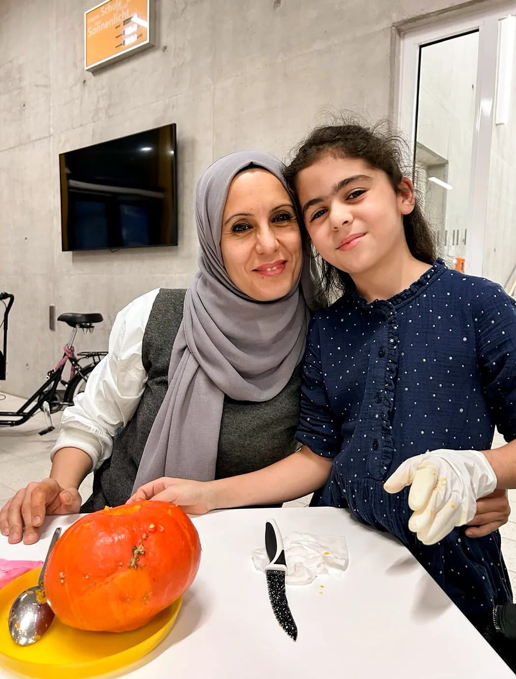 Kinder und Eltern der Klasse 4f trafen sich am Nachmittag zum Kürbisschnitzen.