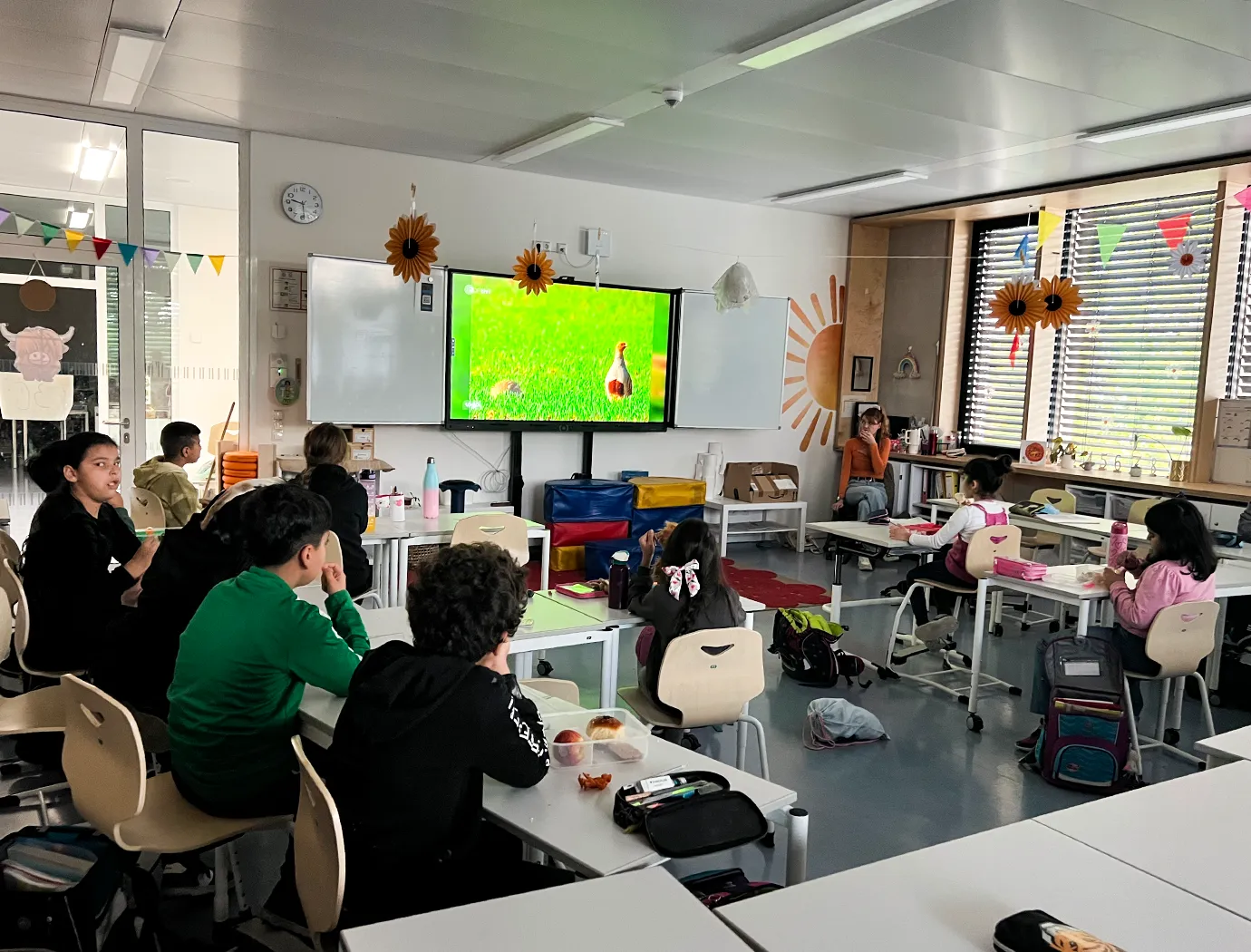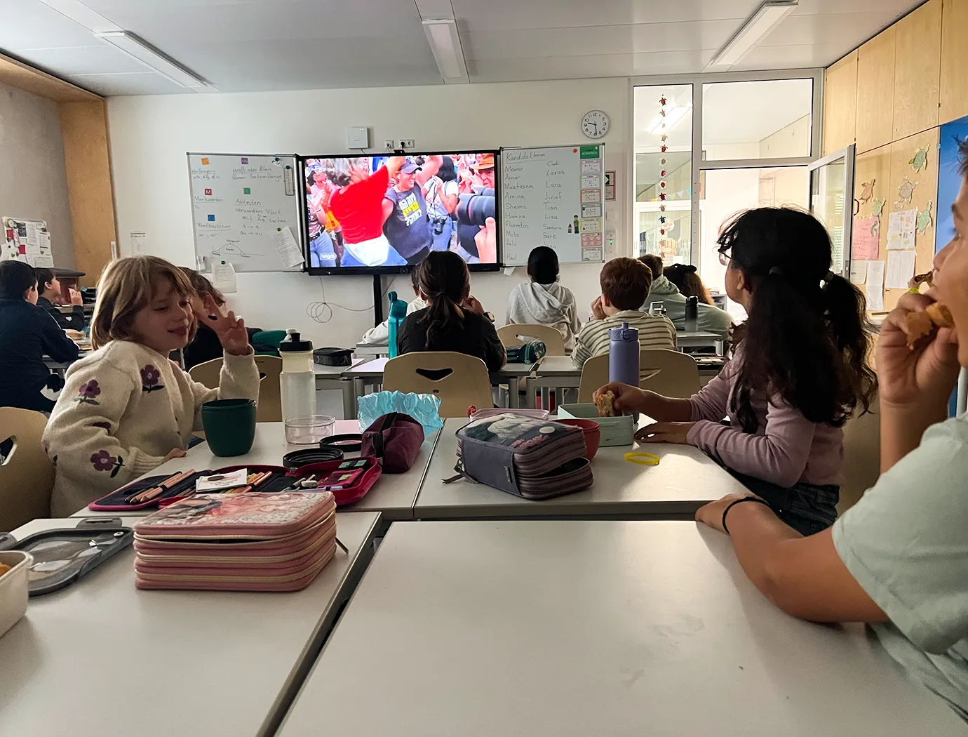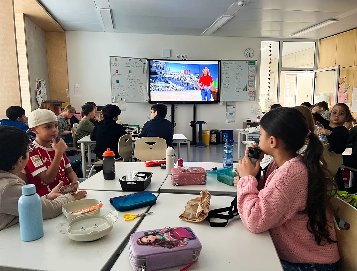 Kinder der 3. Klassen sitzen in der Frühstückspause in ihrer Klasse, frühstücken und gucken dabei die Nachrichtensendung "Logo" für Kinder.