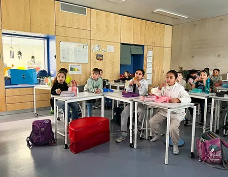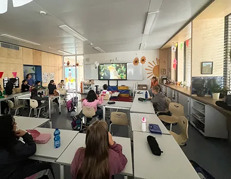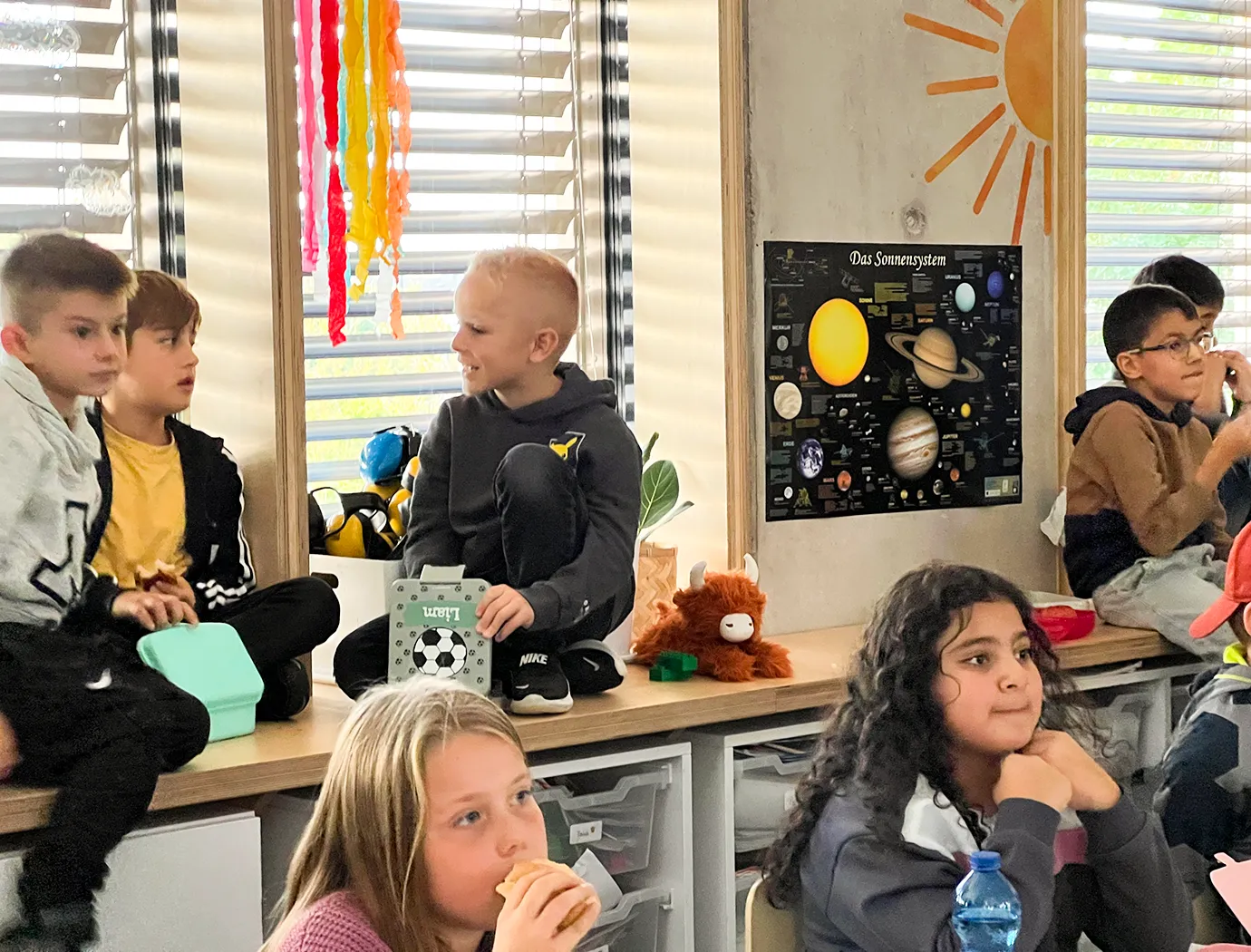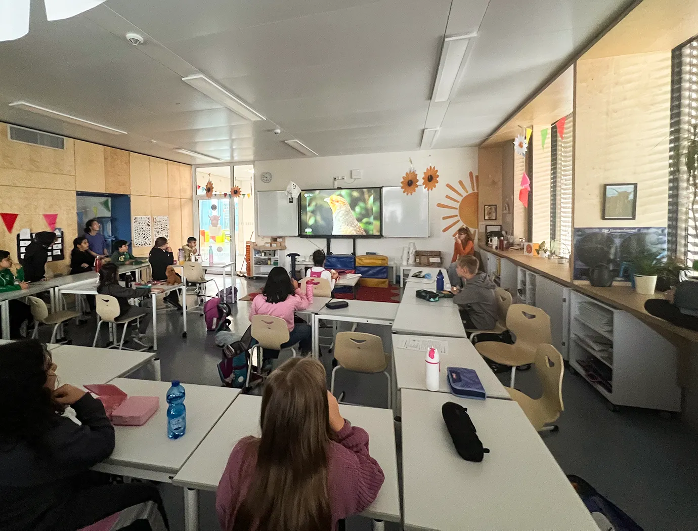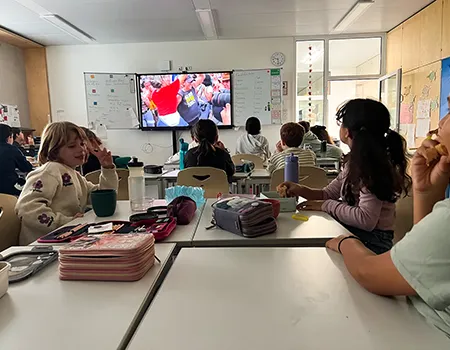 Kinder der 3. Klassen sitzen in der Frühstückspause in ihrer Klasse, frühstücken und gucken dabei die Nachrichtensendung "Logo" für Kinder.