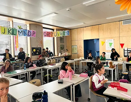 Wenn es nach der 2. Stunde zur Pause klingelt, können alle Kinder erst einmal in Ruhe ihr Frühstück auspacken, an der Gurke knabbern oder ins Brot beißen. Denn vor der Hofpause, kommt die Frühstückspause.