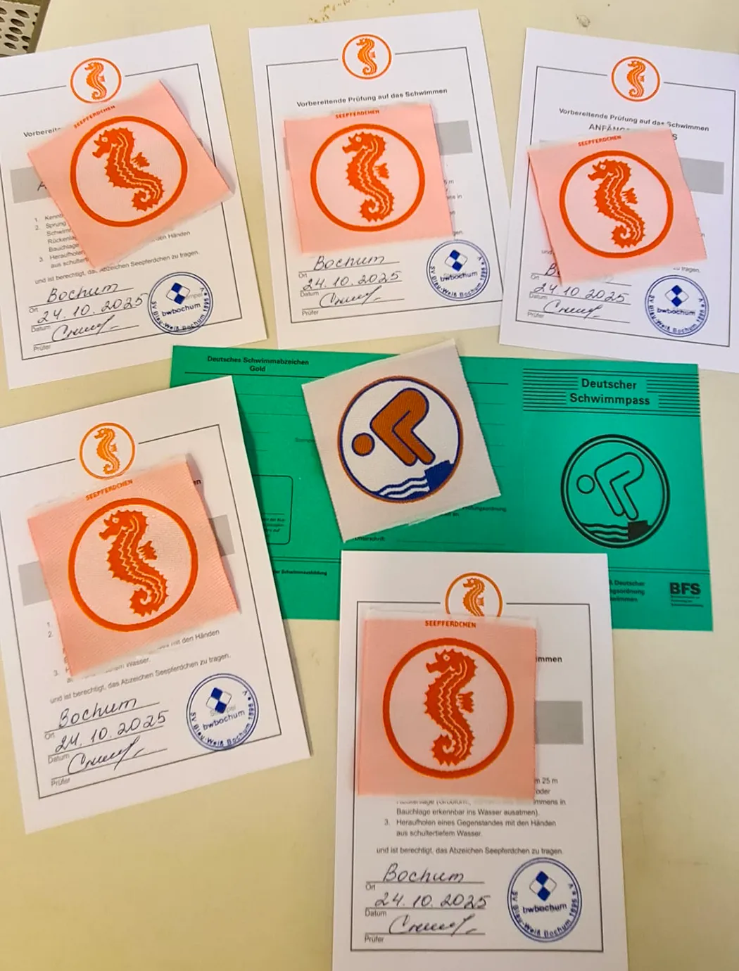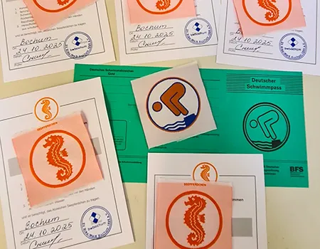 Wer das schafft, bekommt eine kleine Seepferdchen-Plakette zum Aufnähen und eine Urkunde.