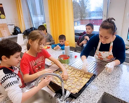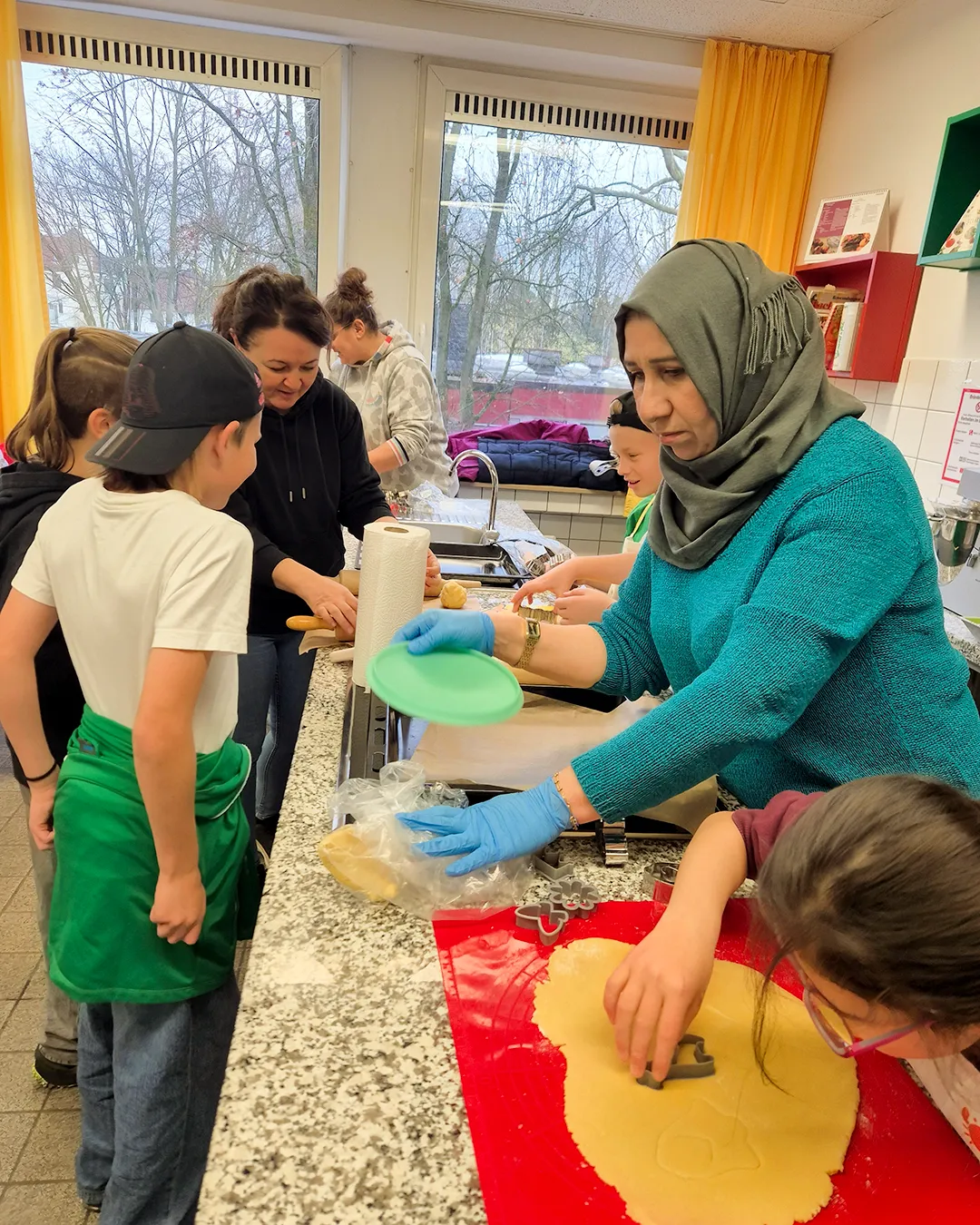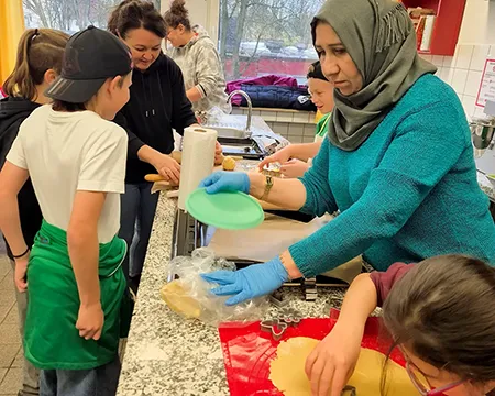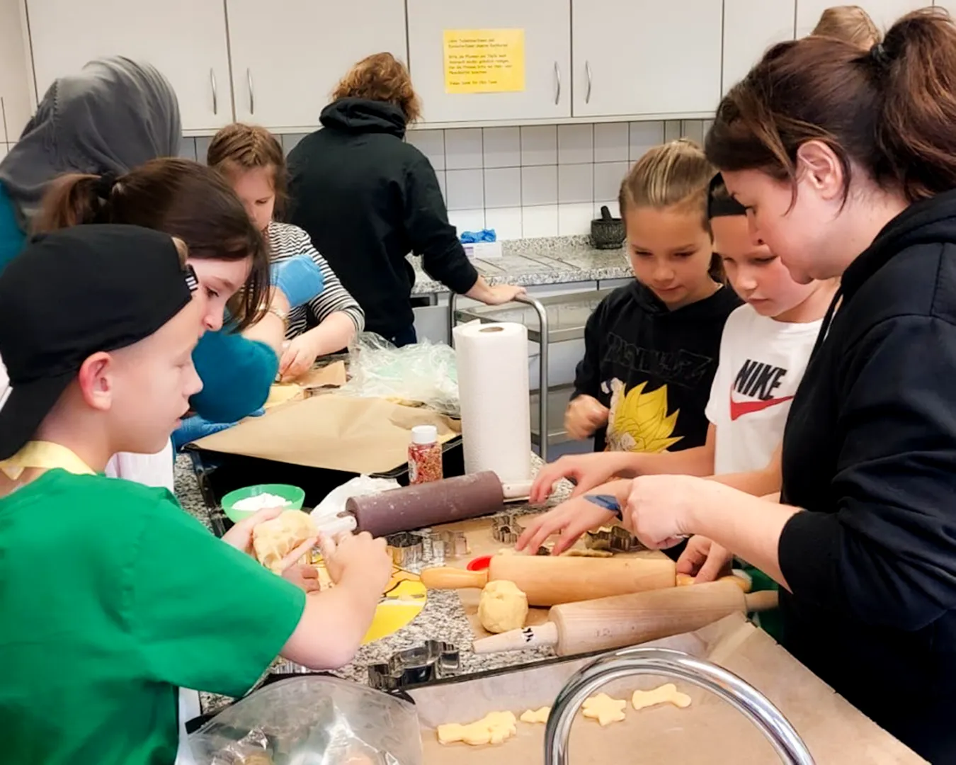 Schülerinnen und Schüler auf dem Schulhof und in der Betreuung nehmen an den Aktivitäten des Day Camps teil. Das erste Bild zeigt die gesamte Gruppe der aktiven Erwachsenen beim Day Camp.