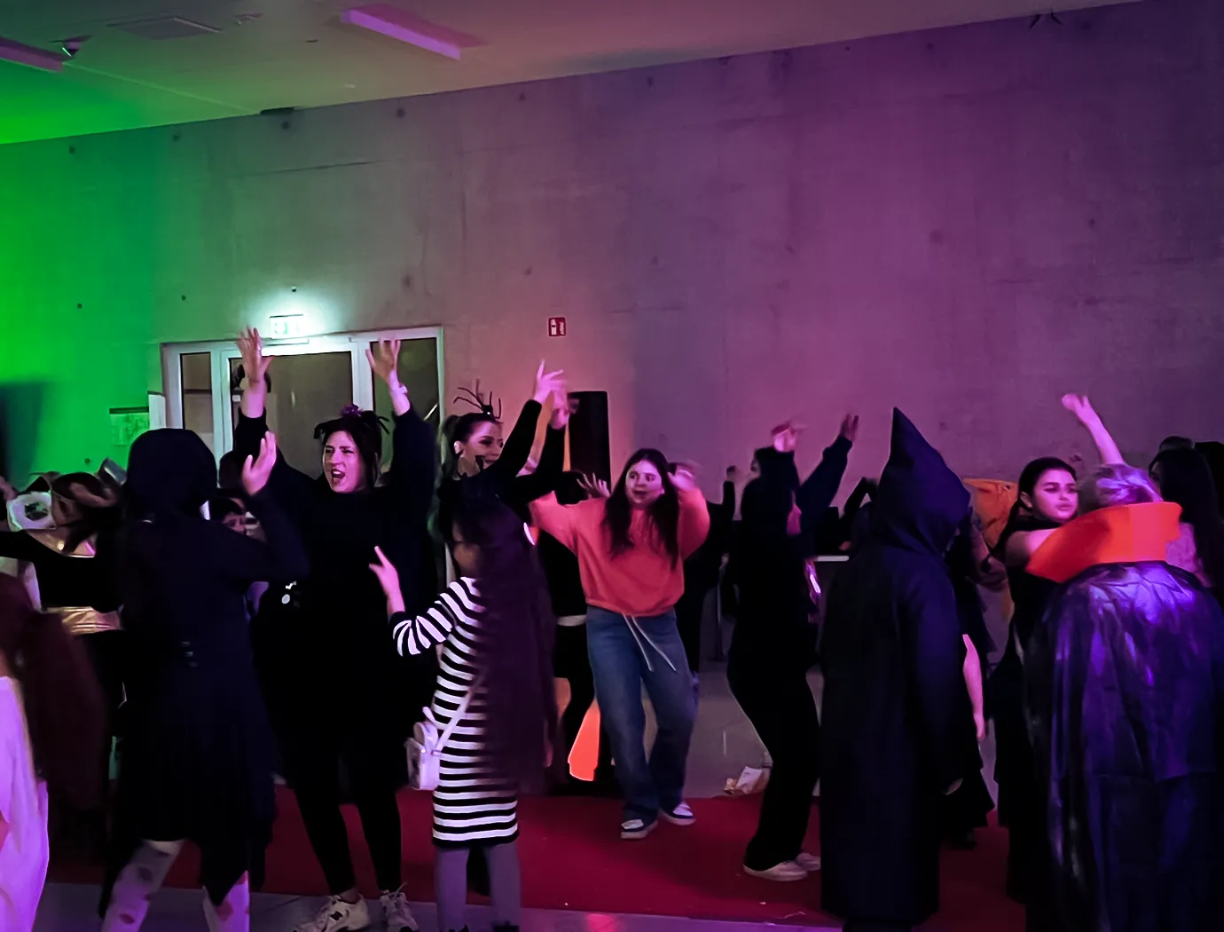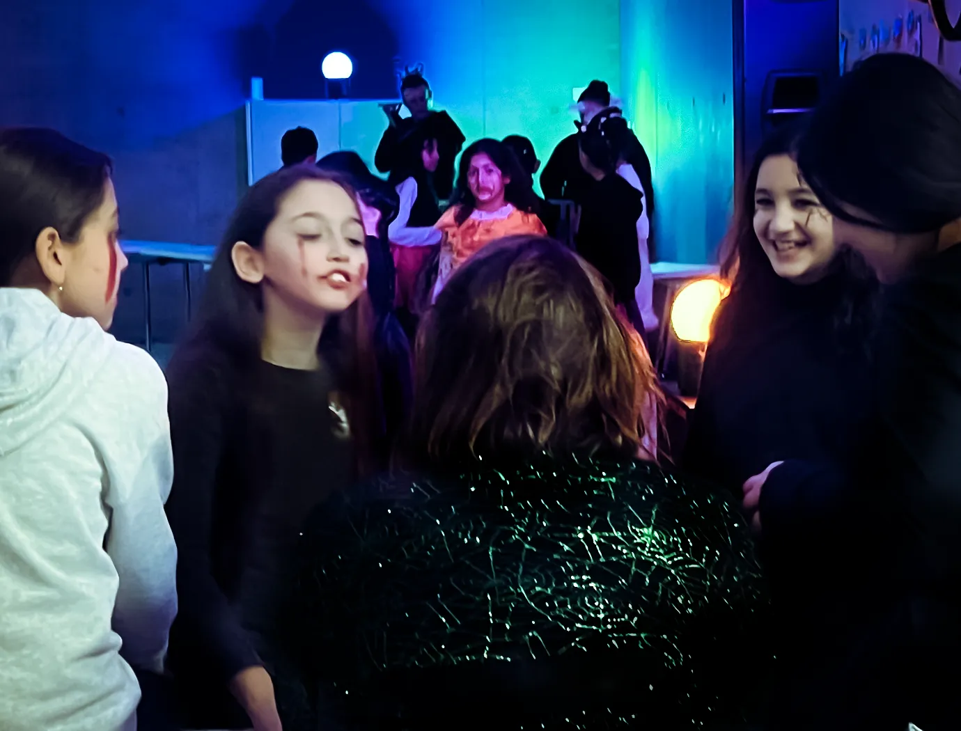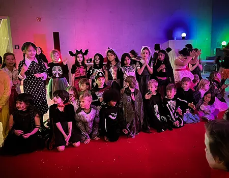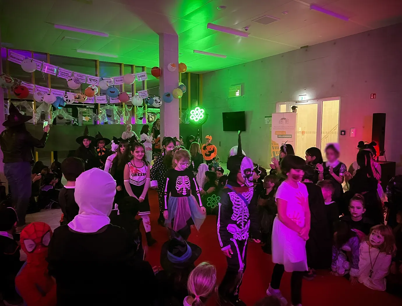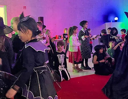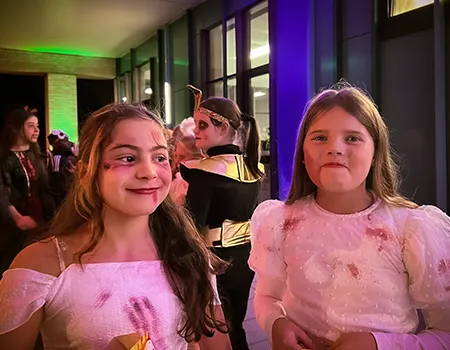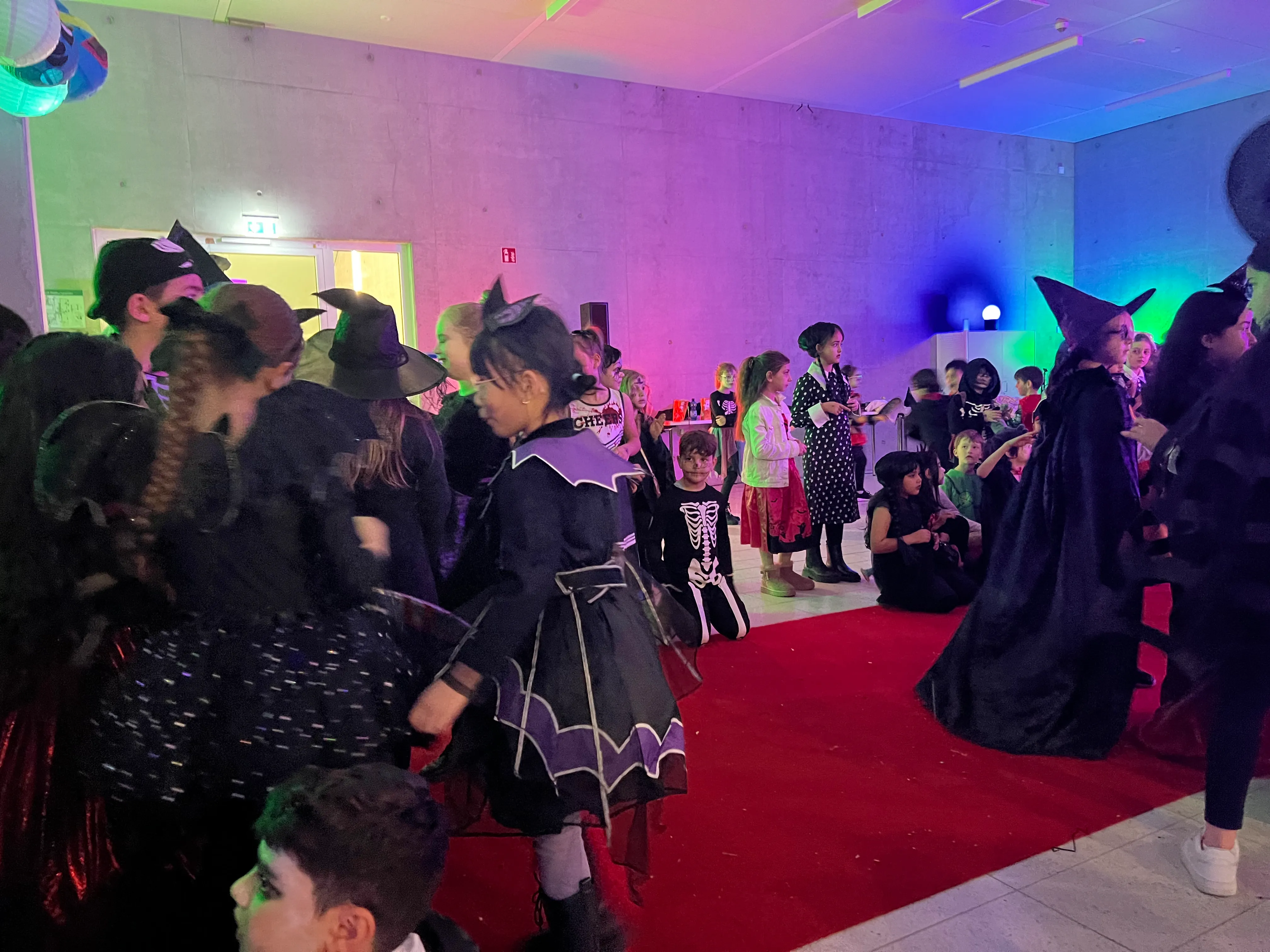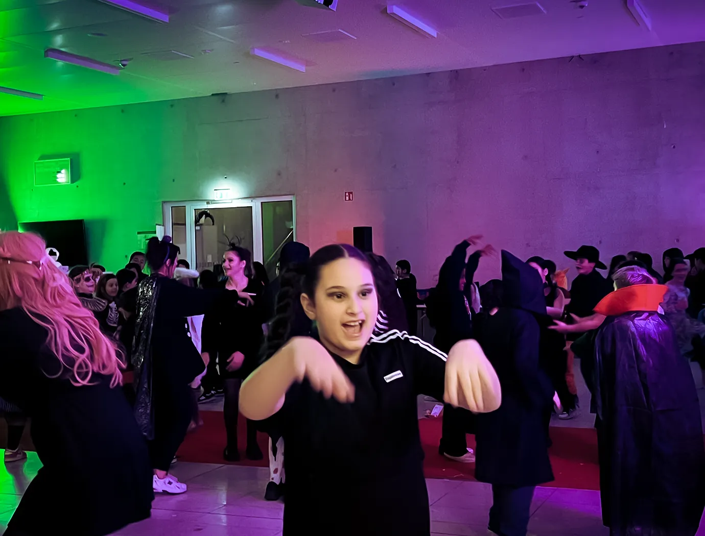 Kinder und Erwachsene in Halloweenkostümen tanzen in der Aula, laufen über den Schulhof, präsentieren ihre meist recht gruseligen Kostüme, essen Zuckerwatte oder Popcorn und reden in Gruppen miteinander.