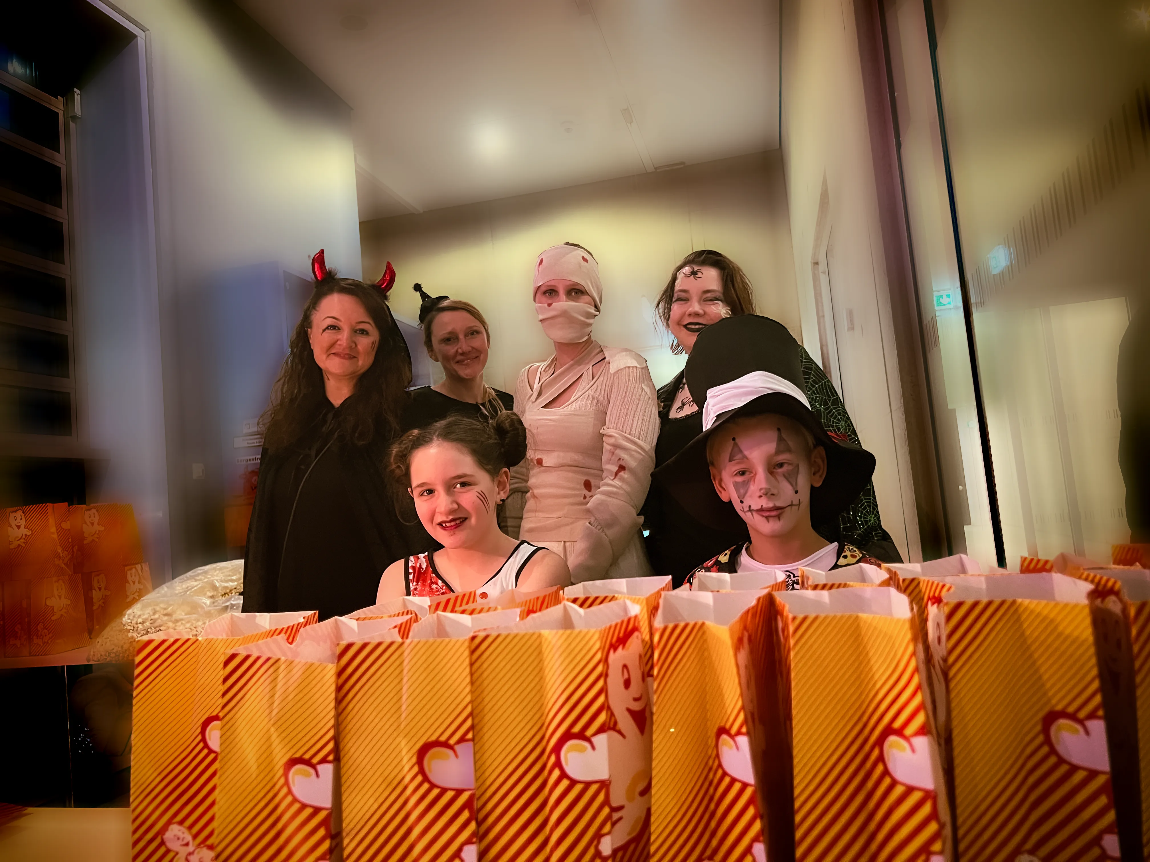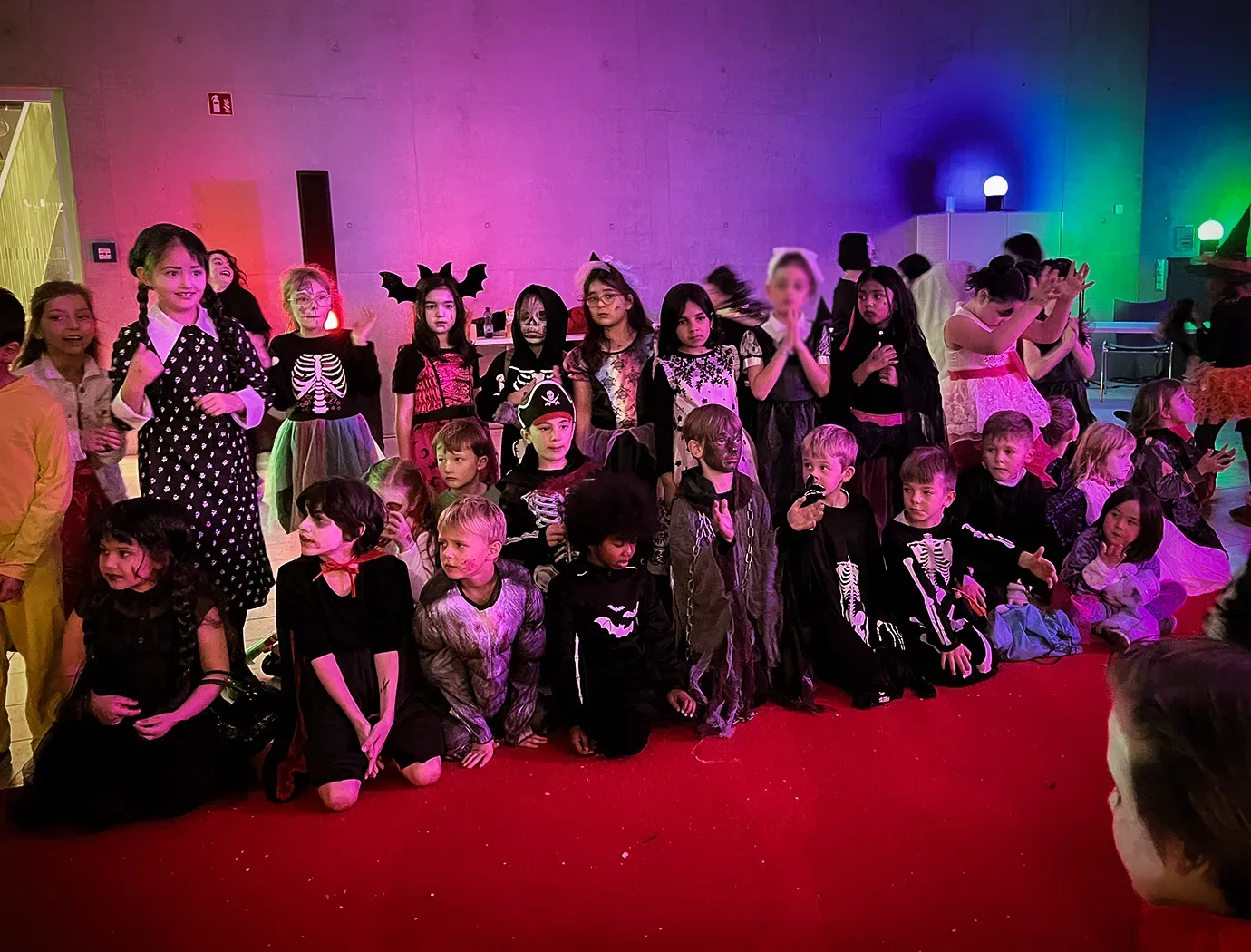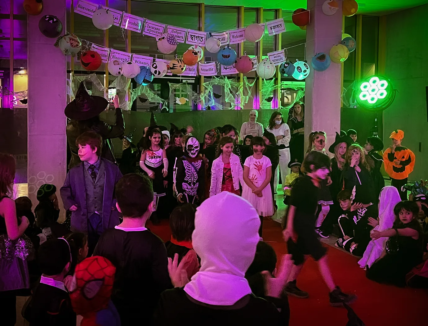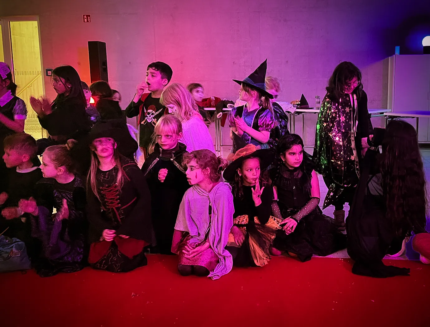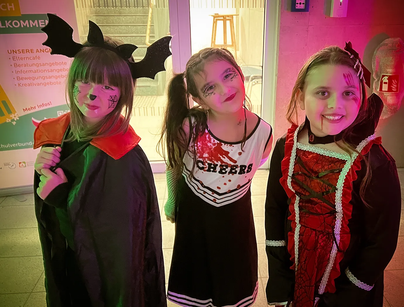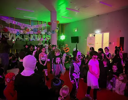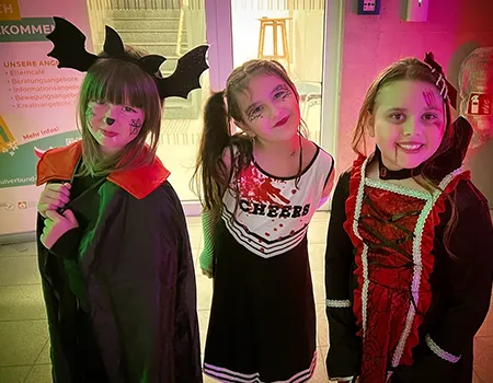 Kinder und Erwachsene in Halloweenkostümen tanzen in der Aula, laufen über den Schulhof, präsentieren ihre meist recht gruseligen Kostüme, essen Zuckerwatte oder Popcorn und reden in Gruppen miteinander.