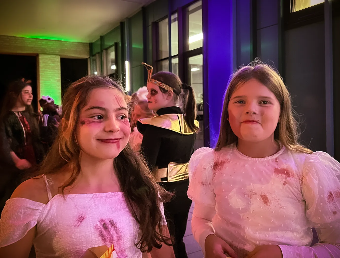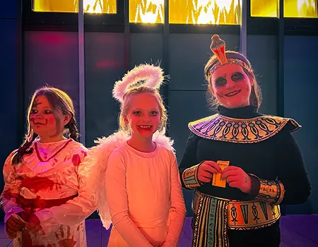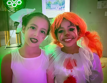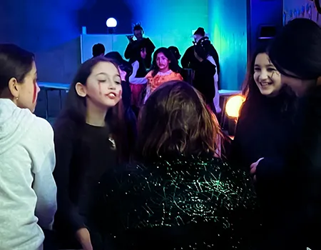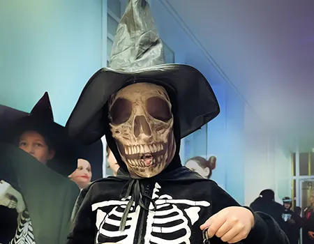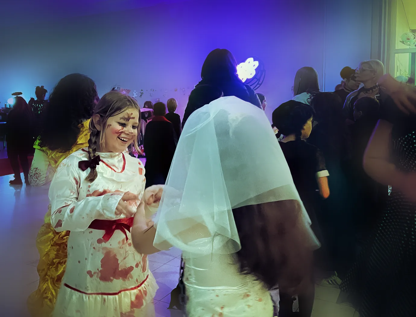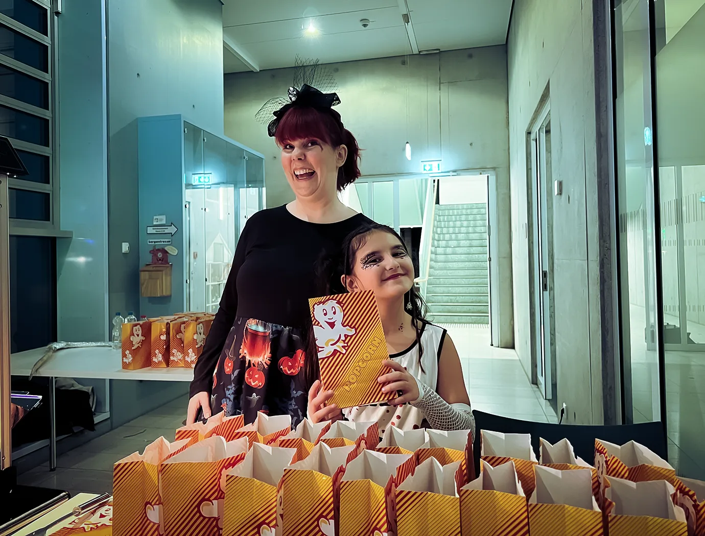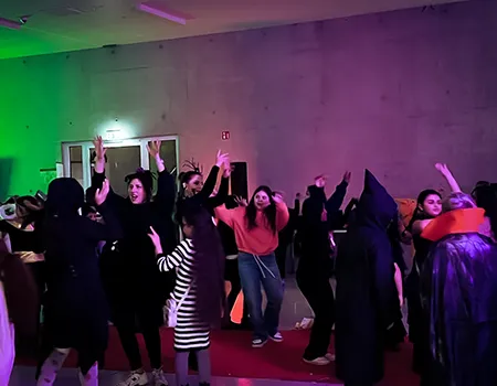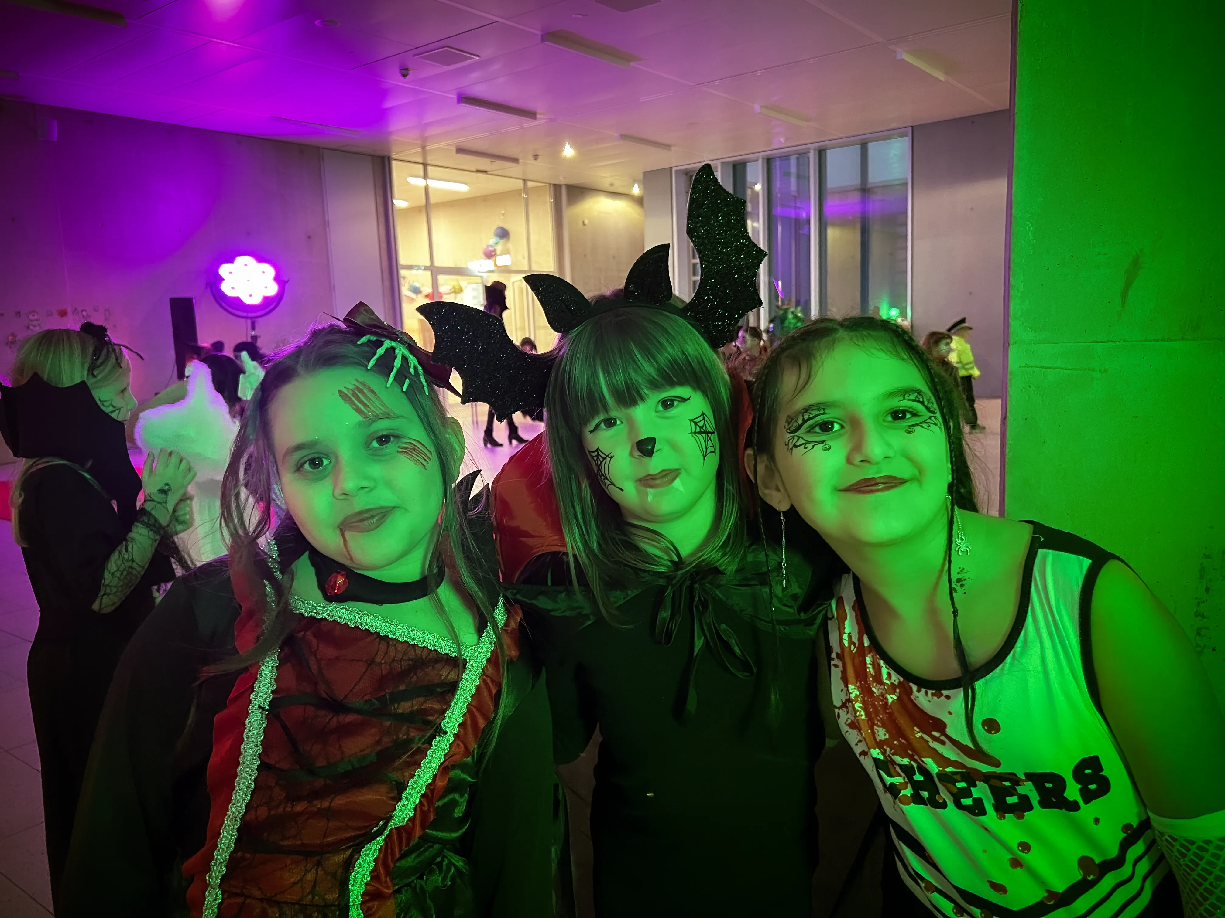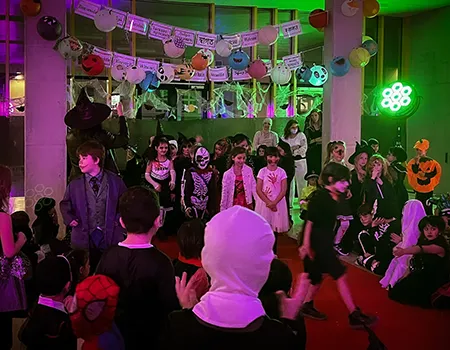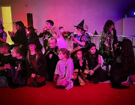 Kinder und Erwachsene in Halloweenkostümen tanzen in der Aula, laufen über den Schulhof, präsentieren ihre meist recht gruseligen Kostüme, essen Zuckerwatte oder Popcorn und reden in Gruppen miteinander.