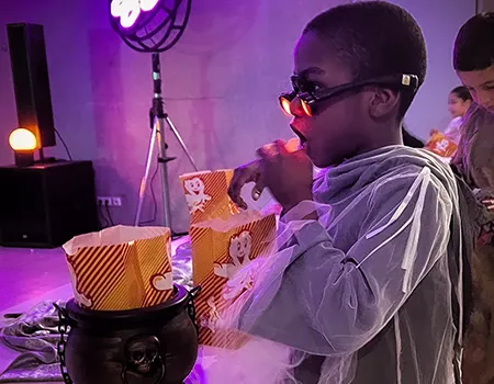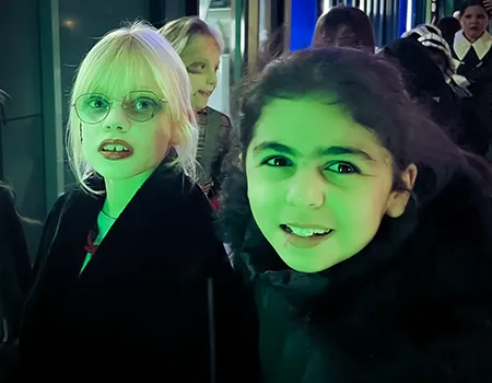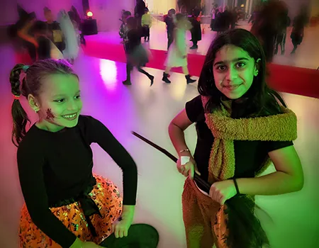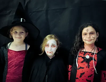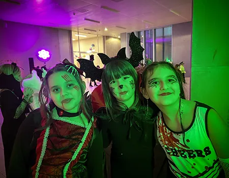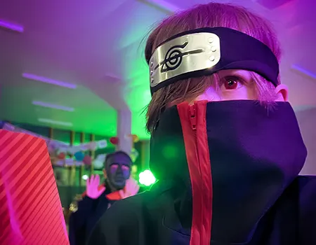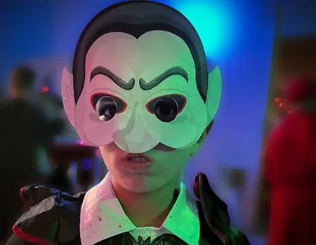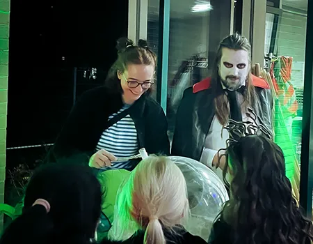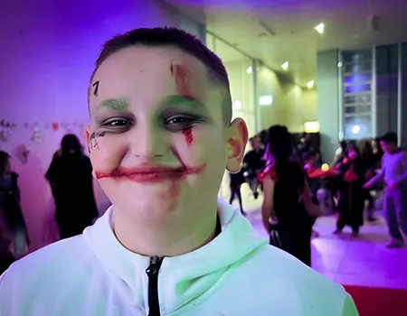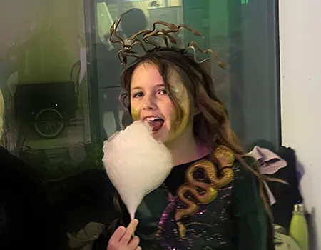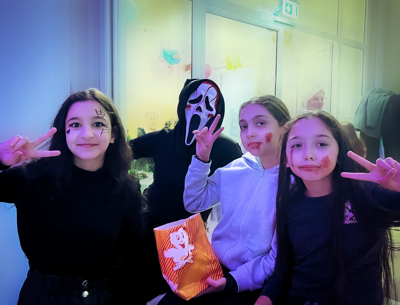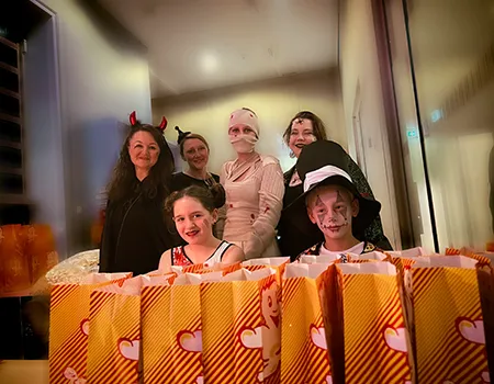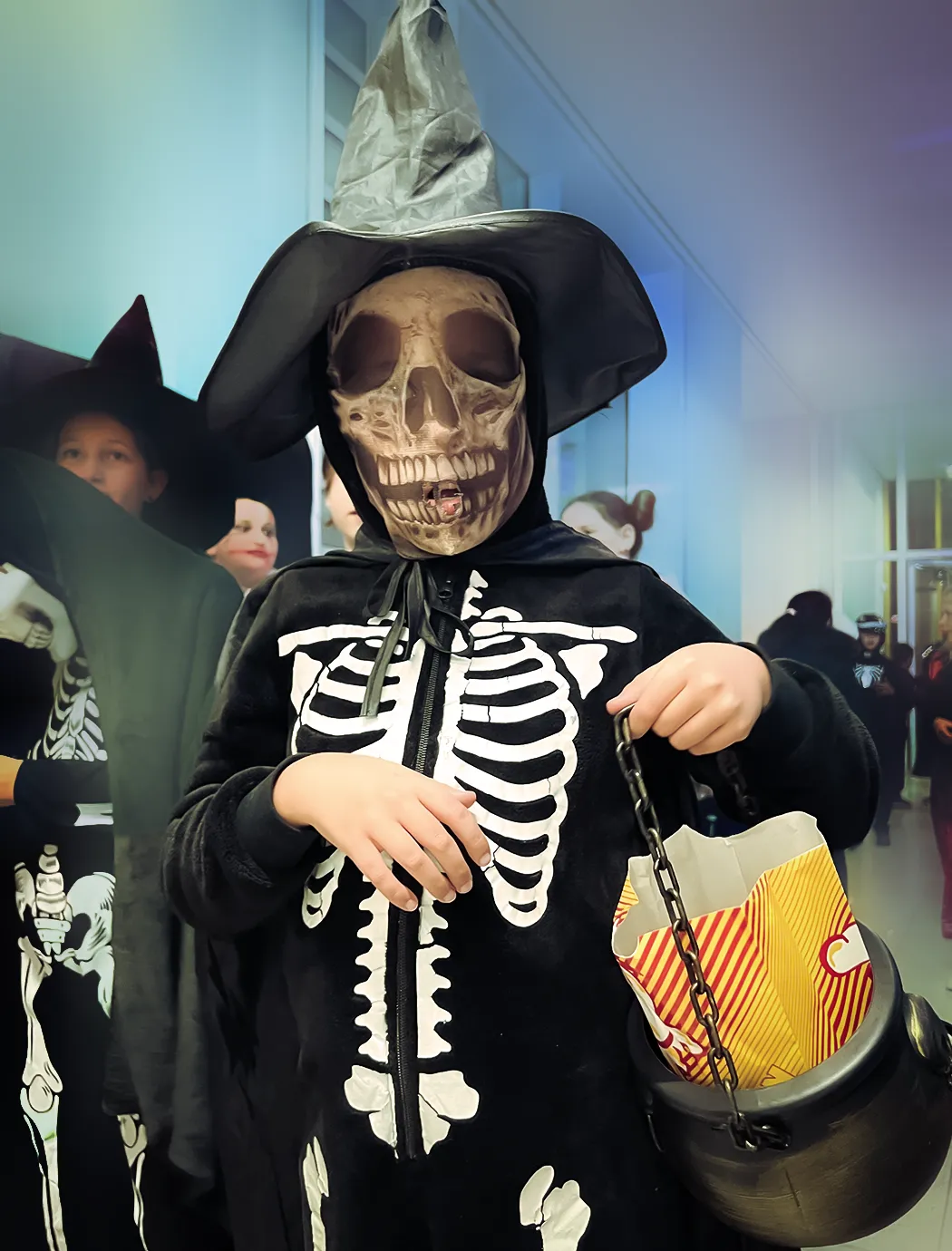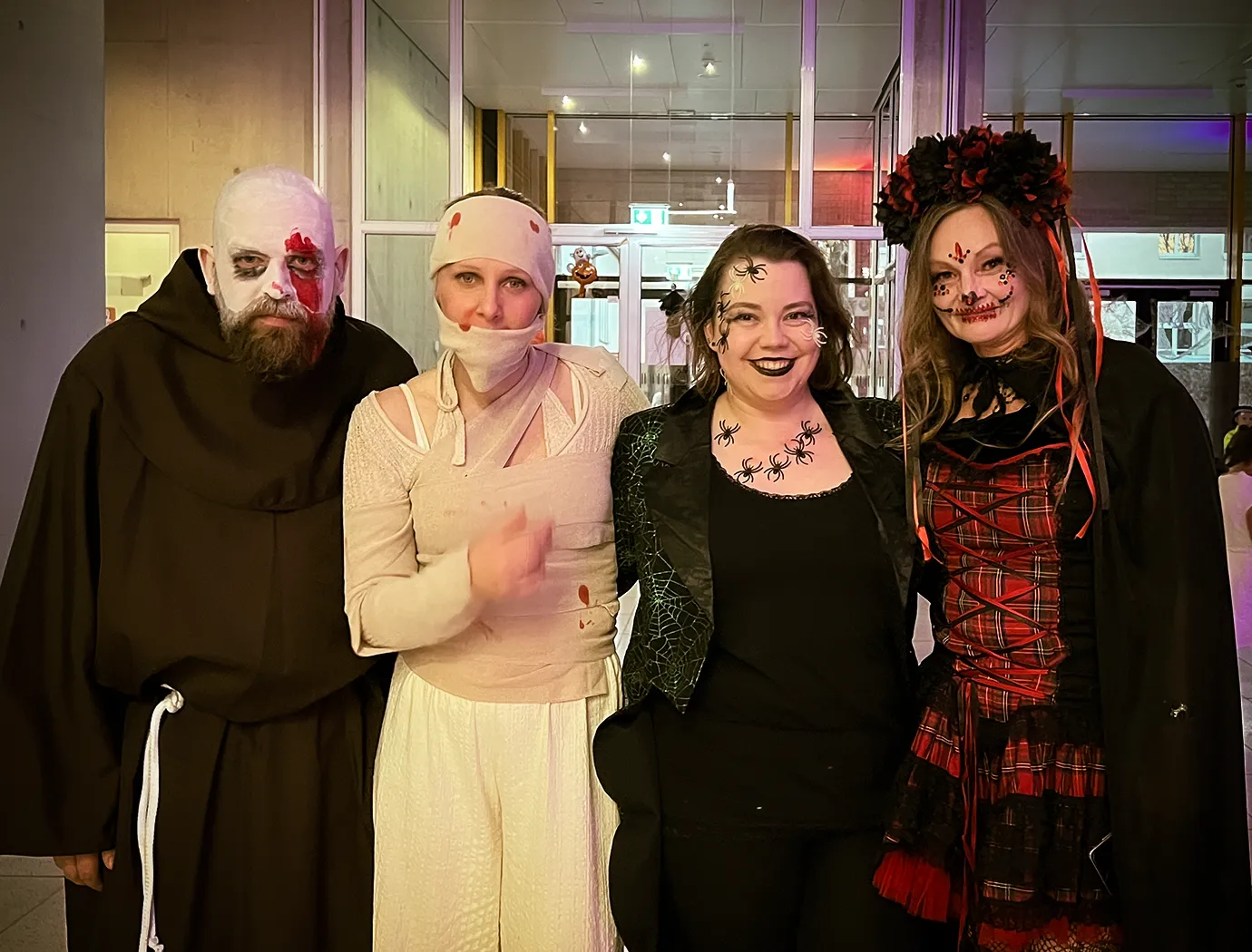 Kinder und Erwachsene in Halloweenkostümen tanzen in der Aula, laufen über den Schulhof, präsentieren ihre meist recht gruseligen Kostüme, essen Zuckerwatte oder Popcorn und reden in Gruppen miteinander.