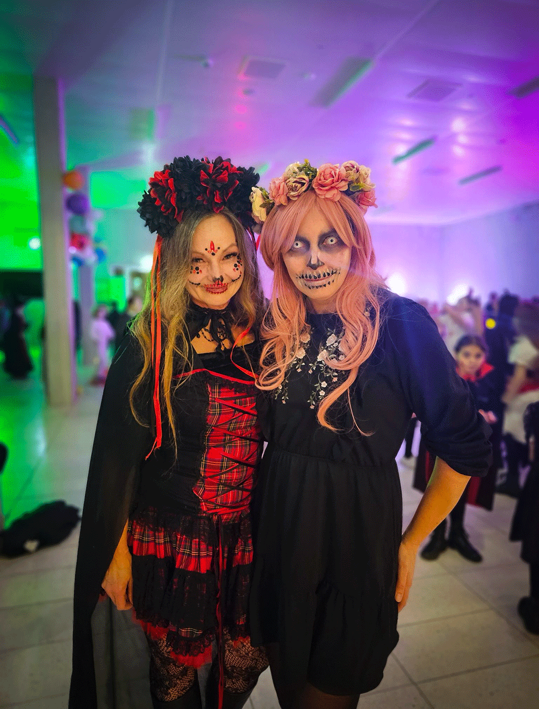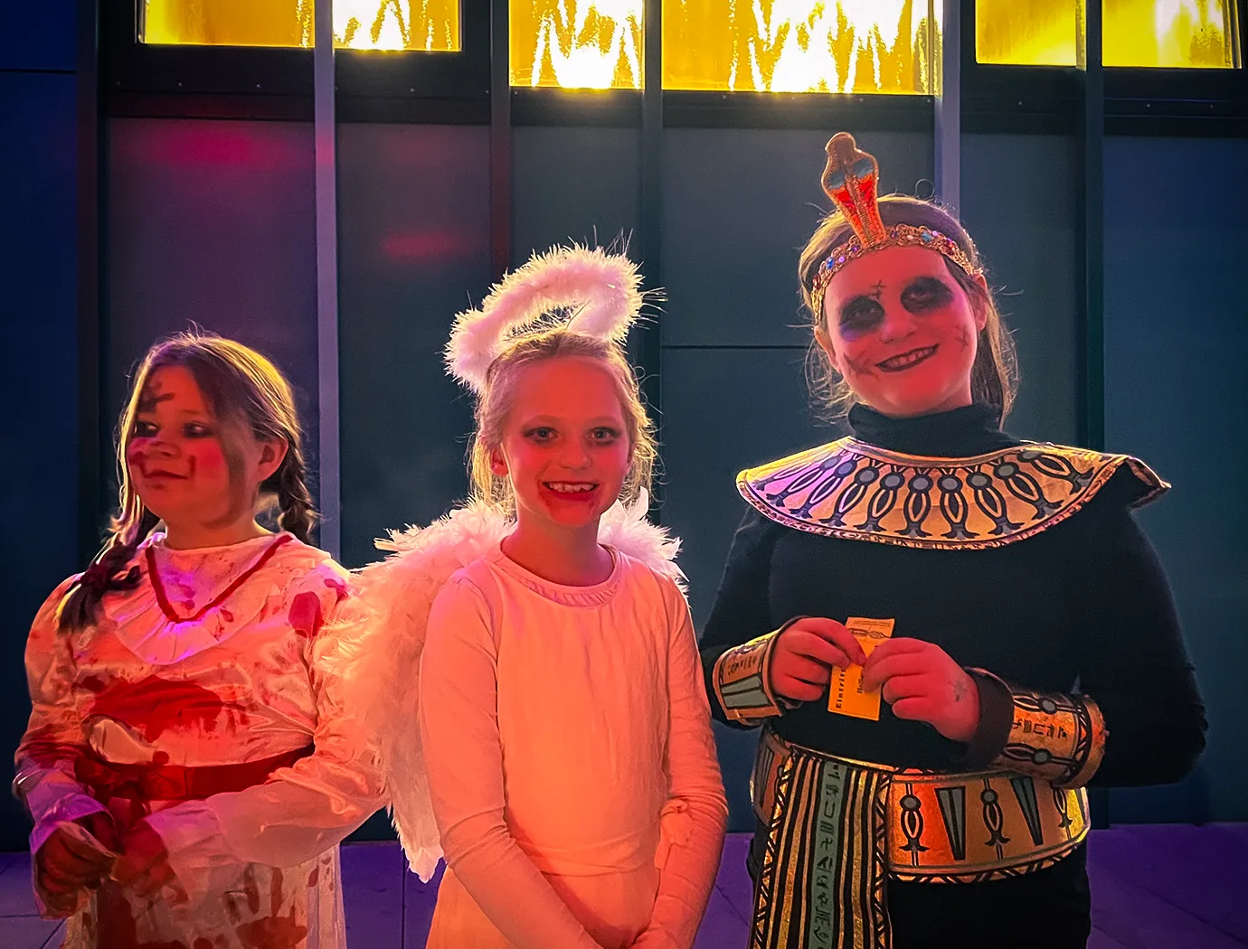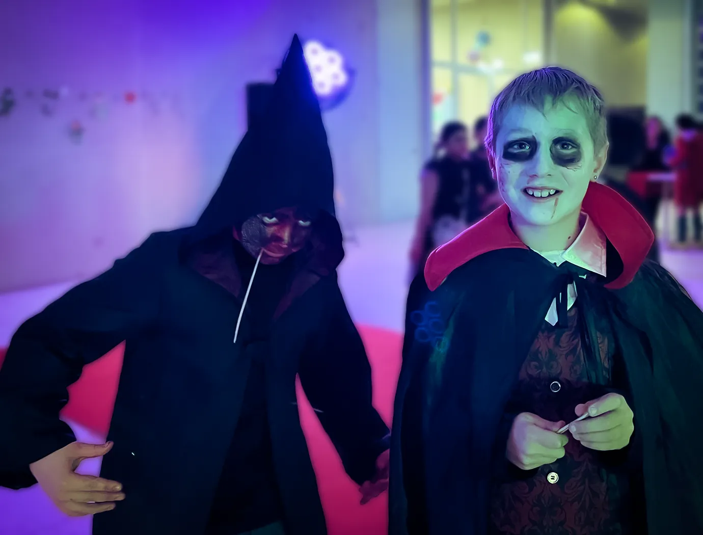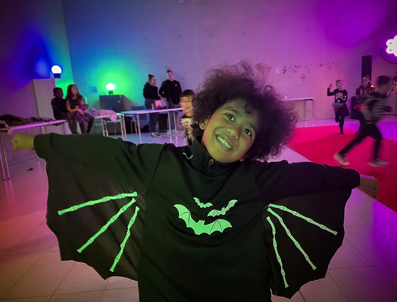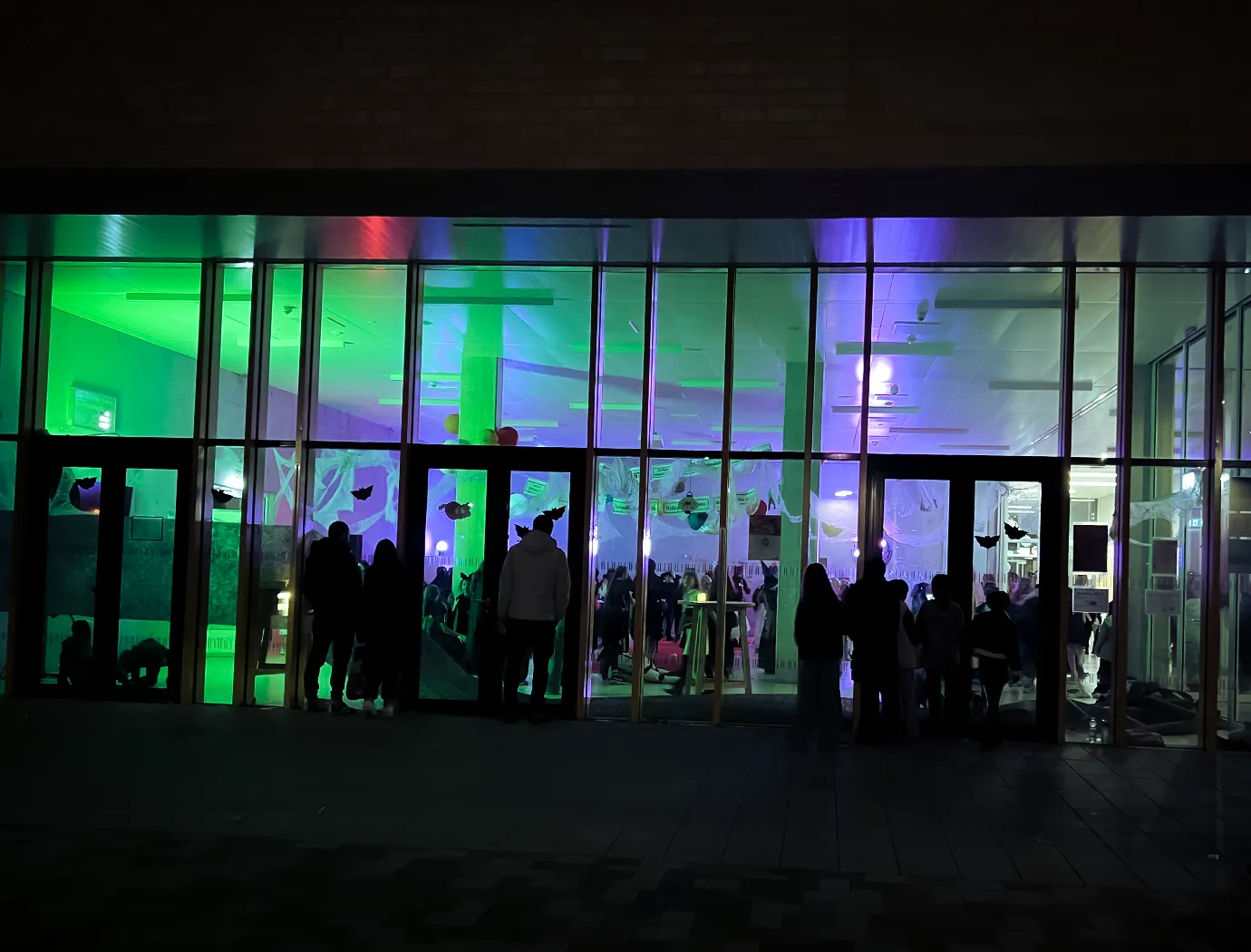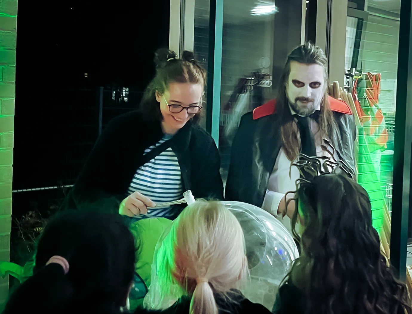 Kinder und Erwachsene in Halloweenkostümen tanzen in der Aula, laufen über den Schulhof, präsentieren ihre meist recht gruseligen Kostüme, essen Zuckerwatte oder Popcorn und reden in Gruppen miteinander.