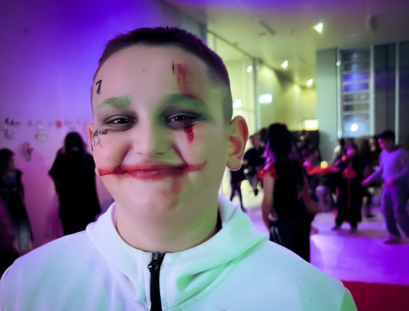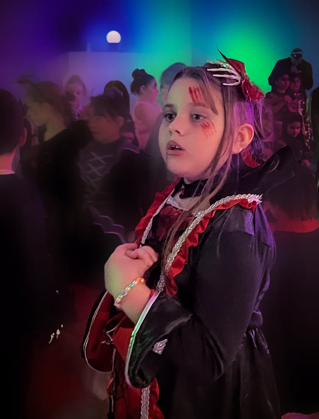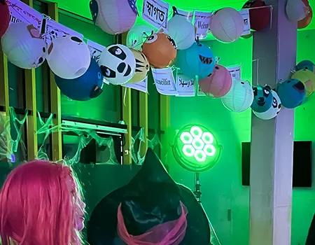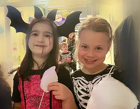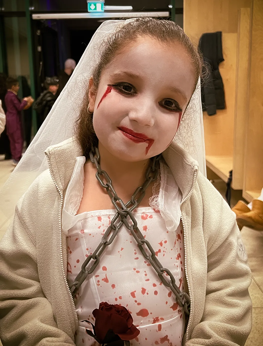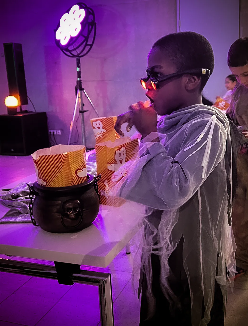 Kinder und Erwachsene in Halloweenkostümen tanzen in der Aula, laufen über den Schulhof, präsentieren ihre meist recht gruseligen Kostüme, essen Zuckerwatte oder Popcorn und reden in Gruppen miteinander.