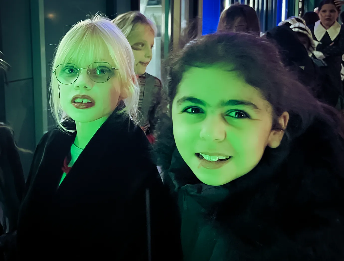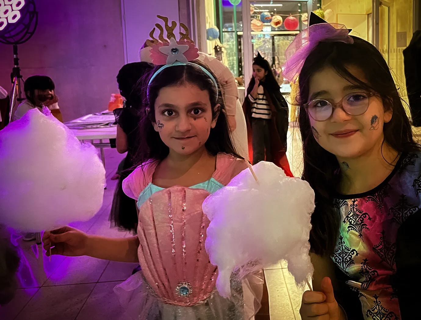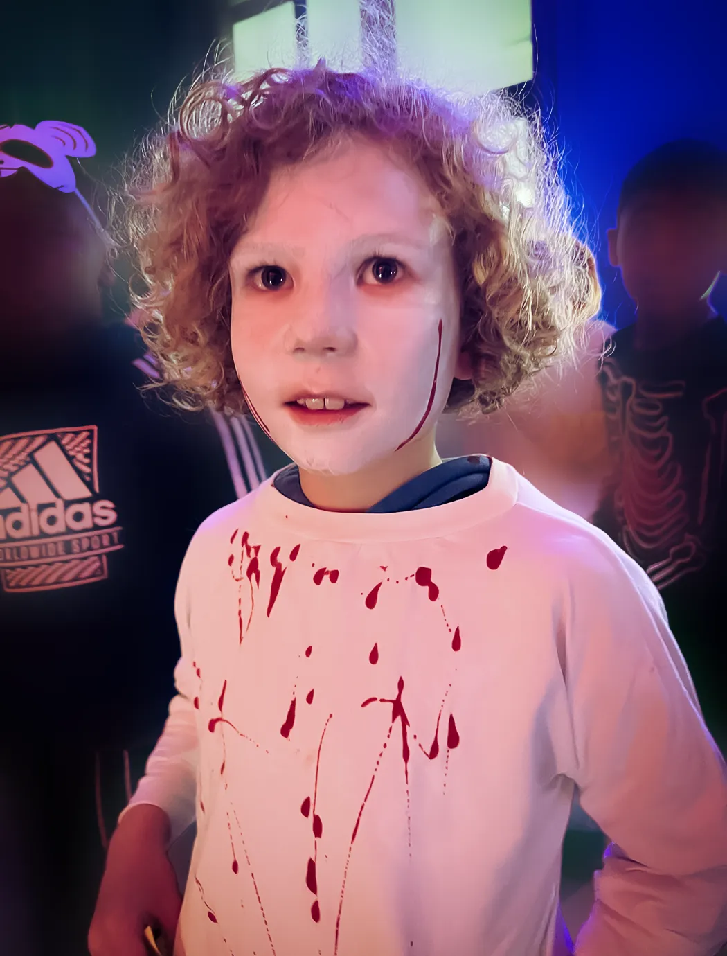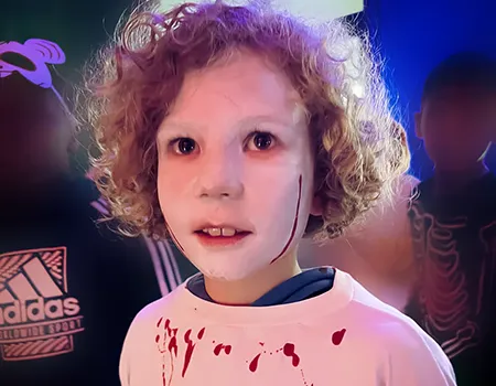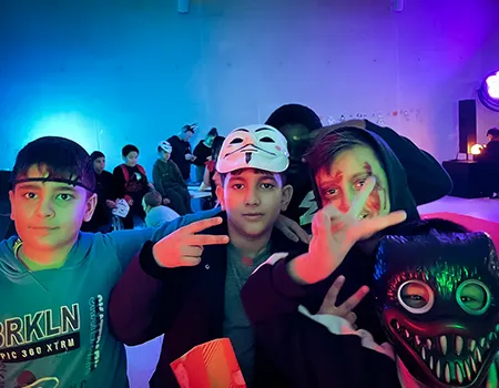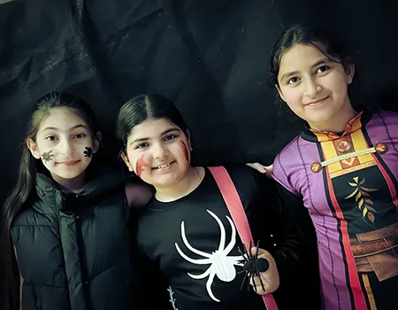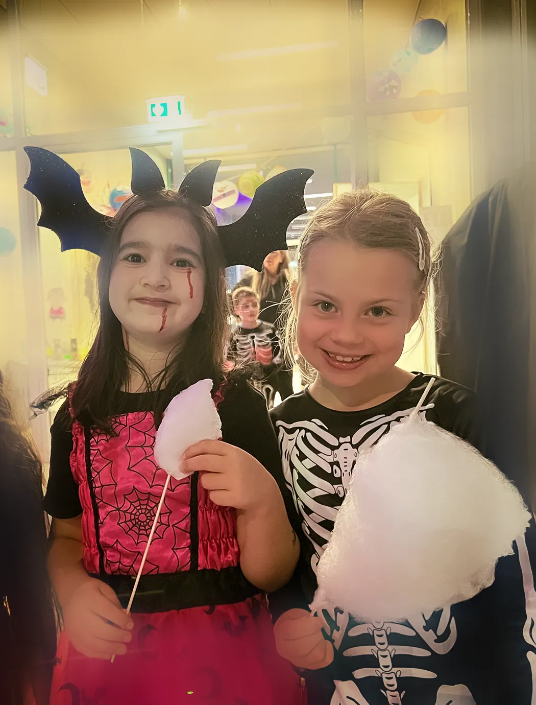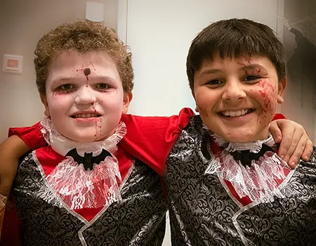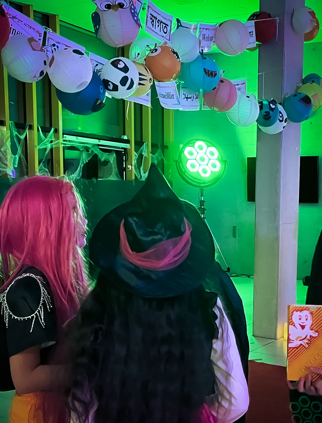 Kinder und Erwachsene in Halloweenkostümen tanzen in der Aula, laufen über den Schulhof, präsentieren ihre meist recht gruseligen Kostüme, essen Zuckerwatte oder Popcorn und reden in Gruppen miteinander.