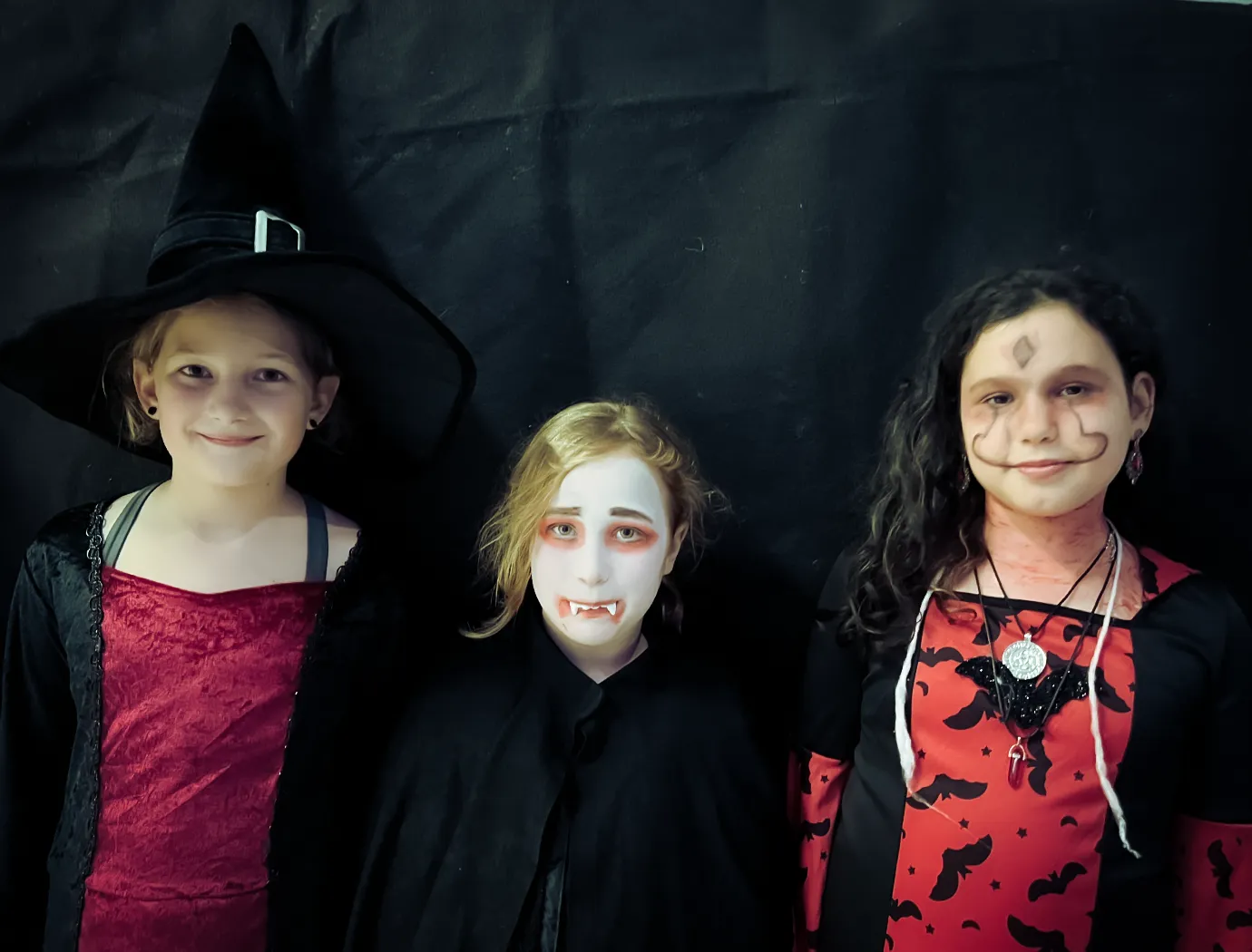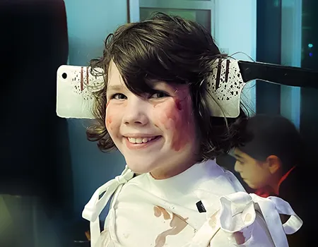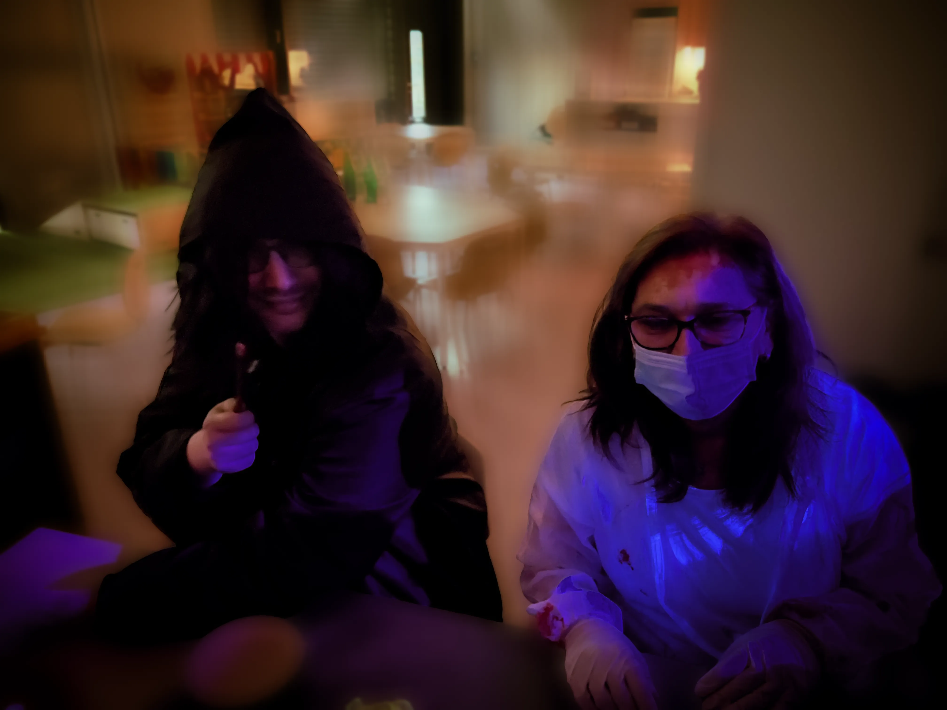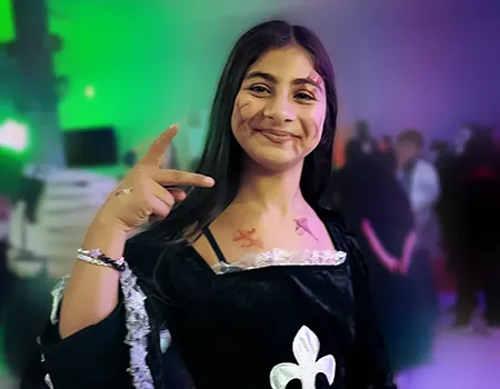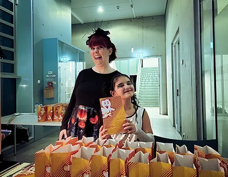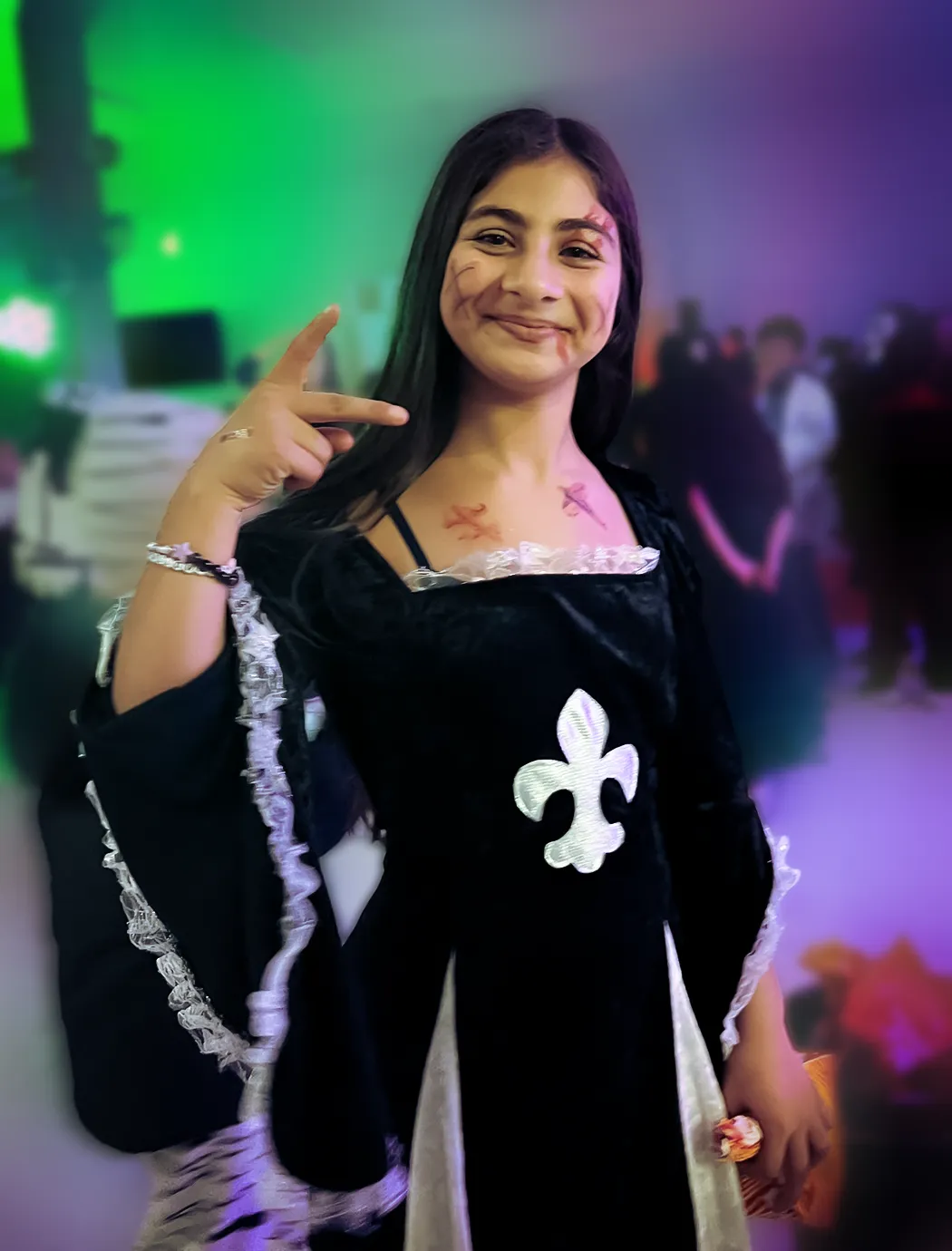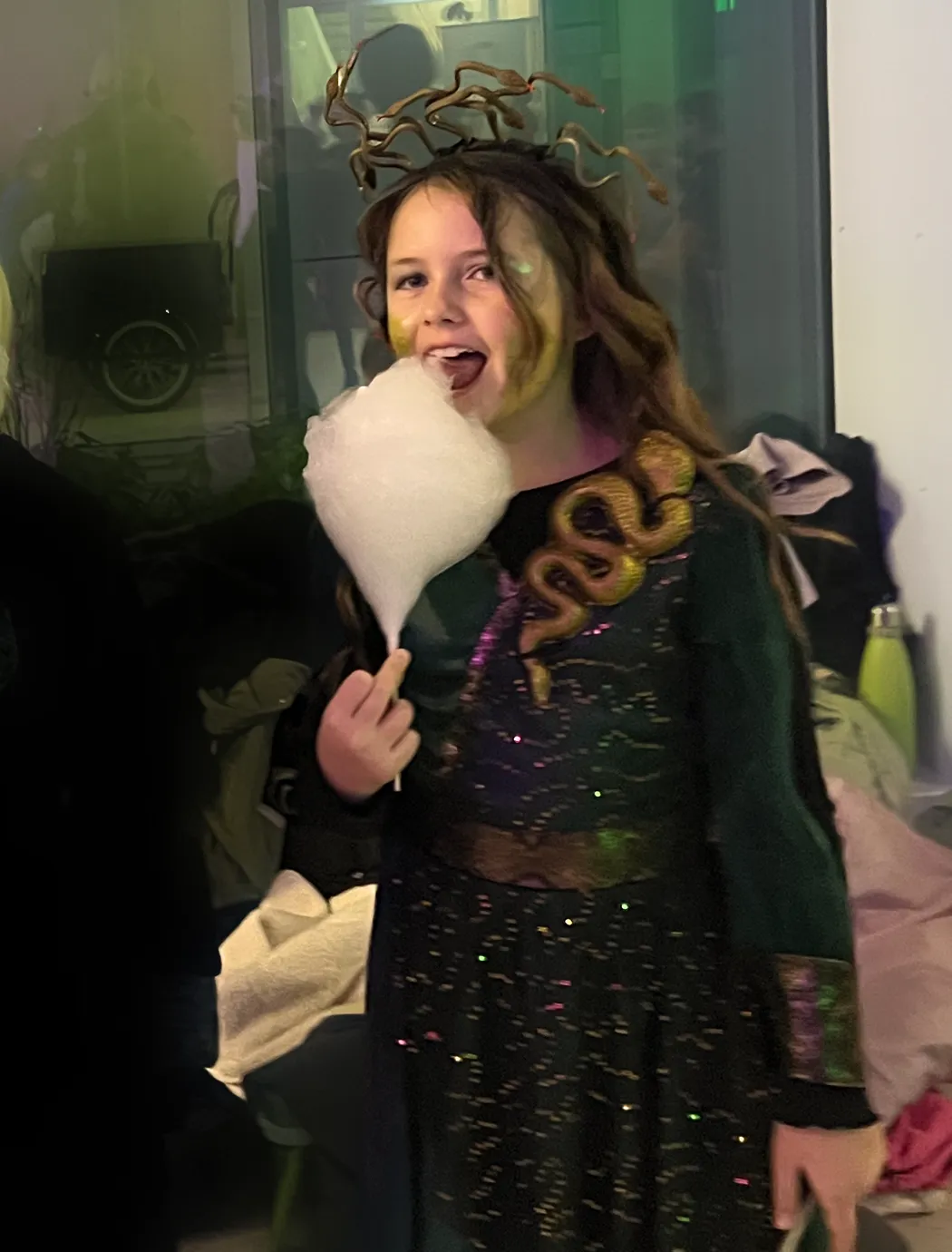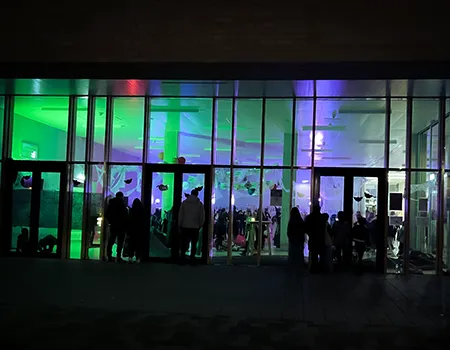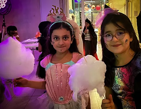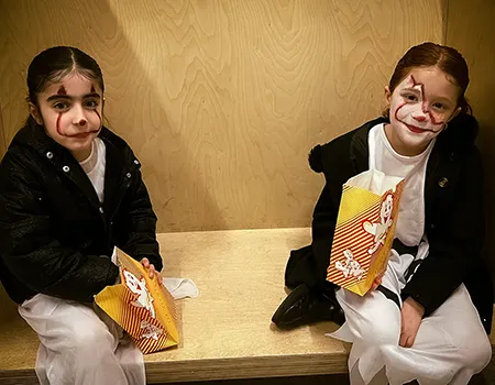 Kinder und Erwachsene in Halloweenkostümen tanzen in der Aula, laufen über den Schulhof, präsentieren ihre meist recht gruseligen Kostüme, essen Zuckerwatte oder Popcorn und reden in Gruppen miteinander.