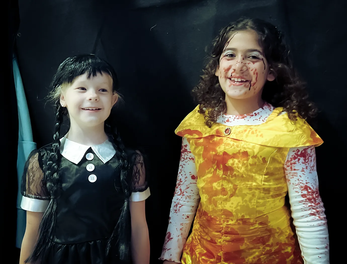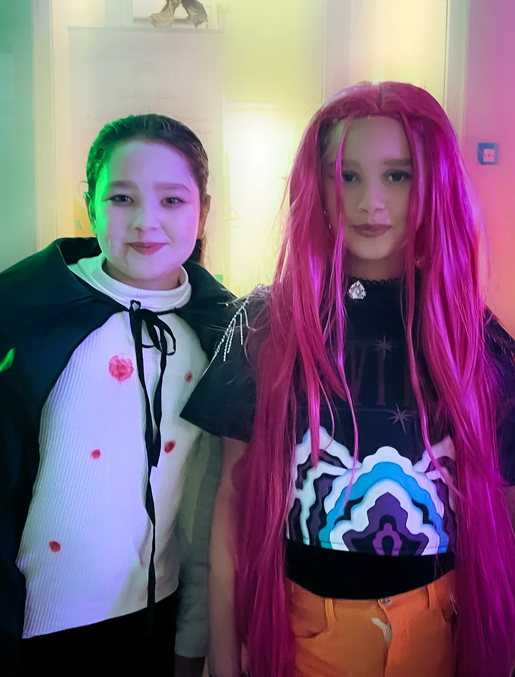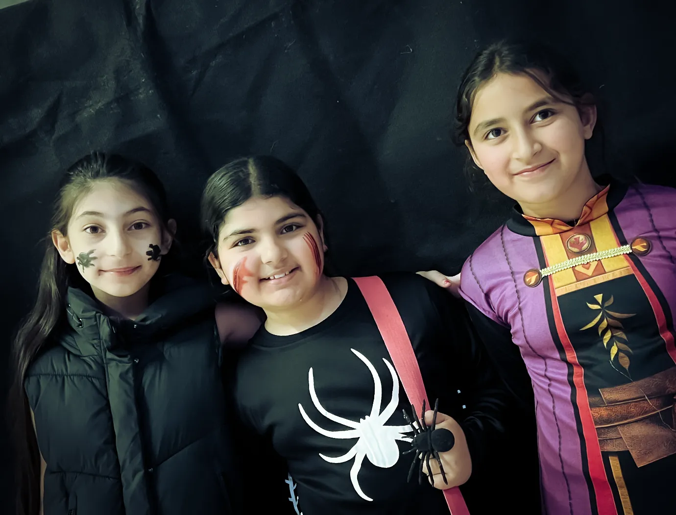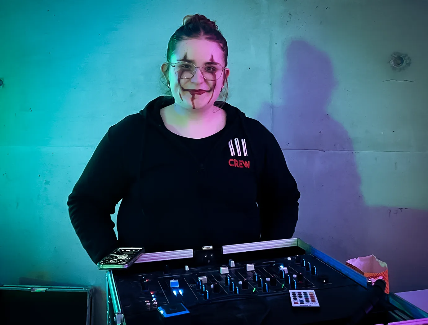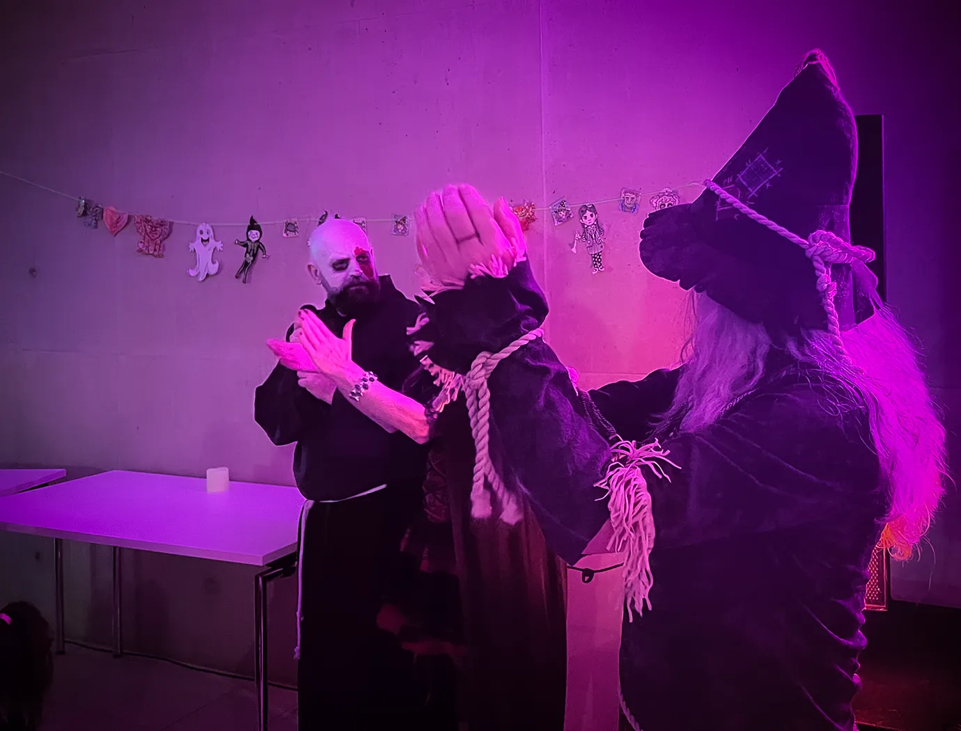Kinder und Erwachsene in Halloweenkostümen tanzen in der Aula, laufen über den Schulhof, präsentieren ihre meist recht gruseligen Kostüme, essen Zuckerwatte oder Popcorn und reden in Gruppen miteinander.