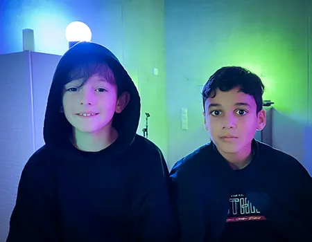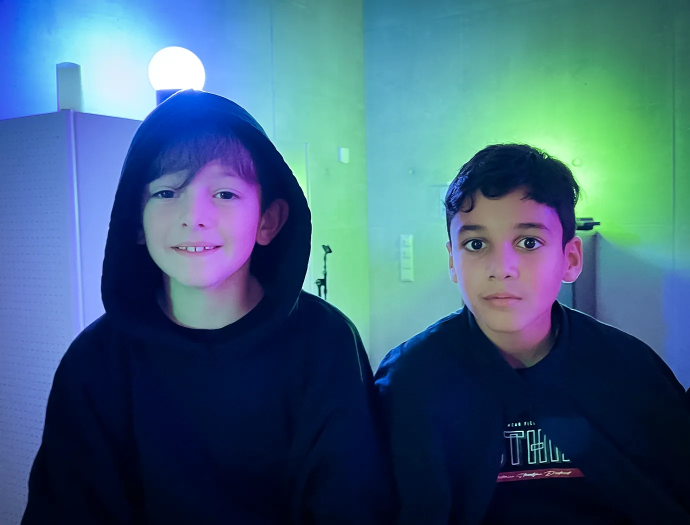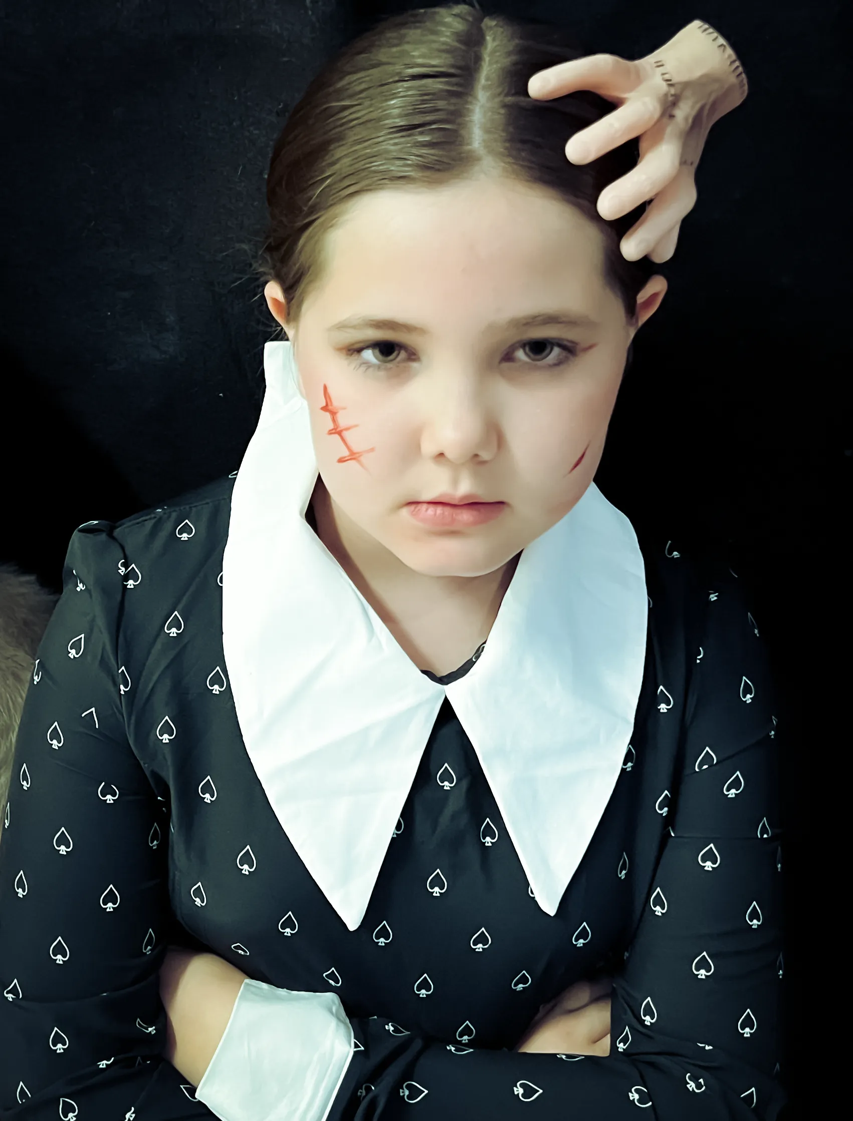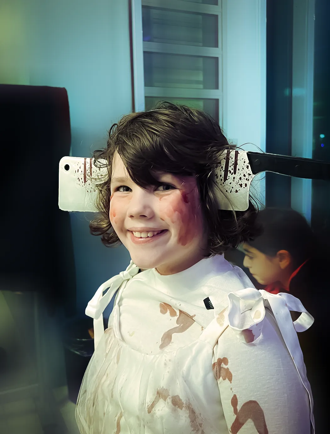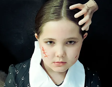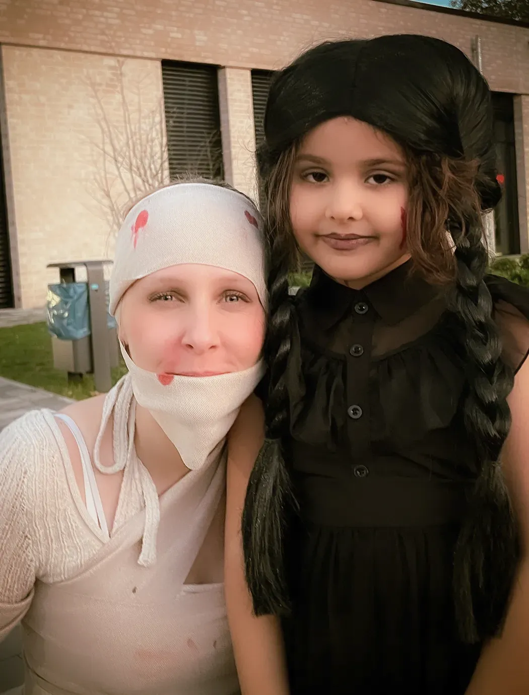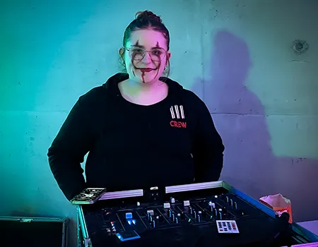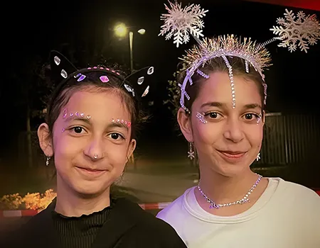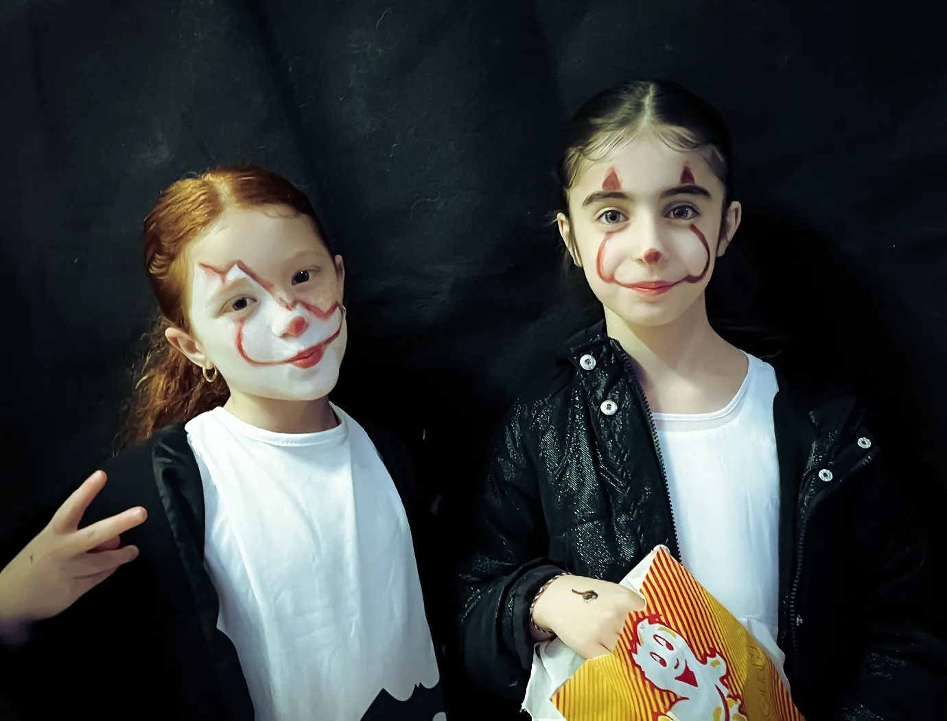 Kinder und Erwachsene in Halloweenkostümen tanzen in der Aula, laufen über den Schulhof, präsentieren ihre meist recht gruseligen Kostüme, essen Zuckerwatte oder Popcorn und reden in Gruppen miteinander.