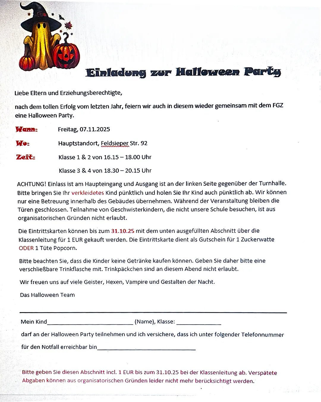 - Klasse 1b: 11.11.2025, 8.00-9.30 Uhr