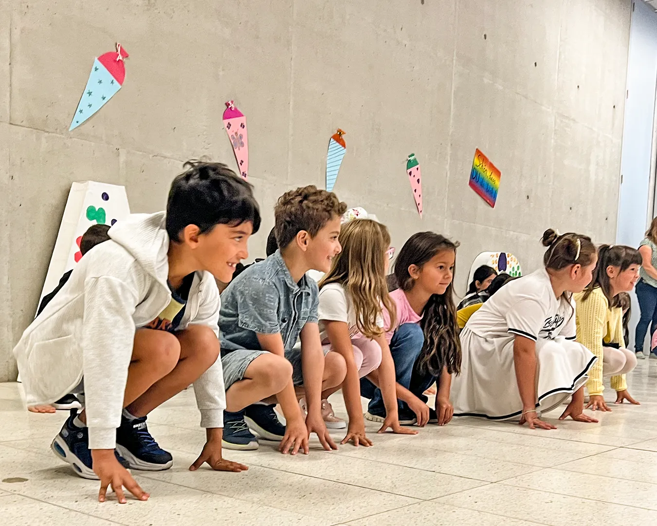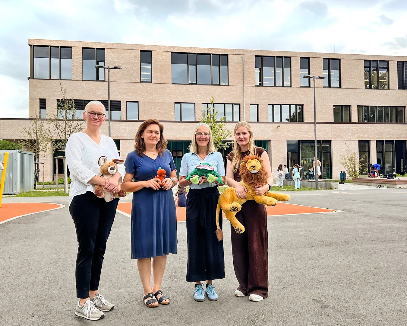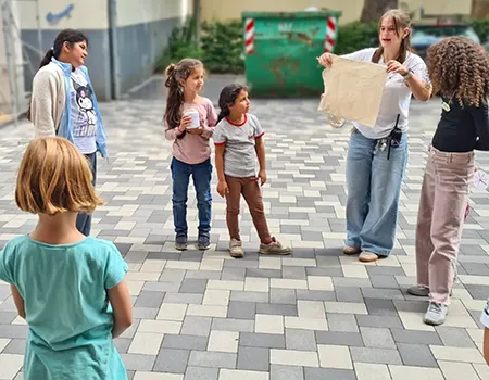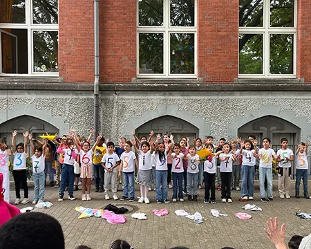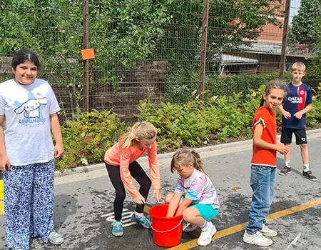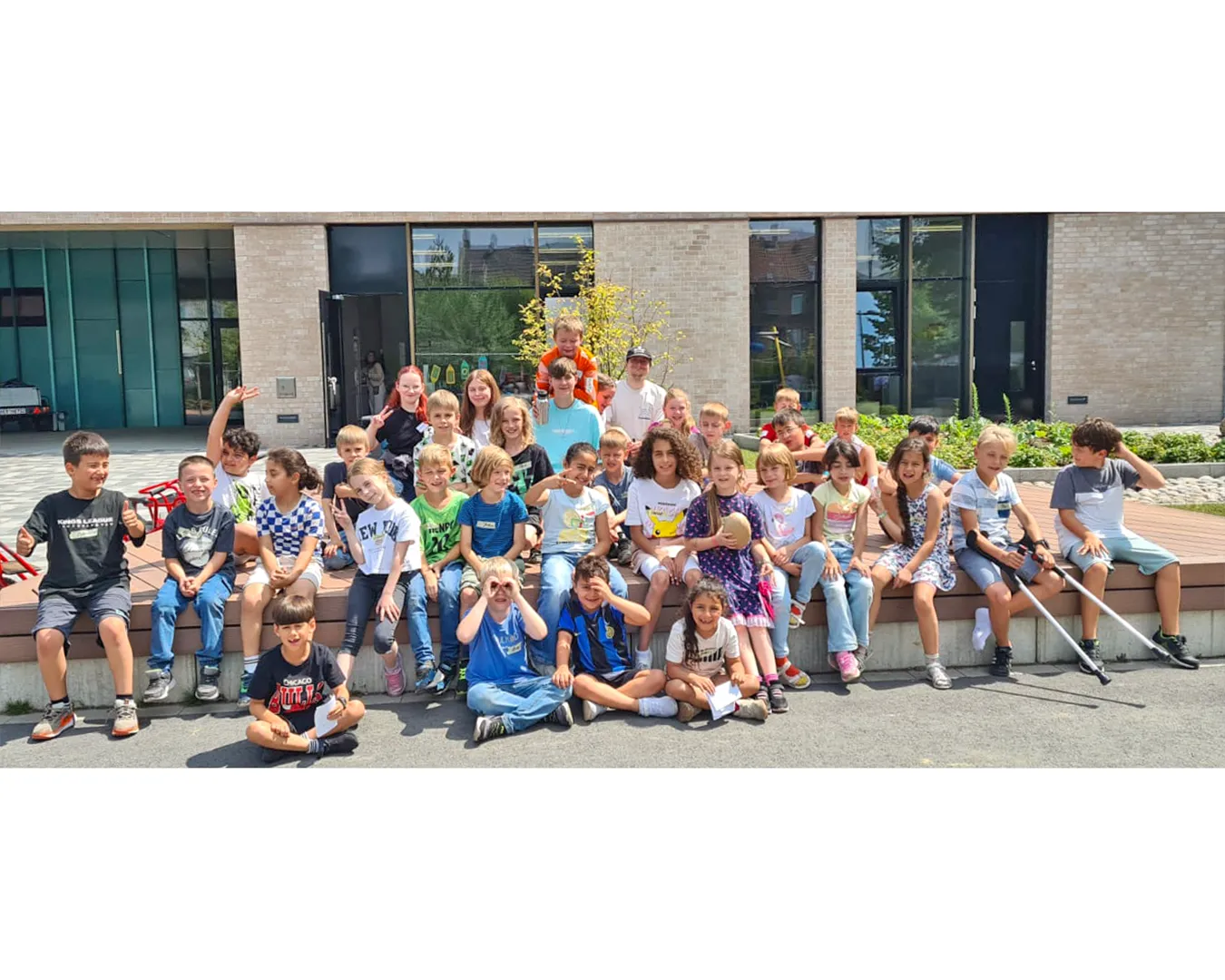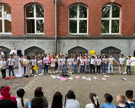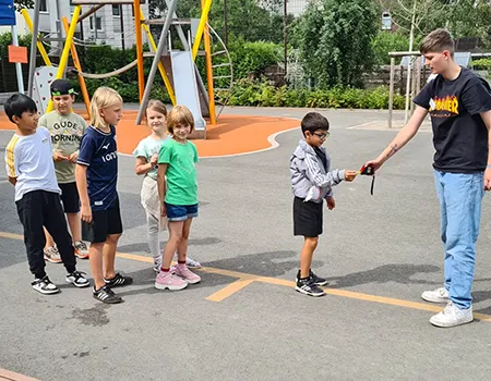 Schülerinnen und Schüler auf dem Schulhof und in der Betreuung nehmen an den Aktivitäten des Day Camps teil. Das erste Bild zeigt die gesamte Gruppe der aktiven Erwachsenen beim Day Camp.