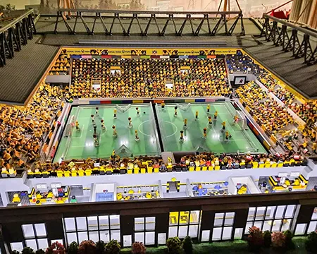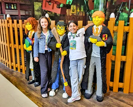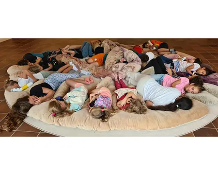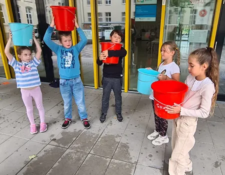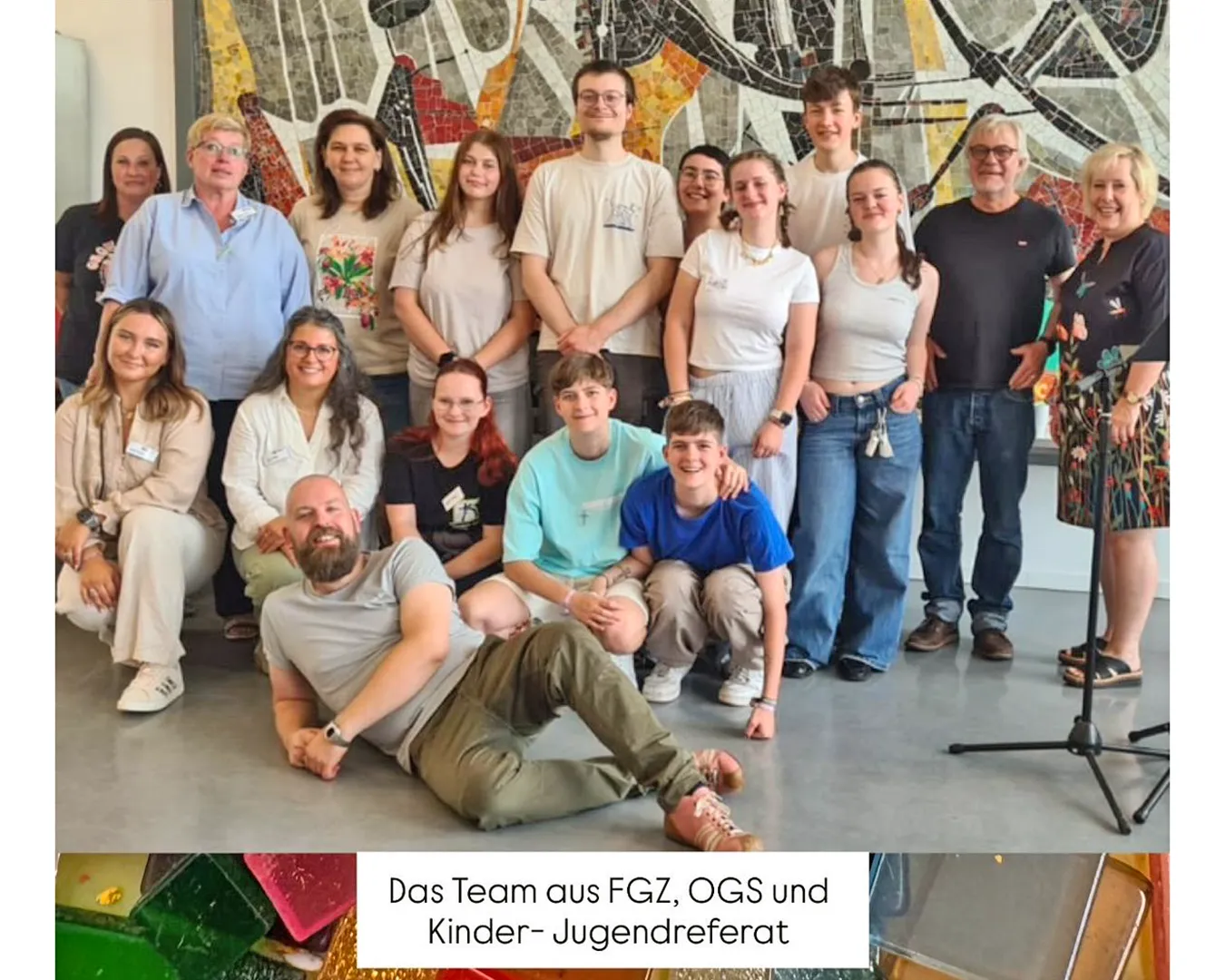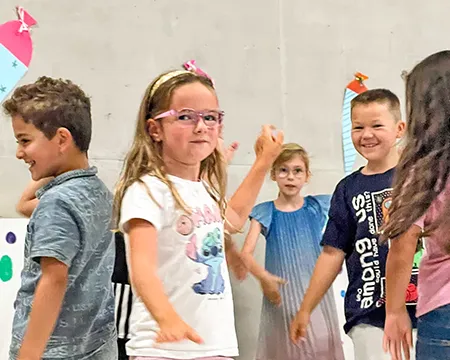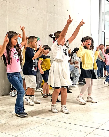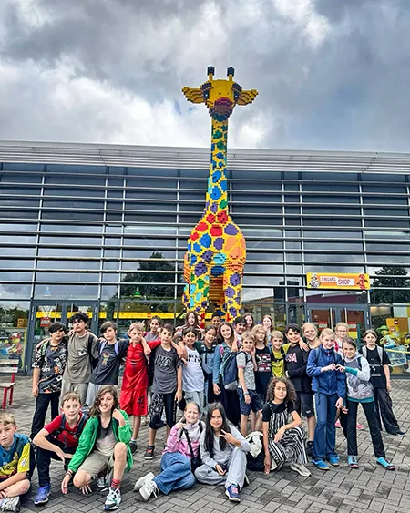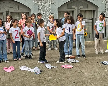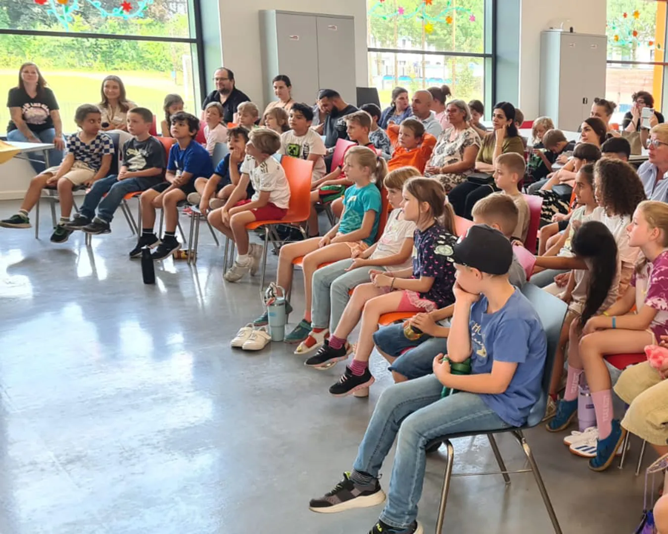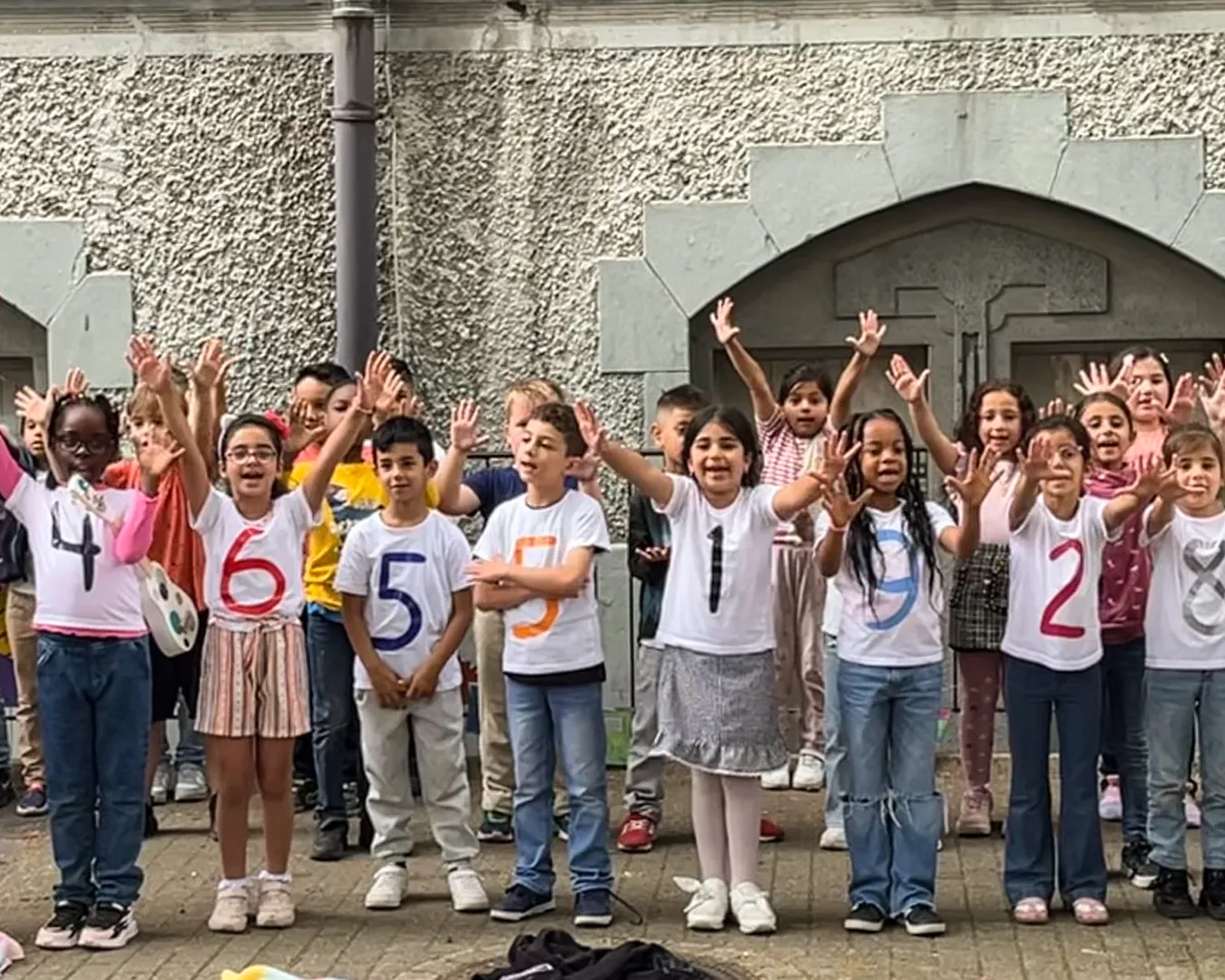 Schülerinnen und Schüler auf dem Schulhof und in der Betreuung nehmen an den Aktivitäten des Day Camps teil. Das erste Bild zeigt die gesamte Gruppe der aktiven Erwachsenen beim Day Camp.