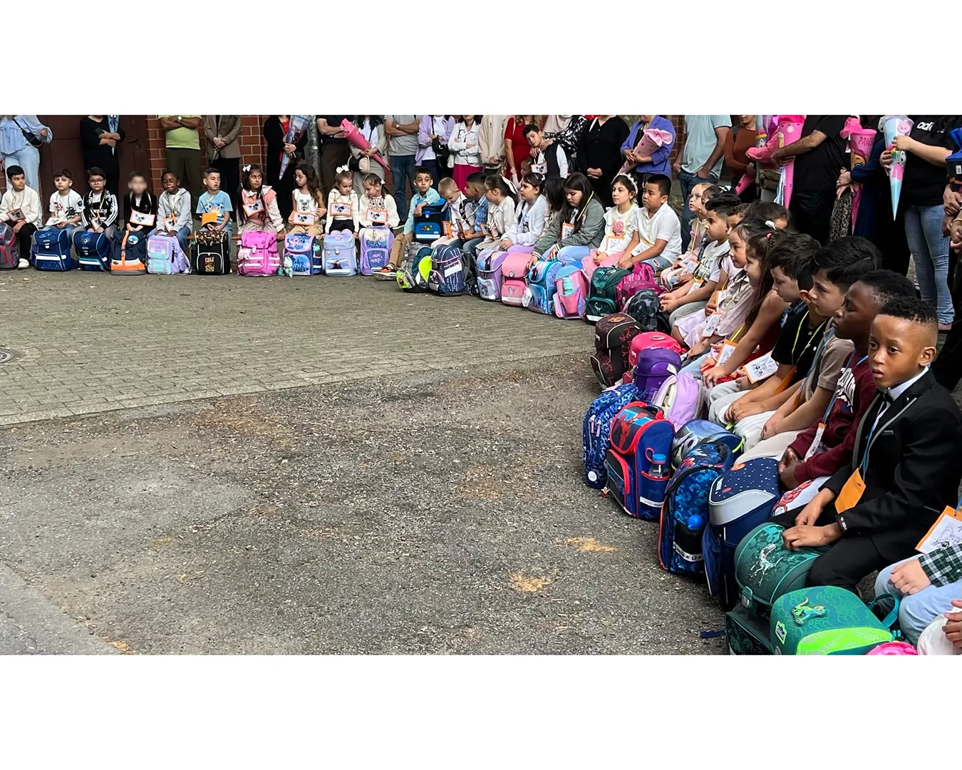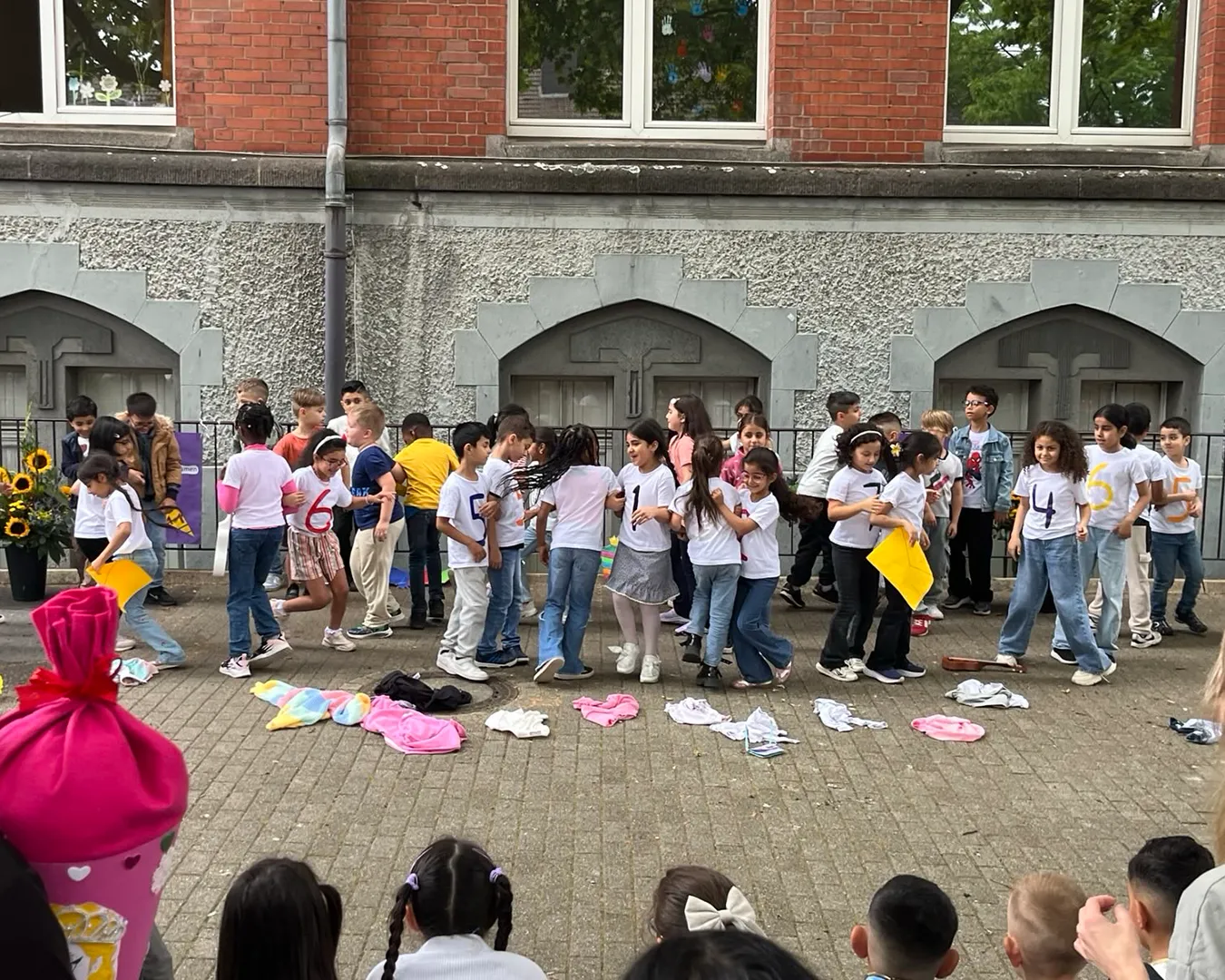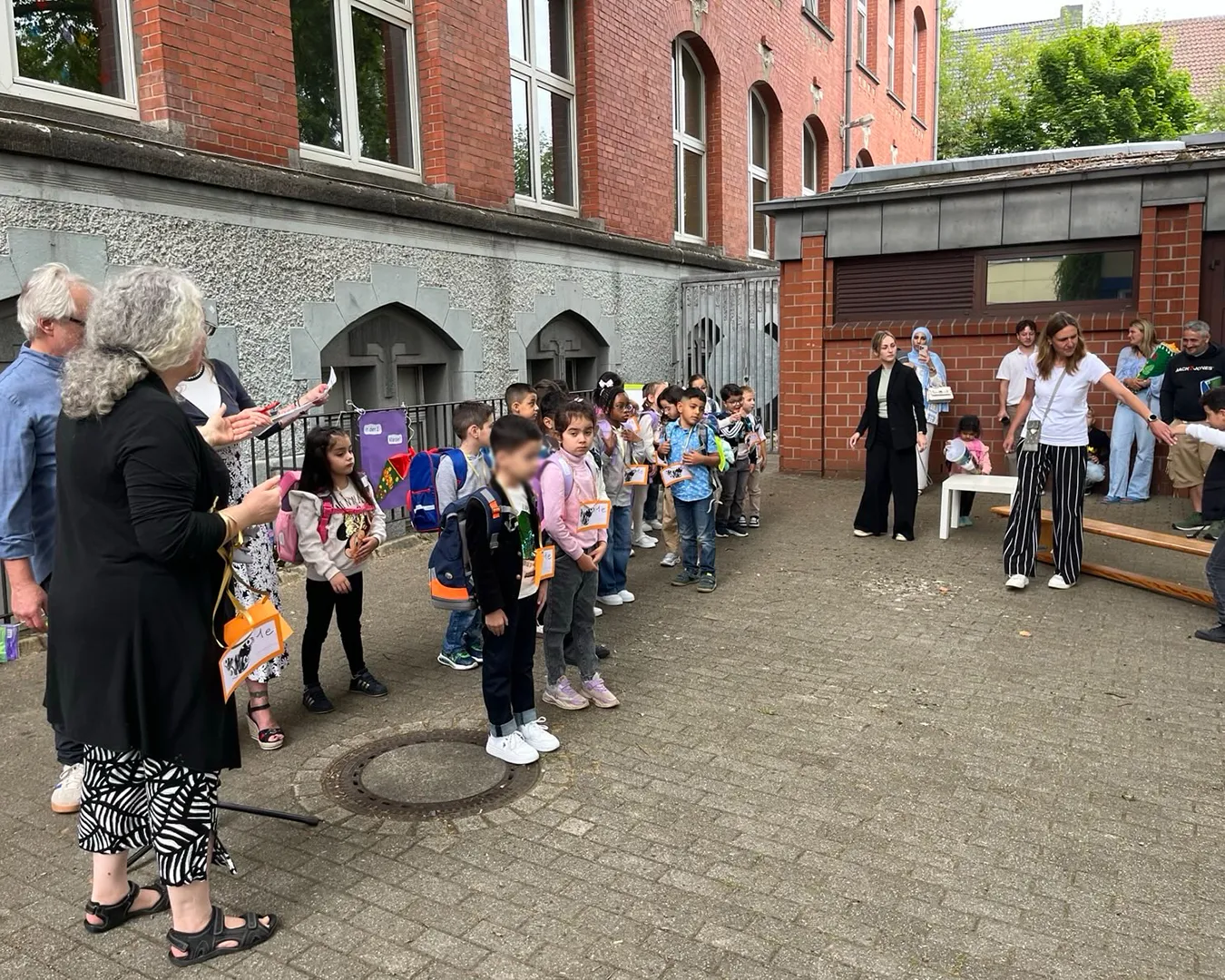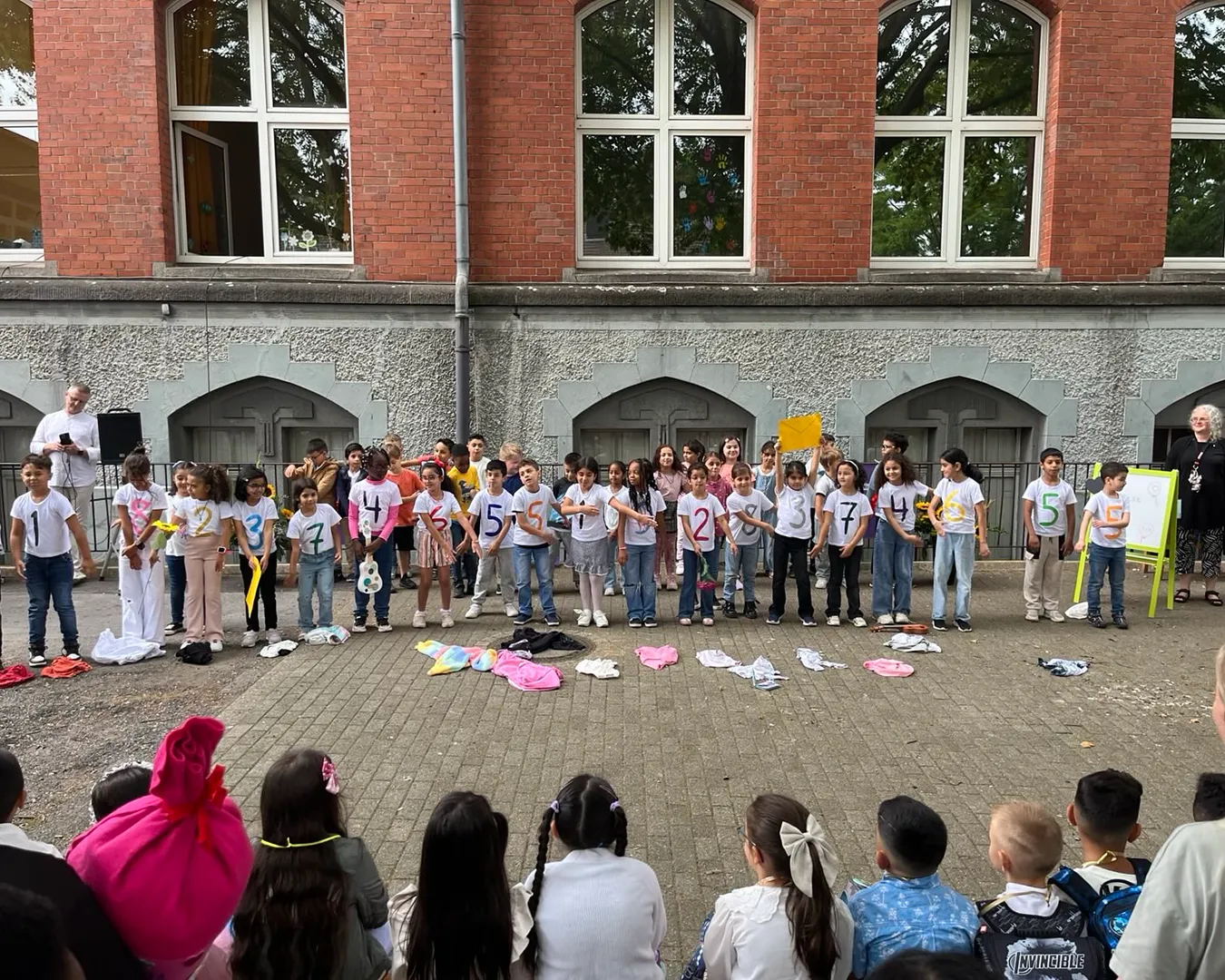 Die Einschulungsfeier fand auf dem Schulhof statt. Die Kinder der zweiten Klasse sangen Lieder und führten ein Stück auf. Kinder gehen mit ihrer Lehrerin in das Schulgebäude.