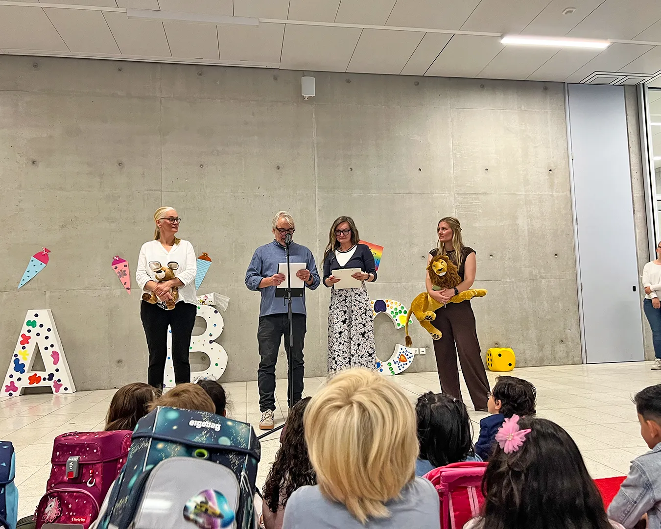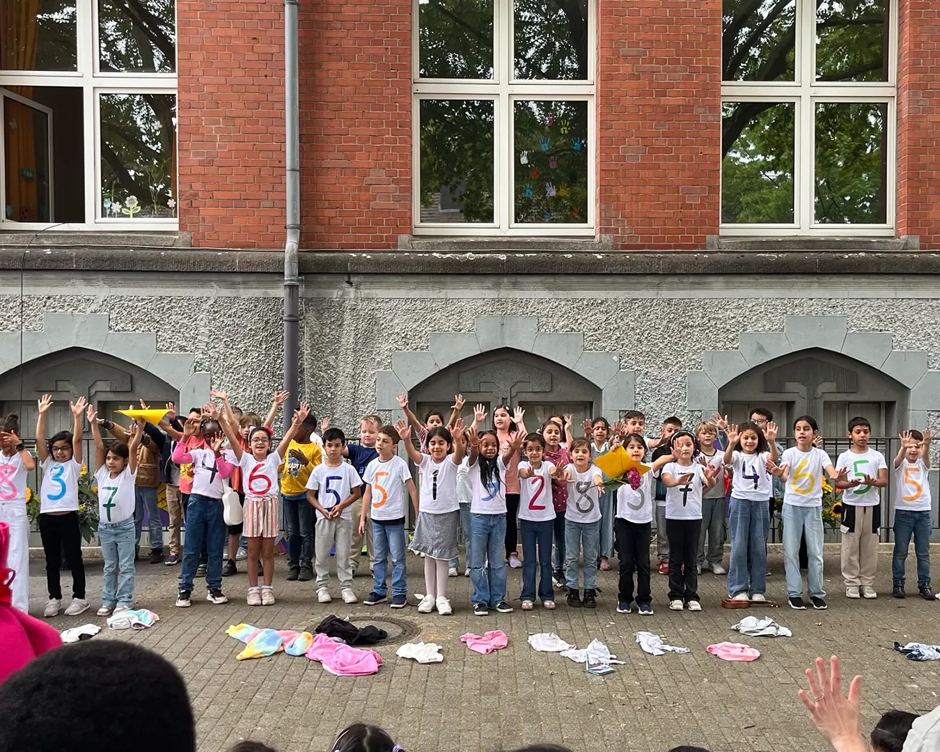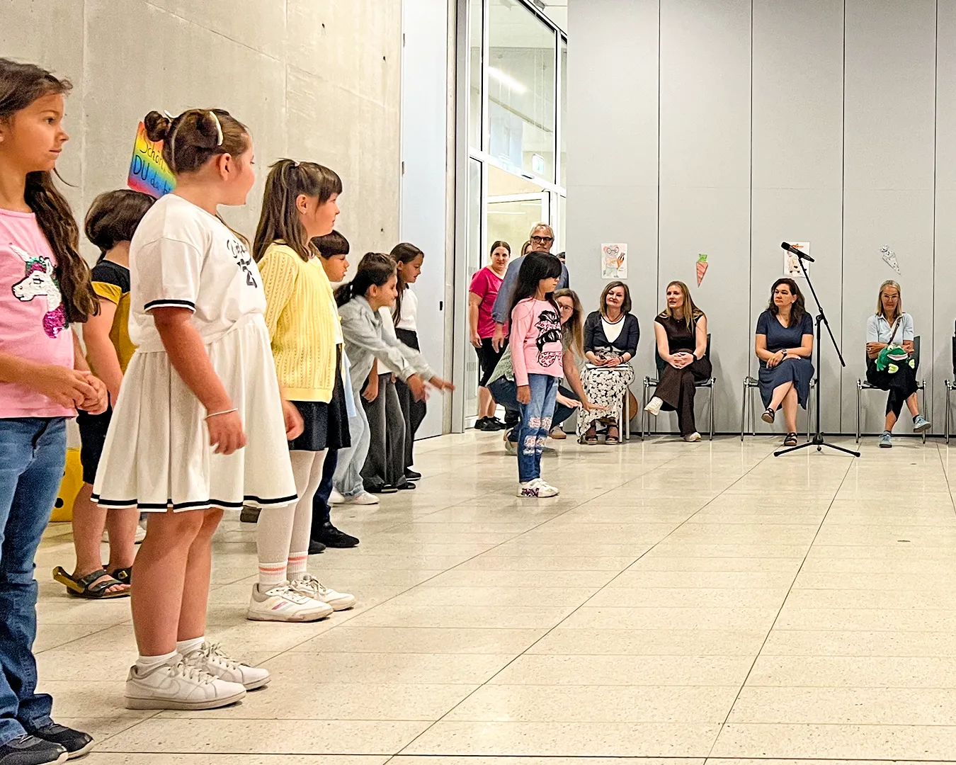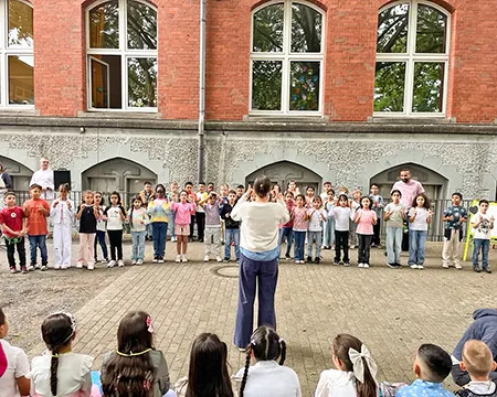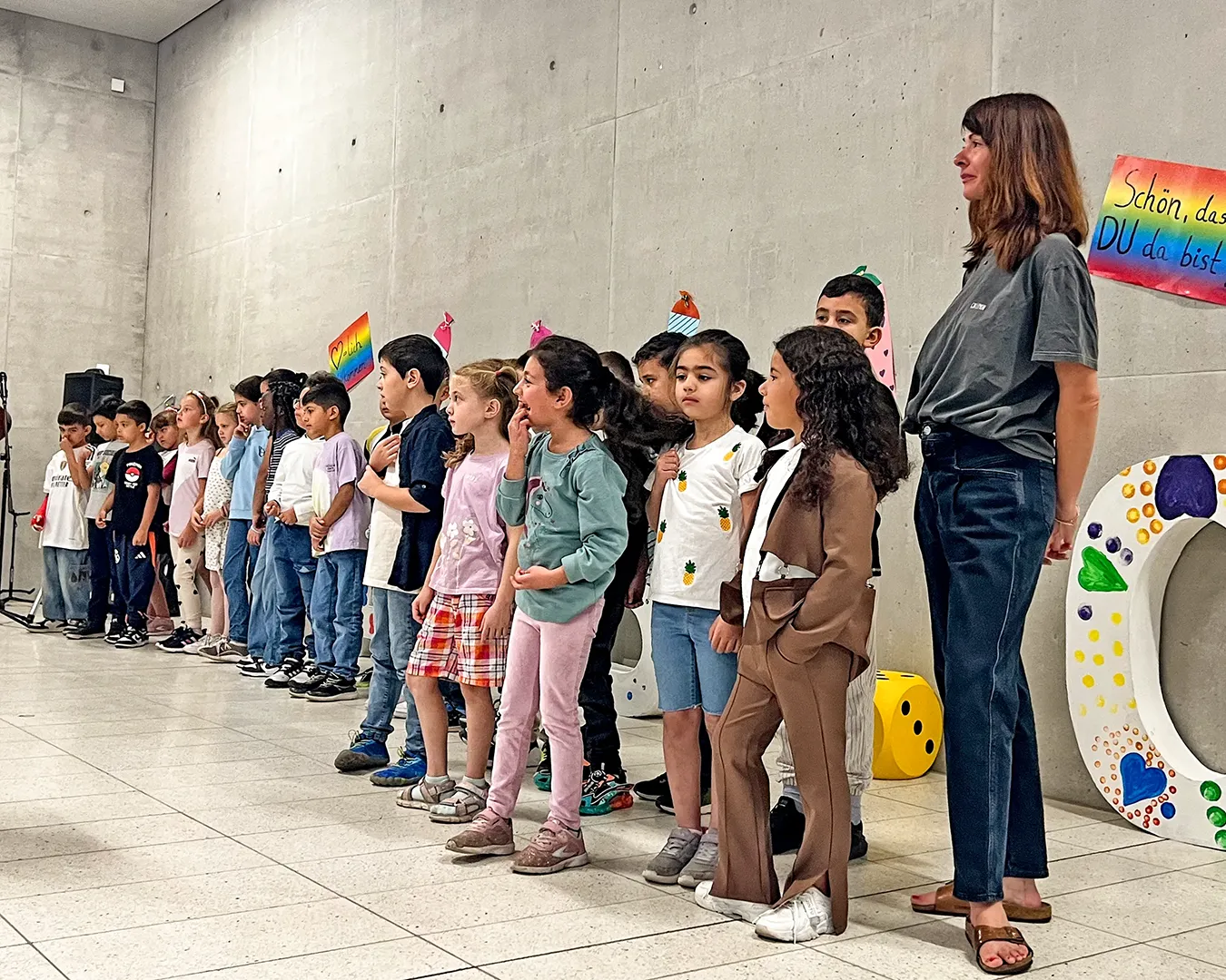 Die Einschulungsfeier fand auf dem Schulhof statt. Die Kinder der zweiten Klasse sangen Lieder und führten ein Stück auf. Kinder gehen mit ihrer Lehrerin in das Schulgebäude.