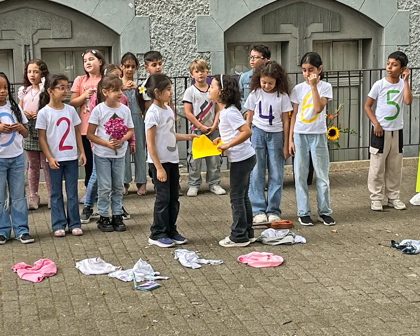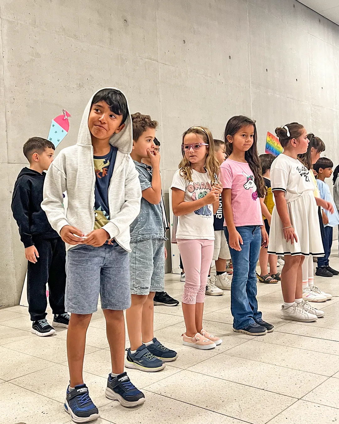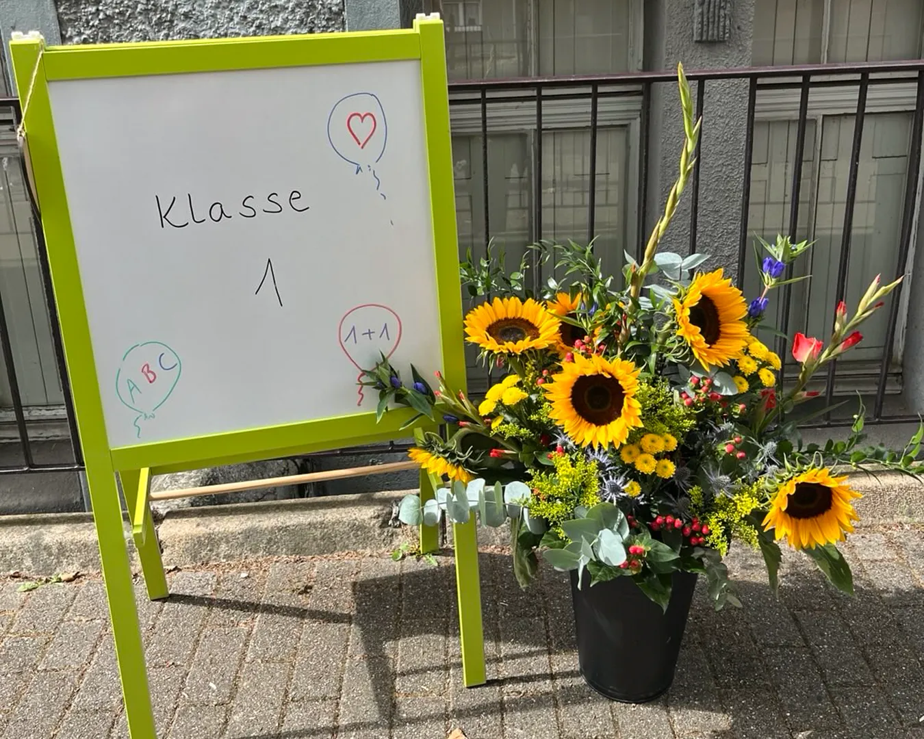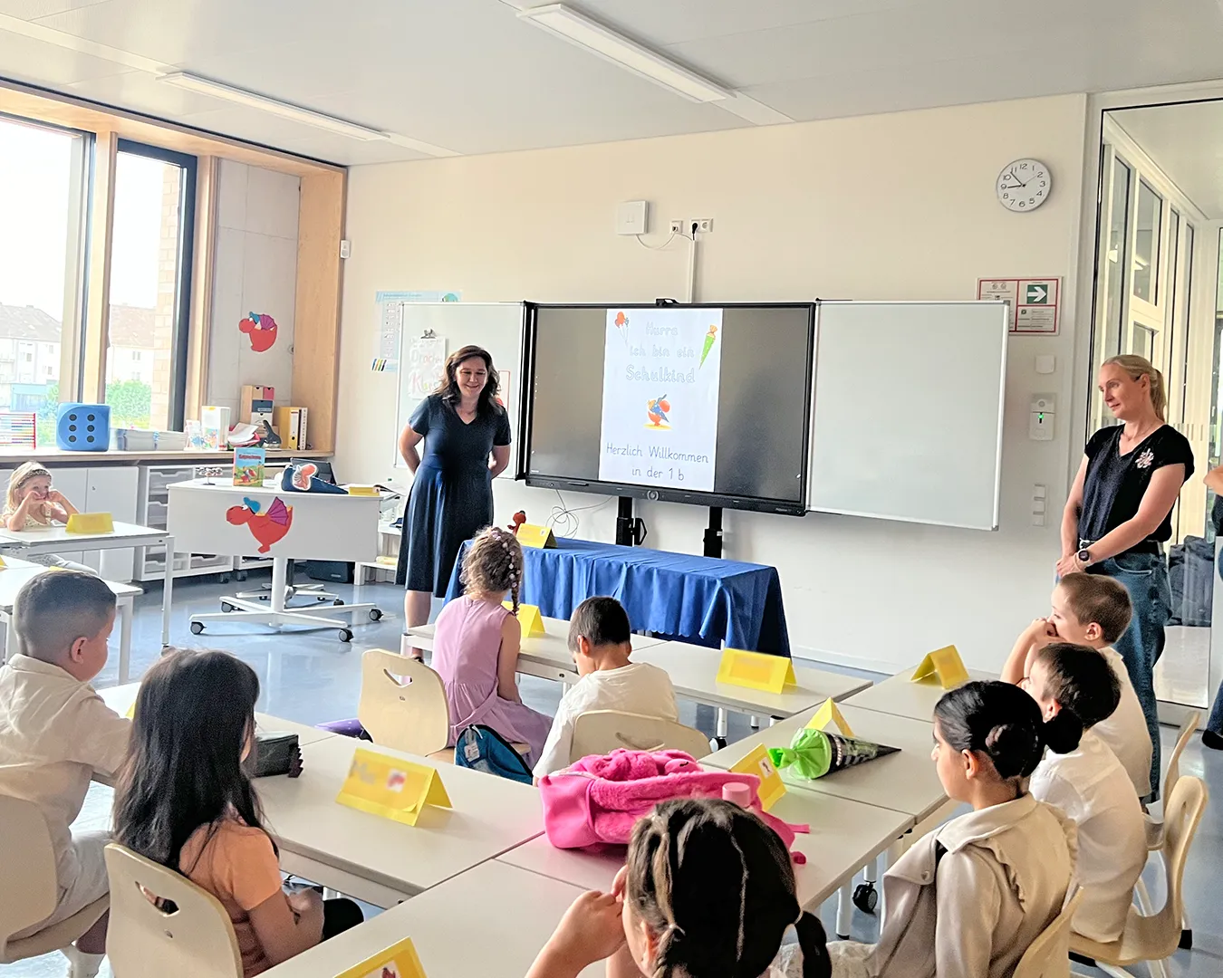 Die Einschulungsfeier fand auf dem Schulhof statt. Die Kinder der zweiten Klasse sangen Lieder und führten ein Stück auf. Kinder gehen mit ihrer Lehrerin in das Schulgebäude.