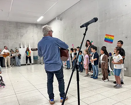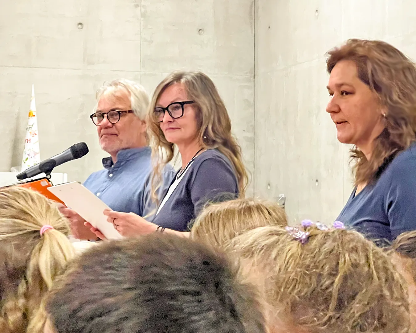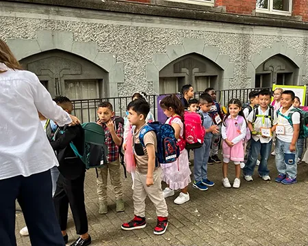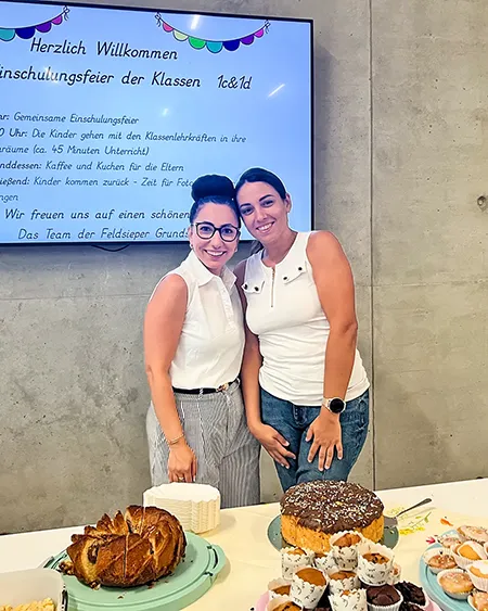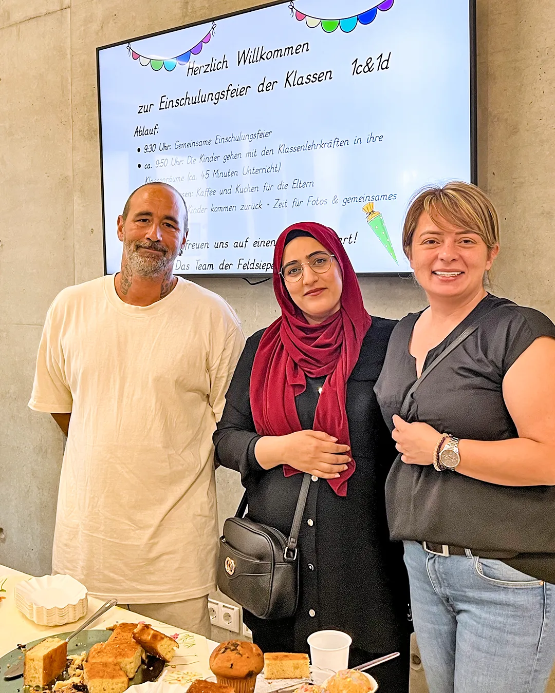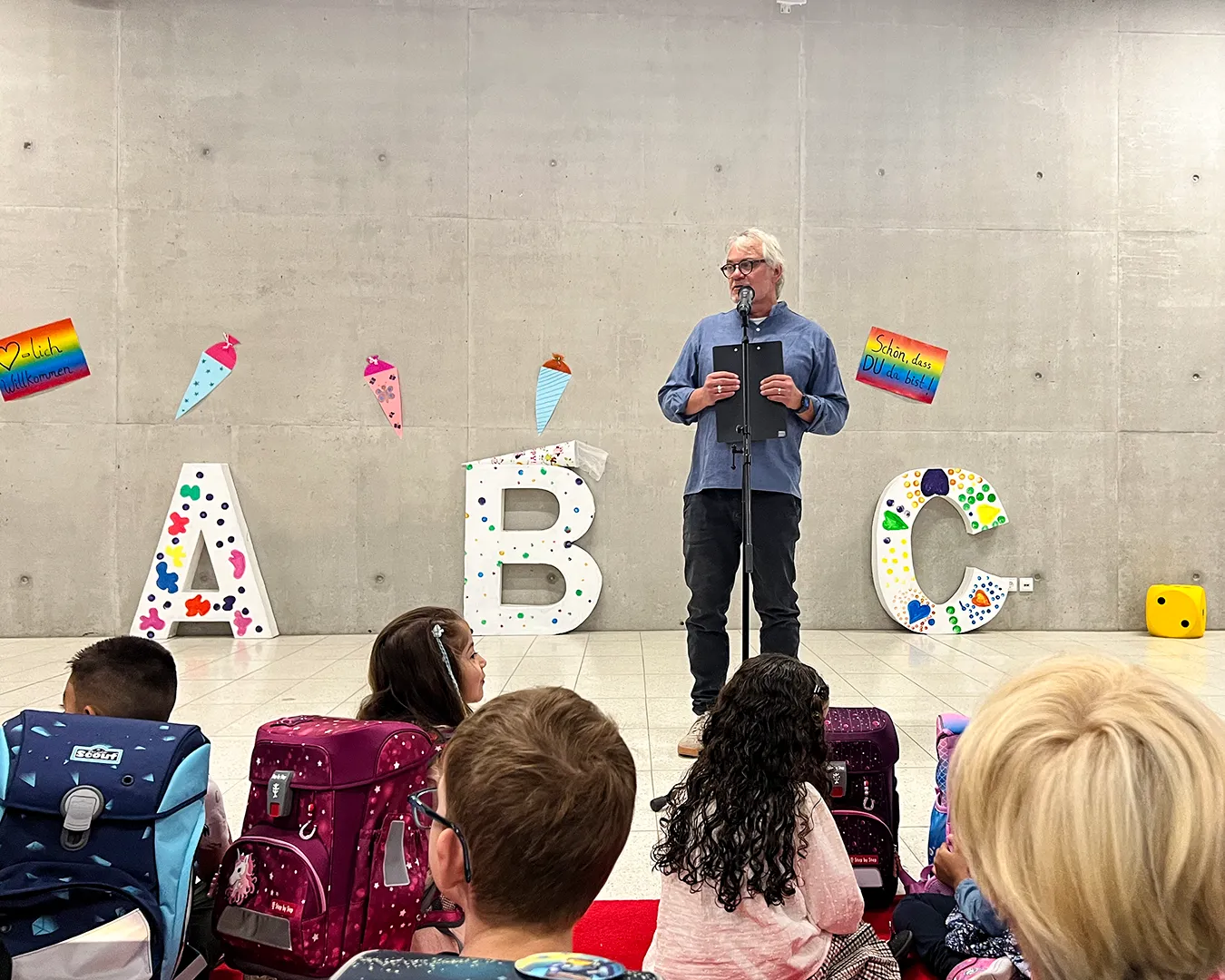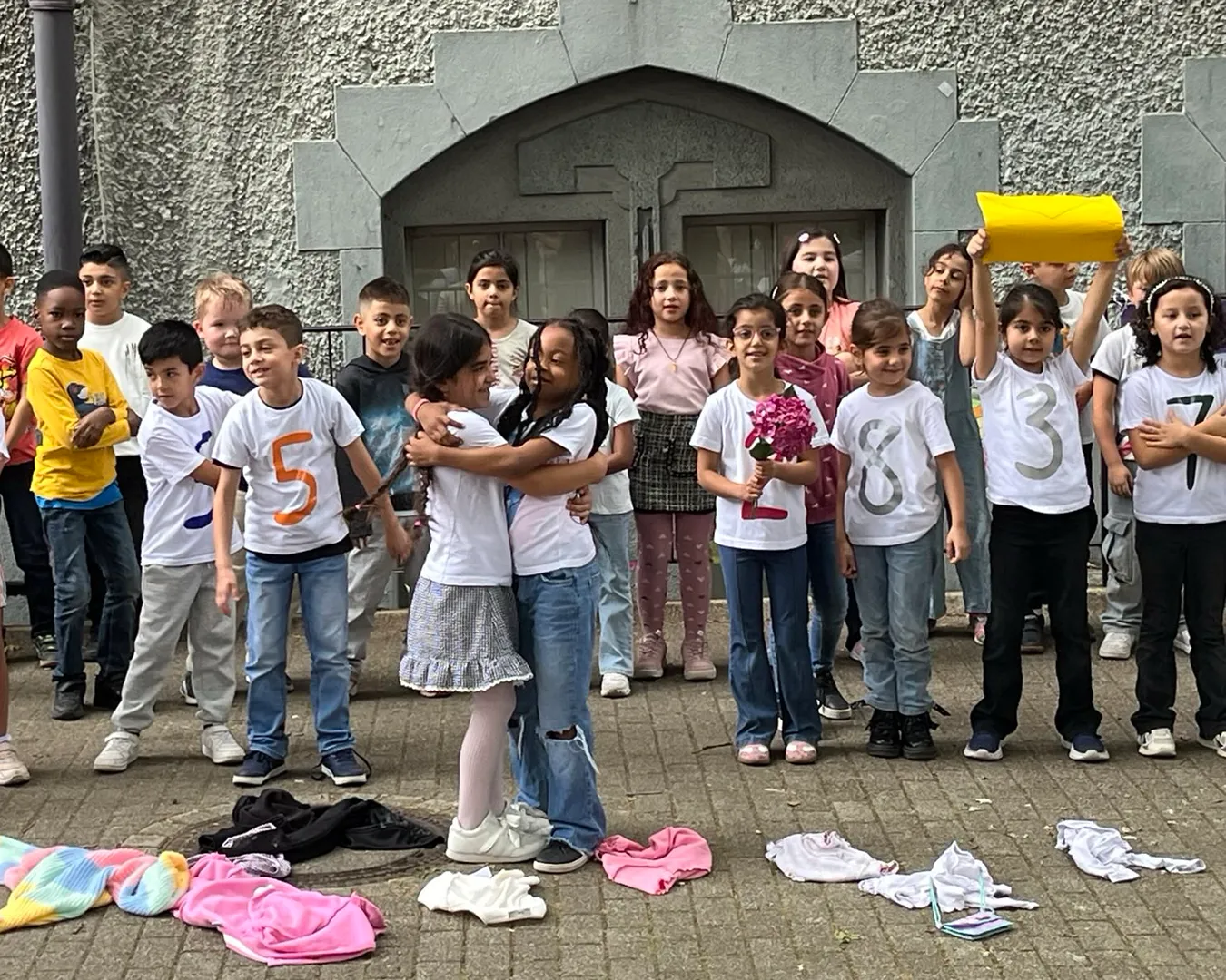 Die Einschulungsfeier fand auf dem Schulhof statt. Die Kinder der zweiten Klasse sangen Lieder und führten ein Stück auf. Kinder gehen mit ihrer Lehrerin in das Schulgebäude.