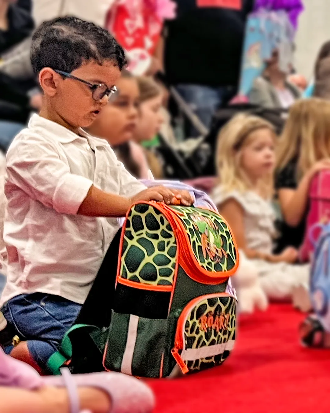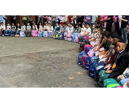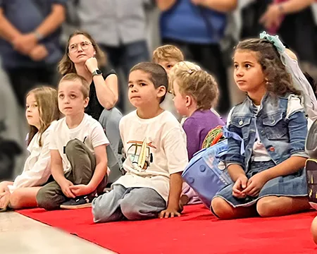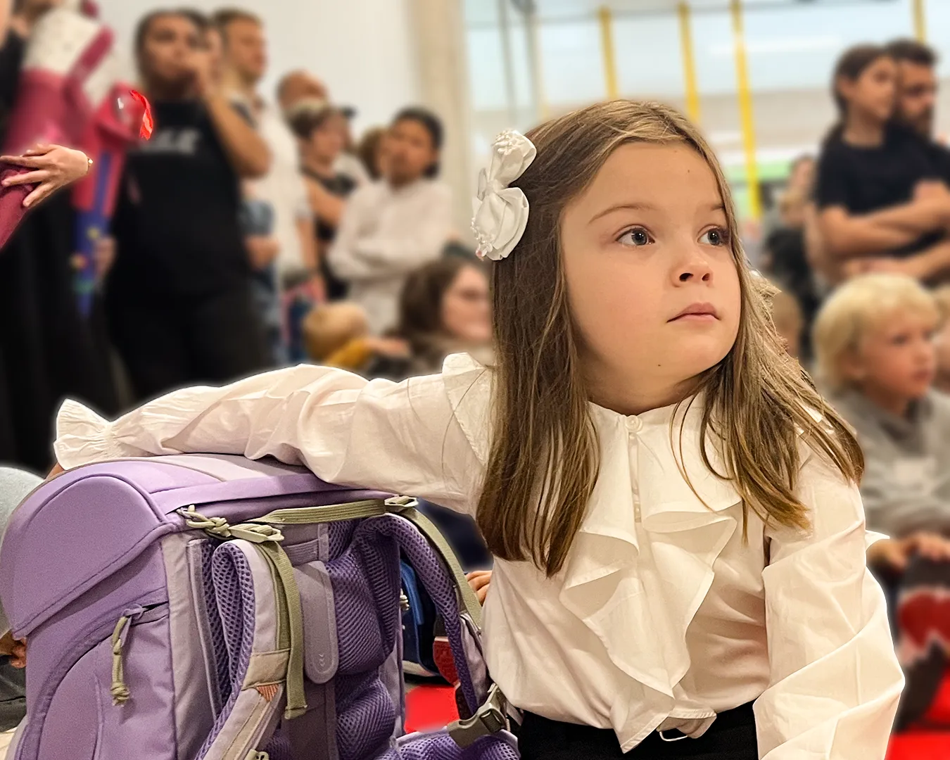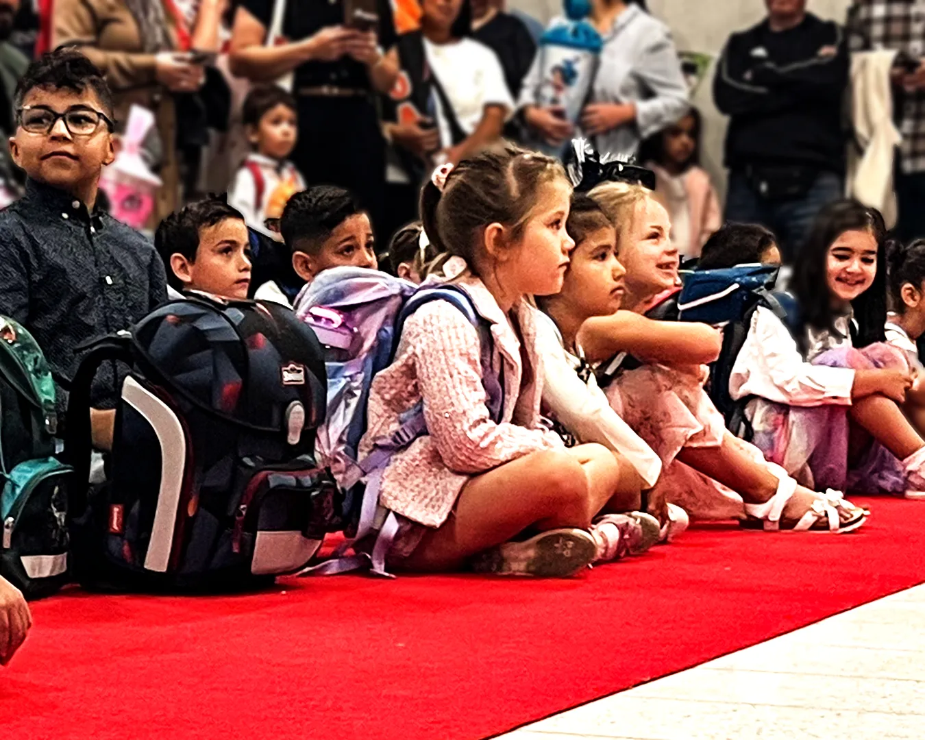 Erstklässlerinnen und Erstklässler sitzen mit ihren Schultaschen auf dem roten Teppich in der Aula an der Feldsieper Str. Hinter ihnen stehen die Erwachsenen und verfolgen die Veranstaltung. Der Schulleiter begrüßt die Erstklässler. Danach sieht man die Kinder in den Klassen bei ihrer ersten Unterrichtsstunde.