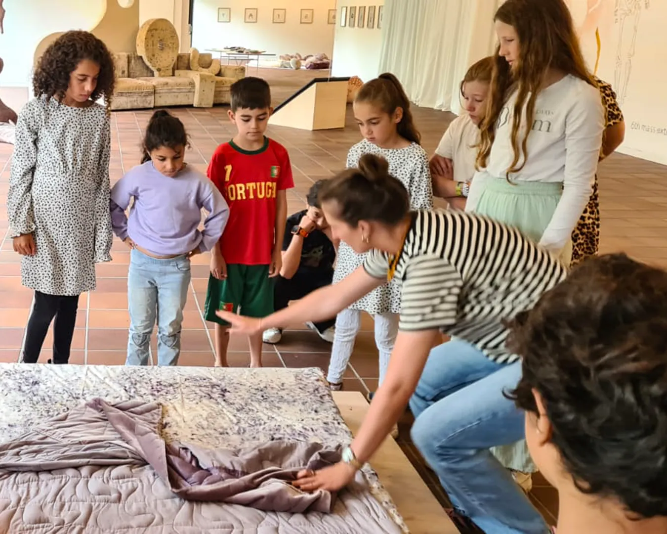 Kleine Figuren aus Kastanien und Eicheln und weiteren Naturmaterialien, teilweise präsentiert von den Schüler:innen