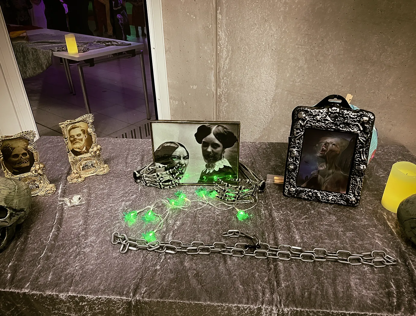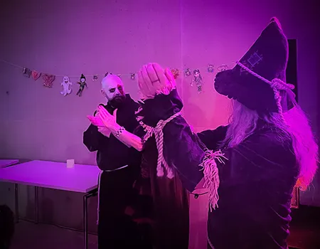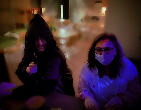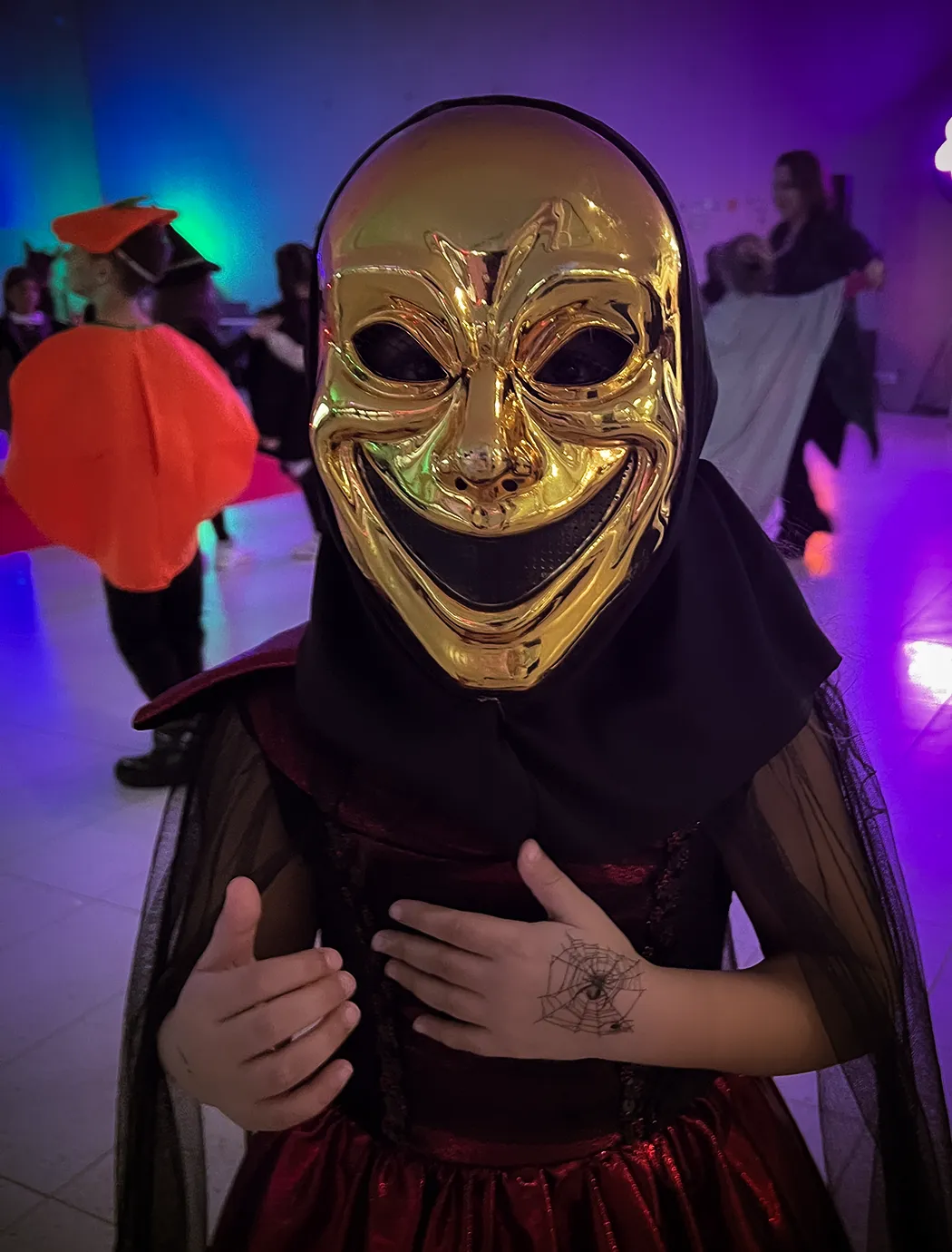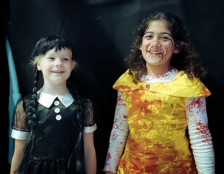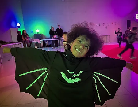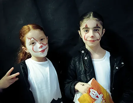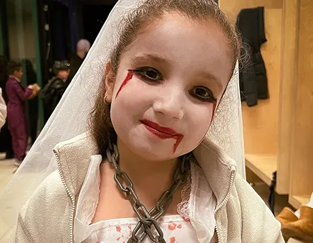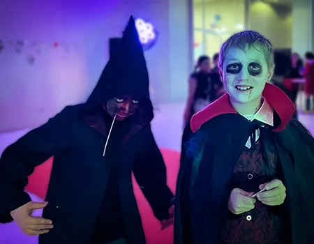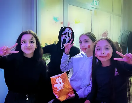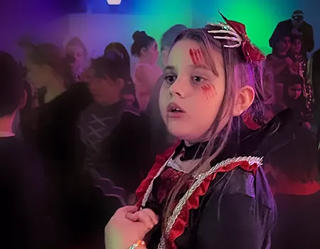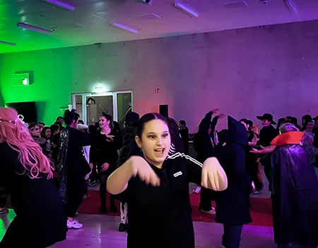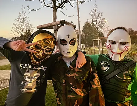 Kinder und Erwachsene in Halloweenkostümen tanzen in der Aula, laufen über den Schulhof, präsentieren ihre meist recht gruseligen Kostüme, essen Zuckerwatte oder Popcorn und reden in Gruppen miteinander.