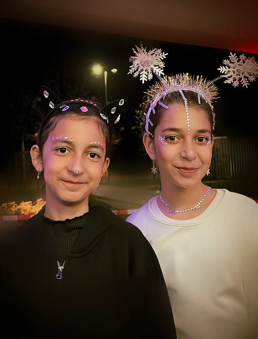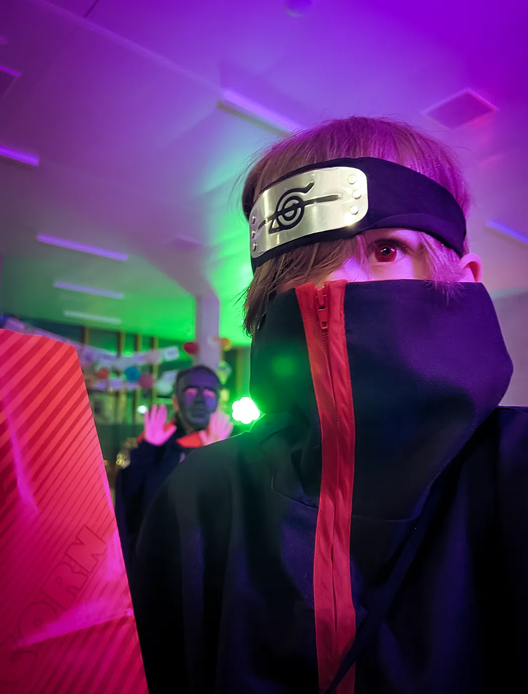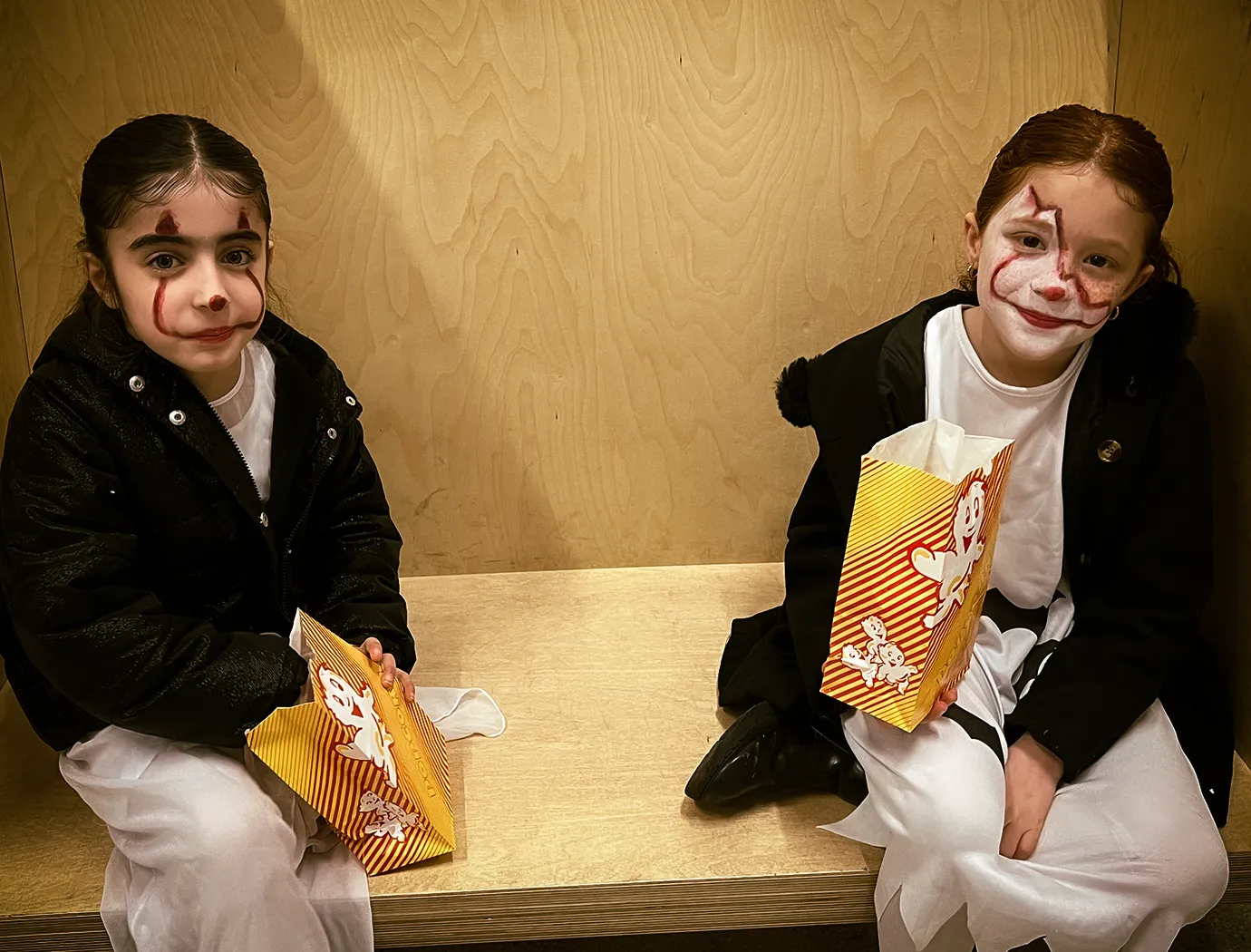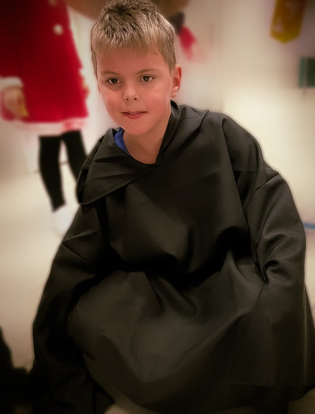 Kinder und Erwachsene in Halloweenkostümen tanzen in der Aula, laufen über den Schulhof, präsentieren ihre meist recht gruseligen Kostüme, essen Zuckerwatte oder Popcorn und reden in Gruppen miteinander.